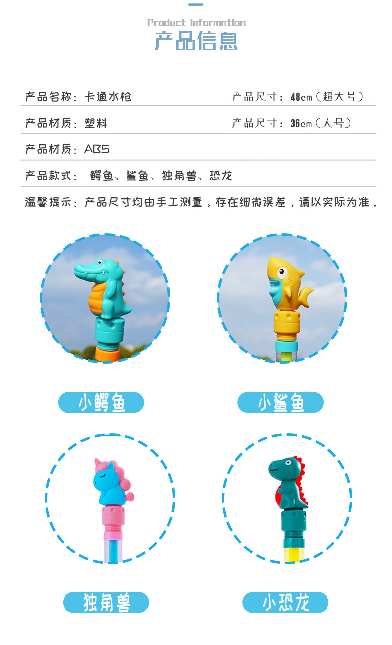 | Colores | Pistola de agua de extracción [estilo grande al azar],Pistola de agua de extracción [estilo pequeño al azar],Pistola de agua [gran dinosaurio],Pistola de agua [gran unicornio],Pistola de agua [cocodrilo grande],Pistola de agua [Tiburón grande],Pistola de agua [pequeño-dinosaurio],Pistola de agua [trompeta-unicornio],Pistola de agua [pequeño cocodrilo],Pistola de agua [Tiburón pequeño] |