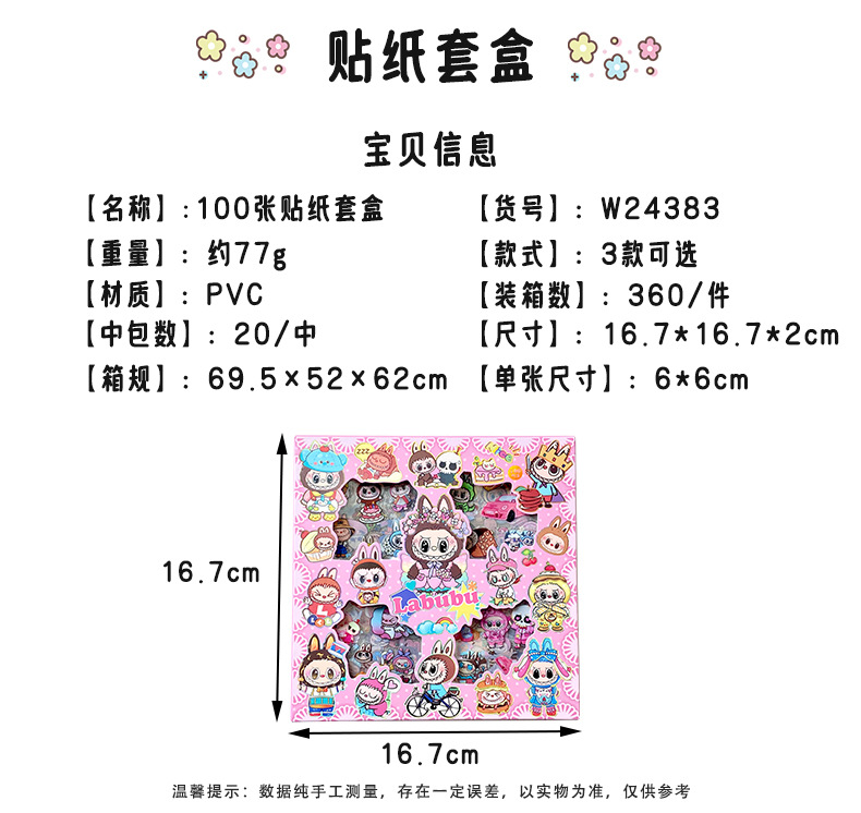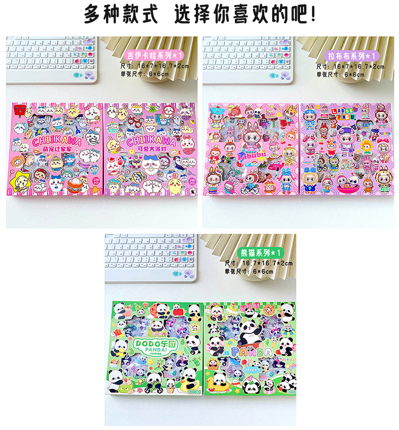 | Especificaciones | Nuevas pegatinas de dibujos animados [múltiples al azar], nuevas pegatinas de dibujos animados [categoría panda], nuevas pegatinas de dibujos animados [categoría rabb], nuevas pegatinas de dibujos animados [categoría jiyi kawa] |