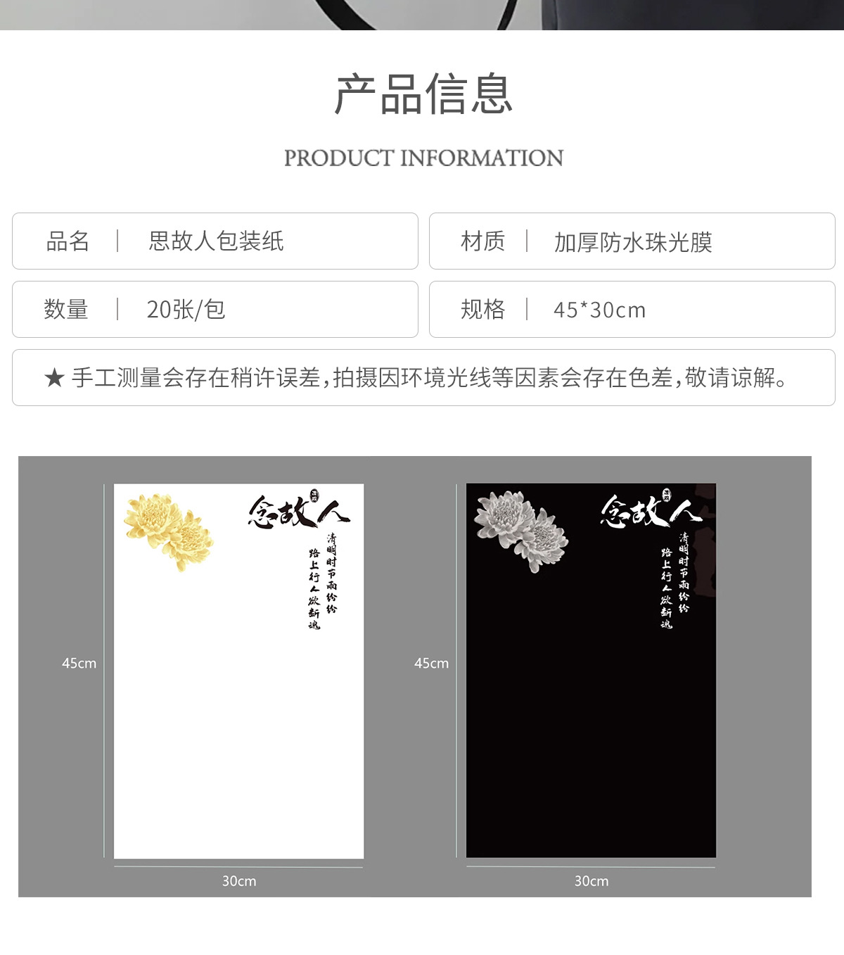 | Especificaciones y modelos | Pensando en el viejo amigo [blanco] impermeable; 20 hojas de 30 * 45cm, pensando en el viejo amigo [negro] impermeable; 20 hojas 30 * 45cm |
