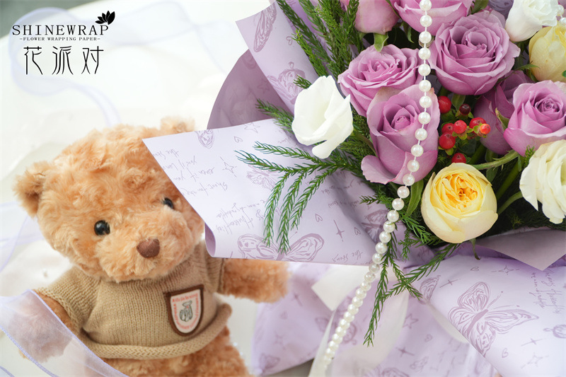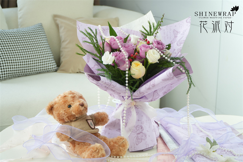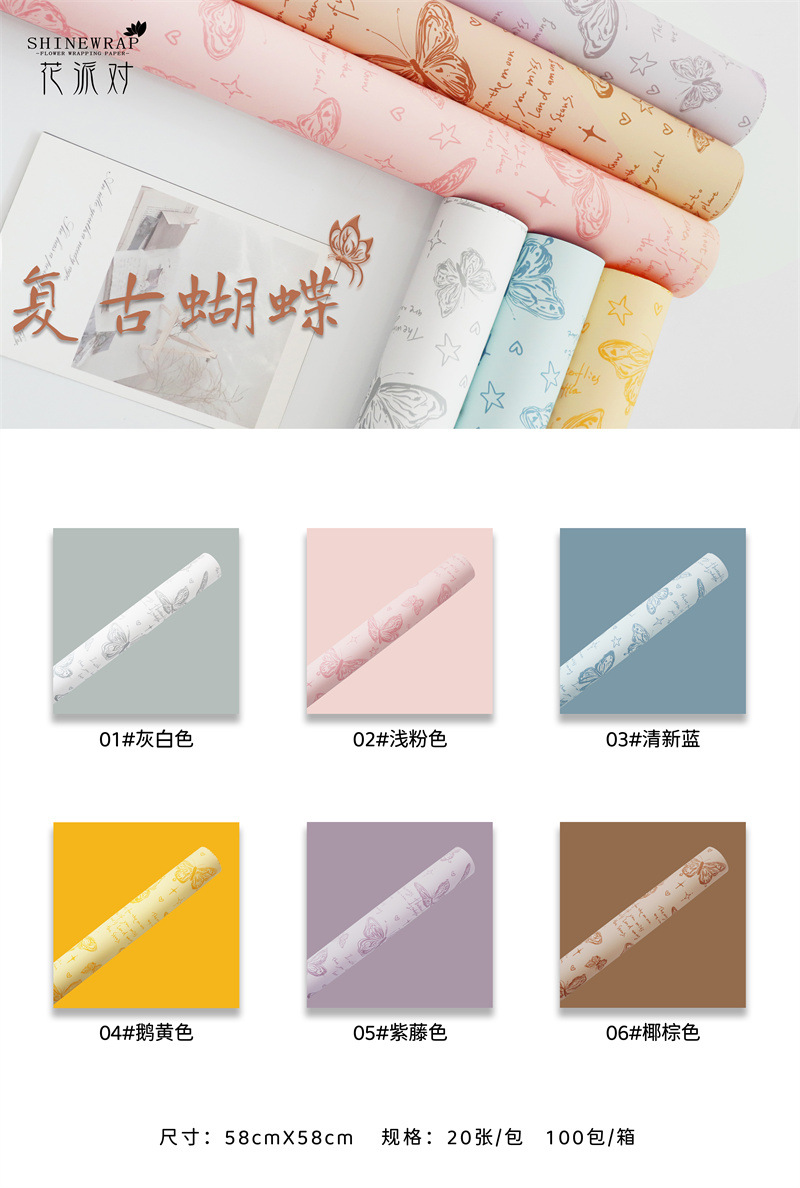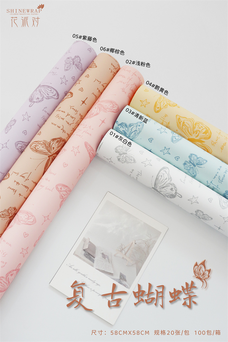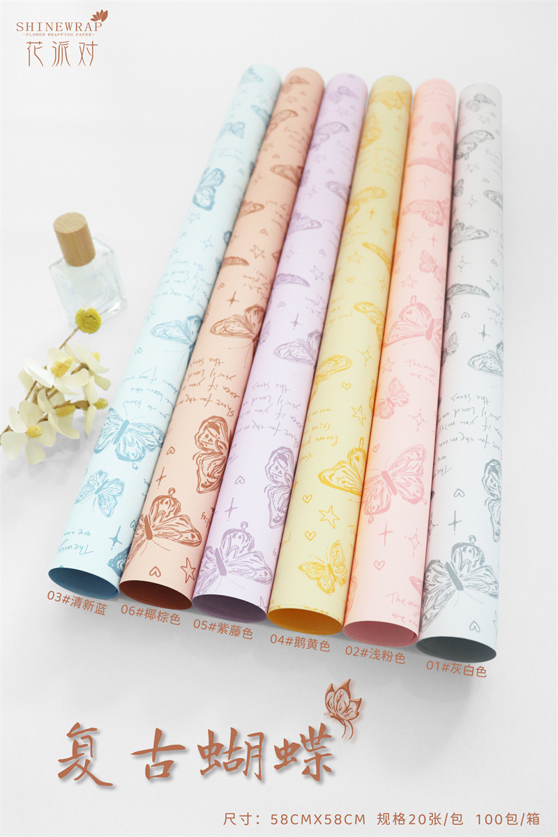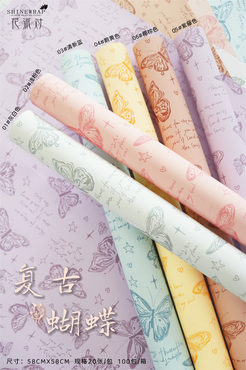 Fabricante de fiestas de flores al por mayor nuevo producto estampado de mariposas papel de embalaje de flores floristería transfronteriza paquete de ramo paquete de papel papel de flores