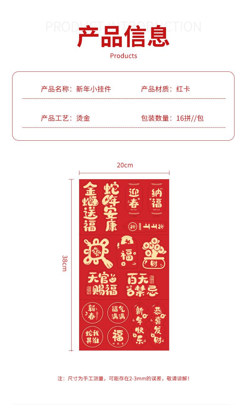 | Tamaño | Feliz año nuevo (26 hojas pequeñas para enviar cuerdas), jixiang Ruyi (28 hojas pequeñas para enviar cuerdas), Rich (16 hojas pequeñas para enviar cuerdas), buena suerte ilimitada (16 hojas pequeñas para enviar cuerdas), al vapor (16 hojas pequeñas para enviar cuerdas), cosas buenas a la vuelta de la esquina (16 hojas pequeñas para enviar cuerdas), 3,5 cm de linternas de terciopelo [15], 3,5 cm de linternas de terciopelo [30], tarjetas de dibujos animados de año nuevo [5 / paquete], tarjetas de buena suerte y juventud de invierno [2 / paquete] |