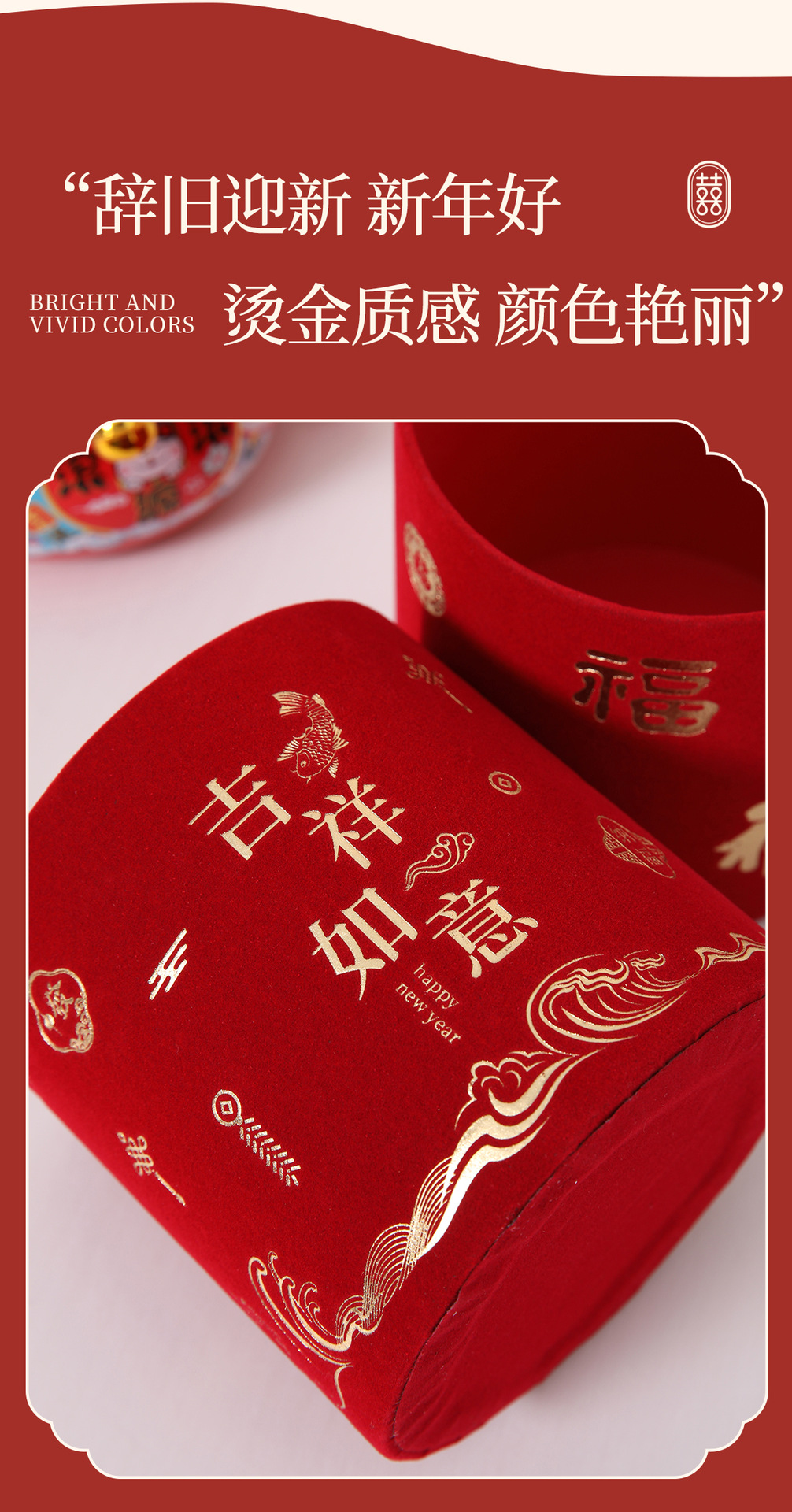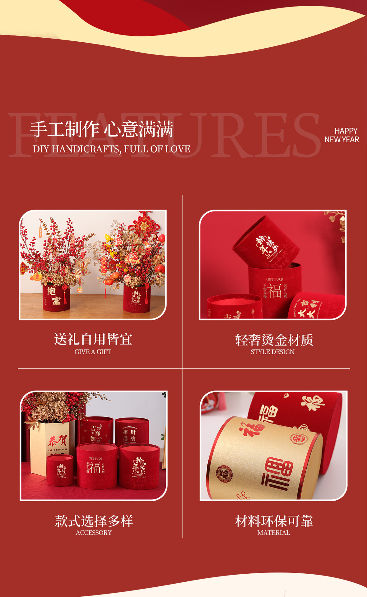 Barril de bendición de Año Nuevo al por mayor barril de abrazo rojo estampado redondo barril de flores barril vacío barril de hivernace material de arreglos de flores