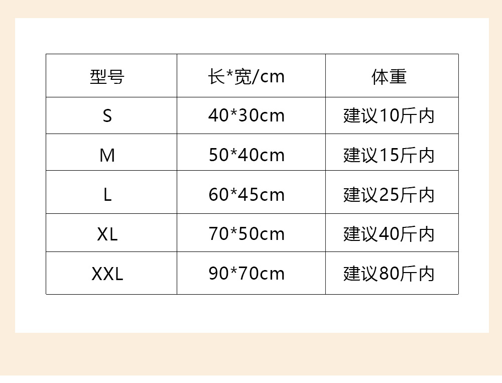 50 * 40cm (recomendado dentro de 15 kg)
