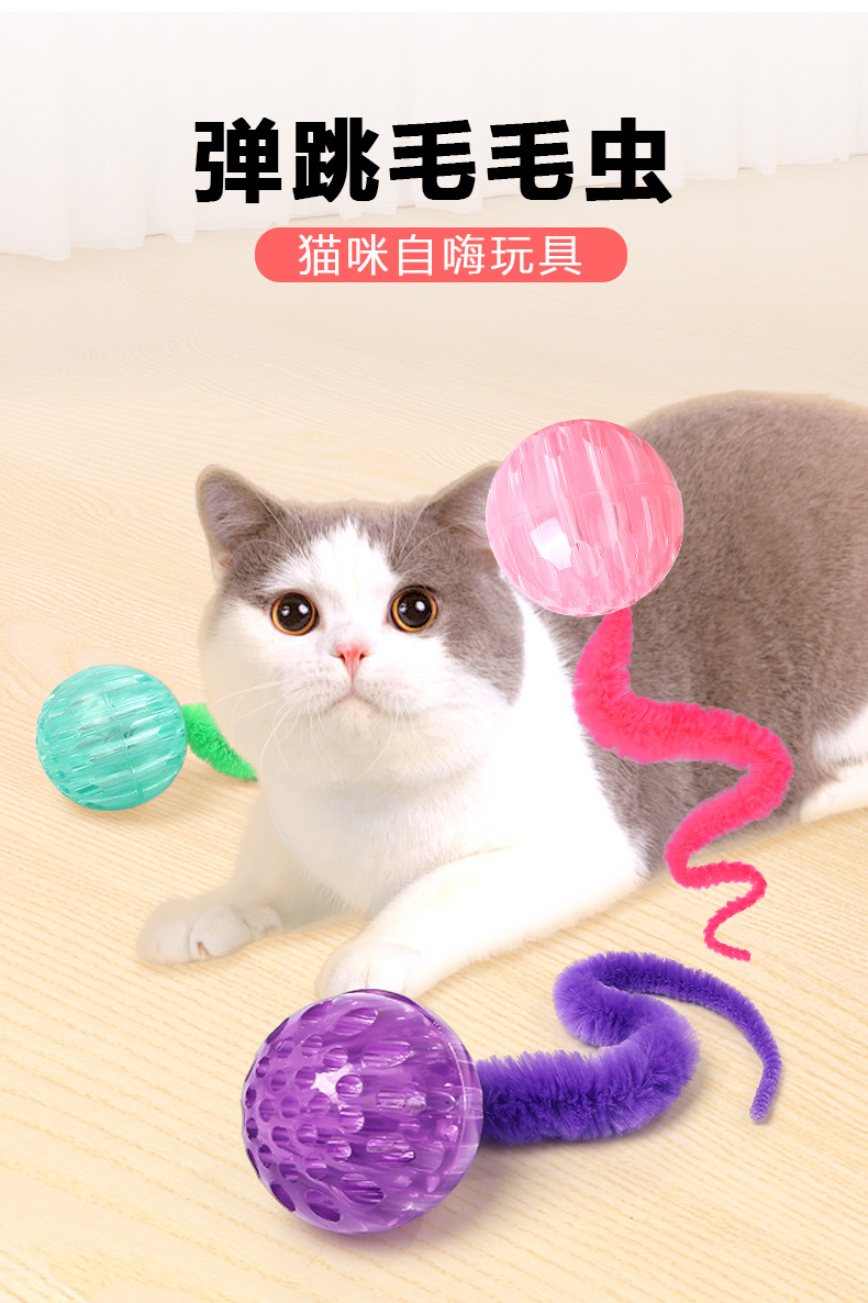 Gato rebotando oruga bola de mascota que muerde sin romperse