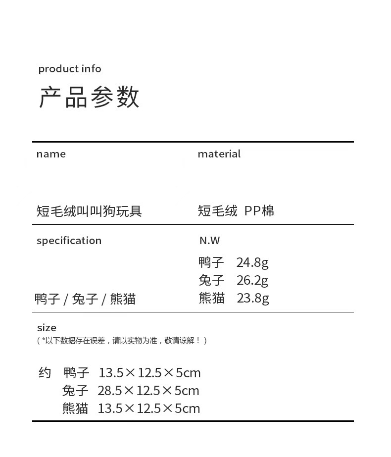 | Color | Juguetes para mascotas - conejos, juguetes para mascotas - pandas, juguetes para mascotas - Patos |