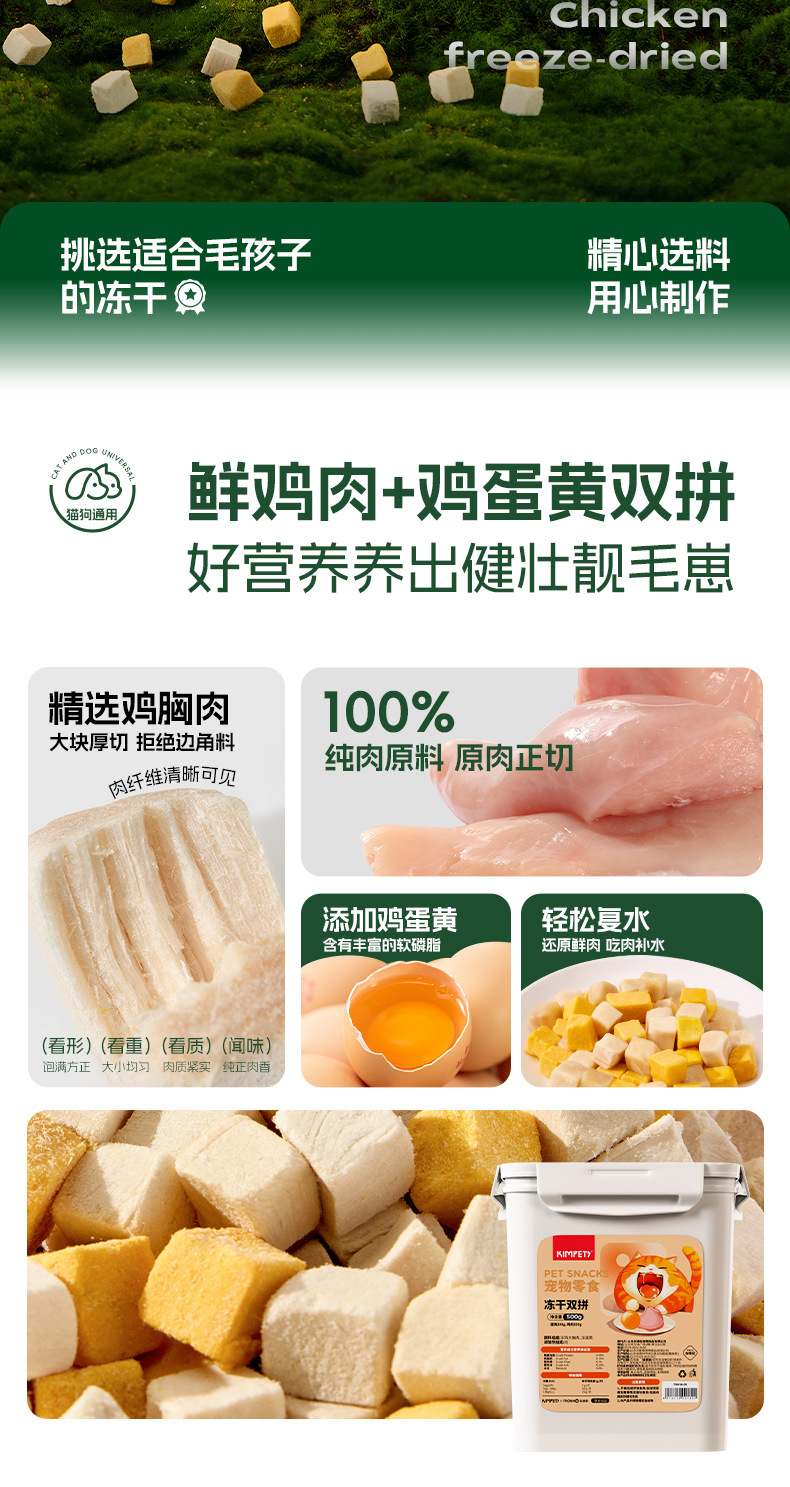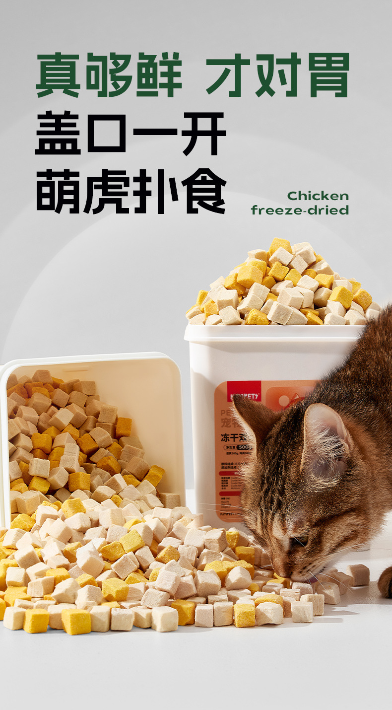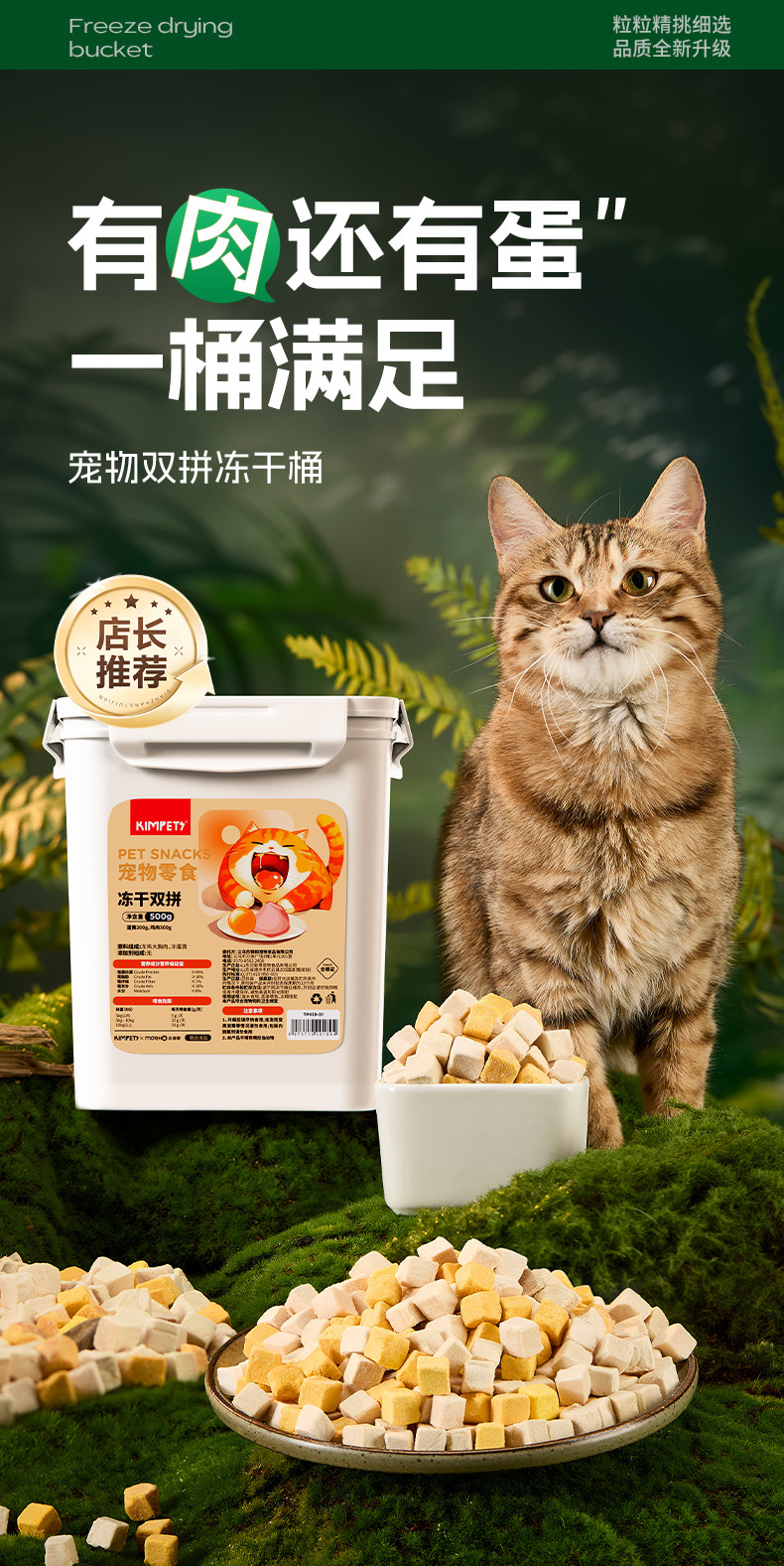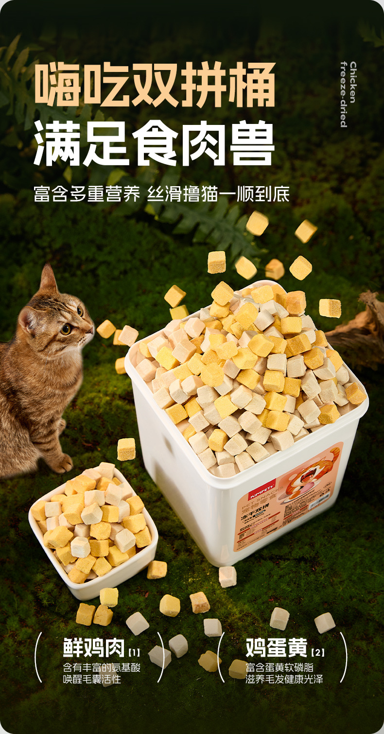 Nuevo pollo liofilizado de alta calidad, cubitos de pollo, yema de huevo, cubo familiar de doble pelea, bocadillos para gatos jóvenes 500g/barril