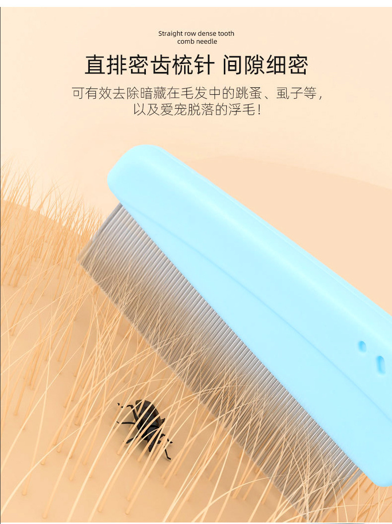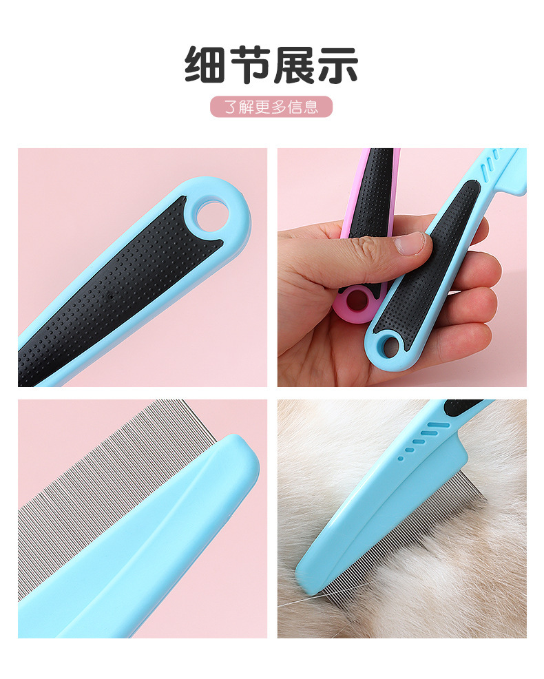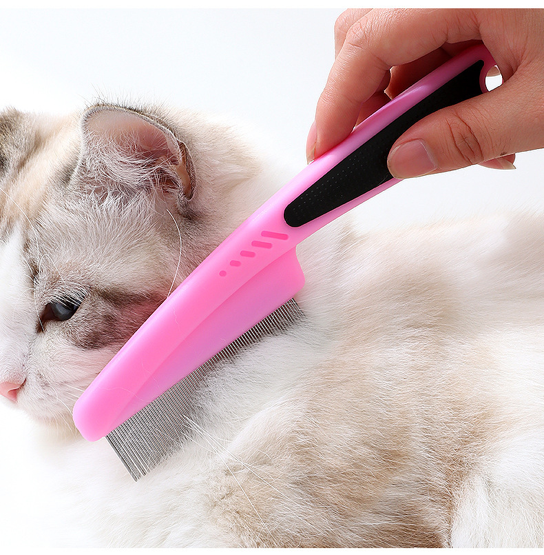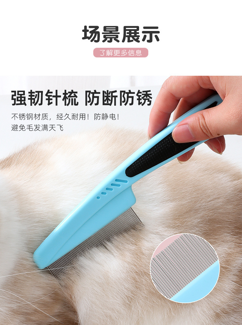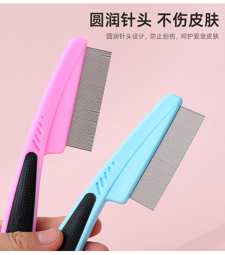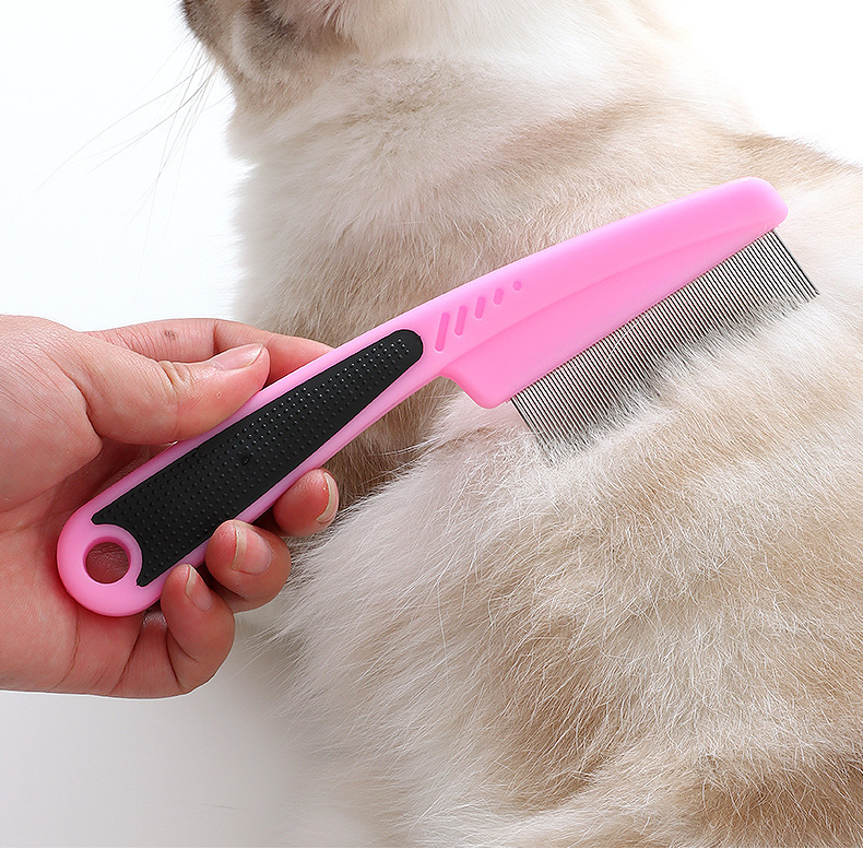 Nuevo producto mango antideslizante peine de pulgas cepillo de acero inoxidable peine de aguja de dientes densos peine de pelo flotante para perros peine para mascotas al por mayor