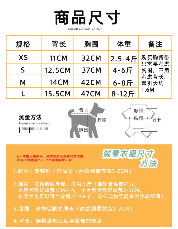 | Especificación (longitud * anchura) | XS (circunferencia de pecho cm peso recomendado 1,25 kg-2,00 kg,S (circunferencia del pecho 37cm peso recomendado 2,00 kg-3,00 kg,M (circunferencia del pecho 42cm peso recomendado 3,00 kg-4,00 kg,L (circunferencia del pecho 47cm peso recomendado 4,00 kg-6,00 kg |