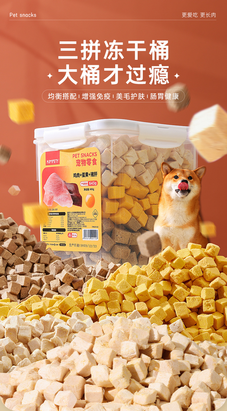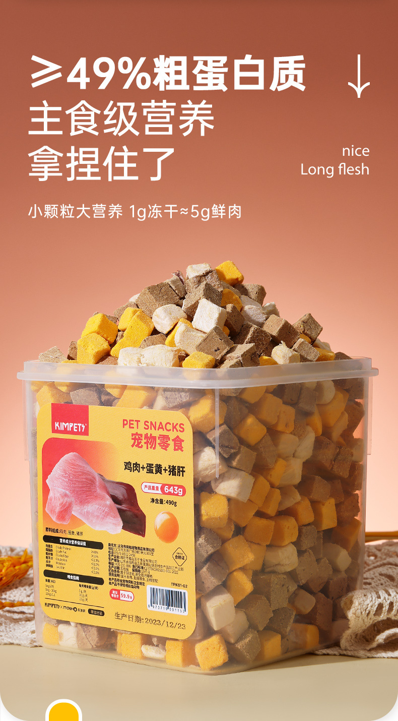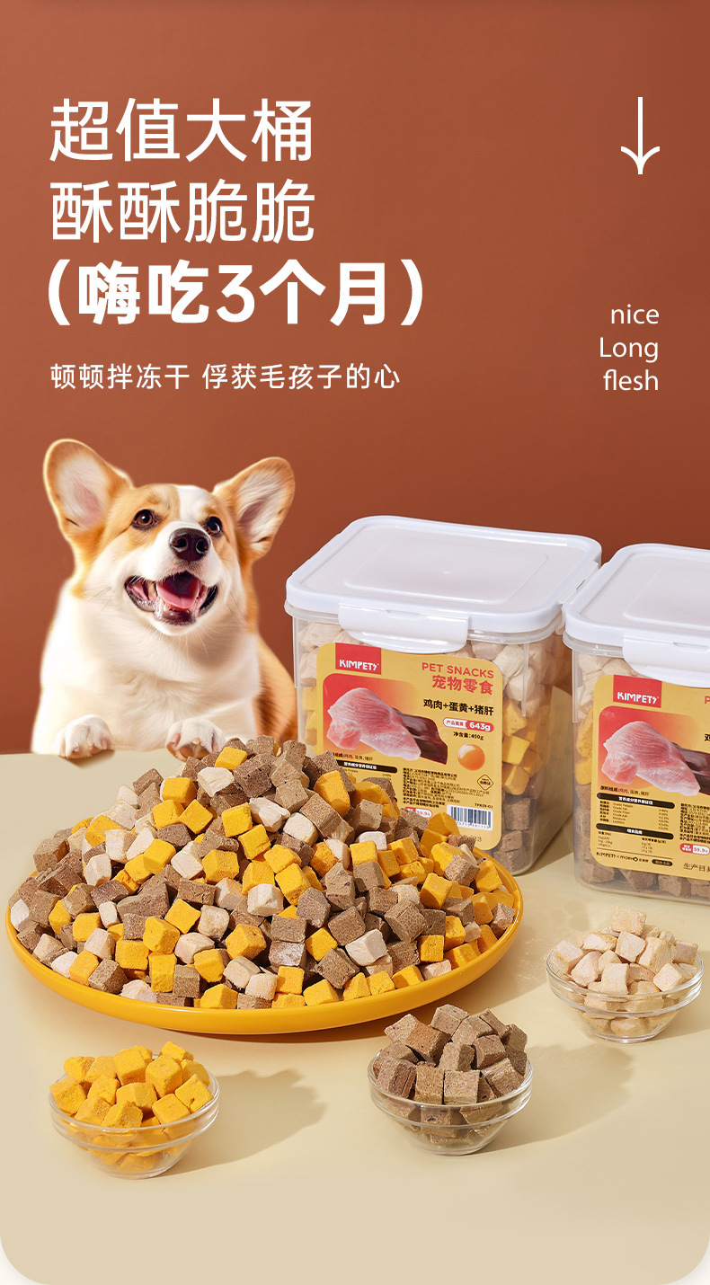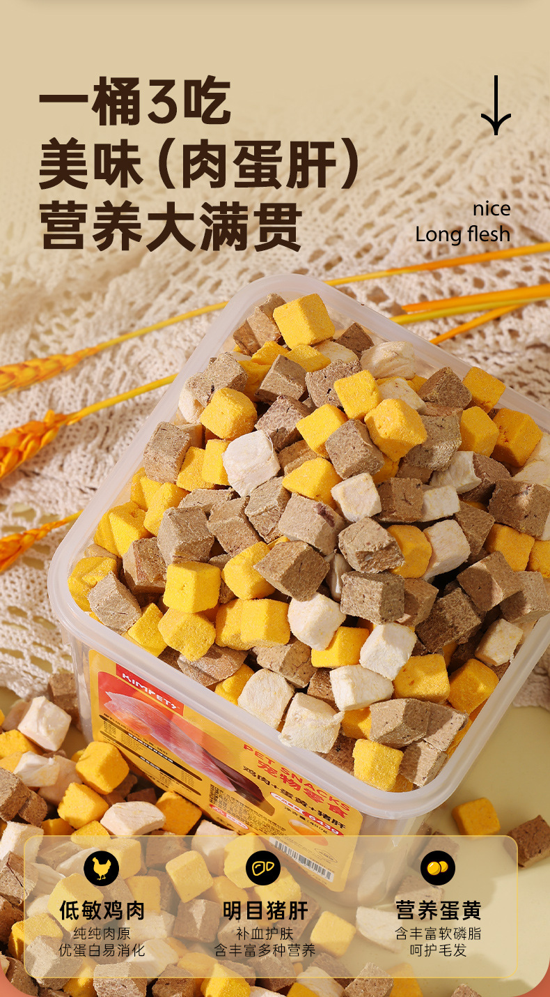 Barril de mascotas pollo liofilizado yema de huevo cabello brillante branquias para gatos y perros snacks Cero agregado carne fresca pura comida para mascotas