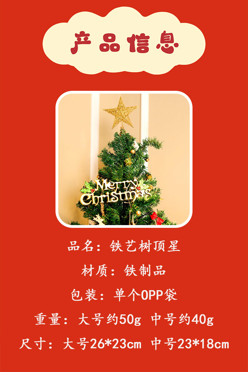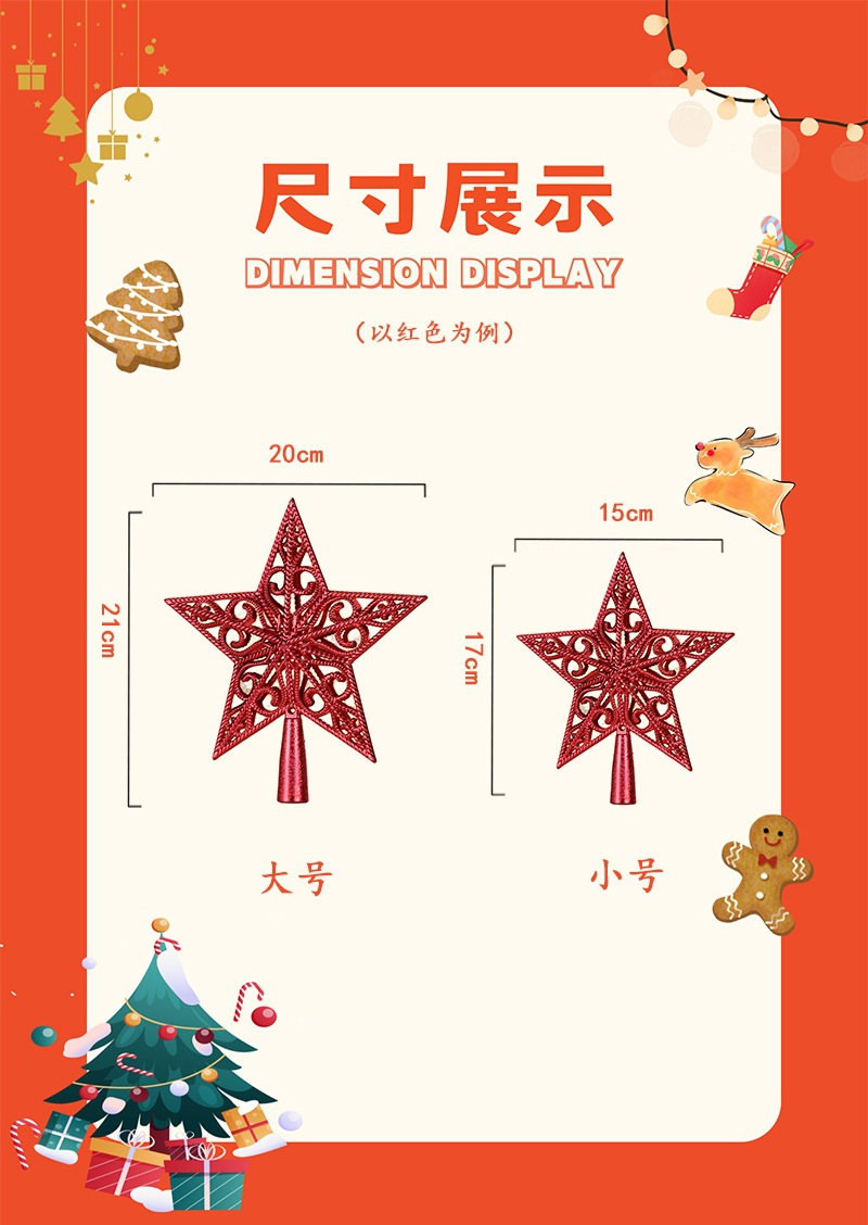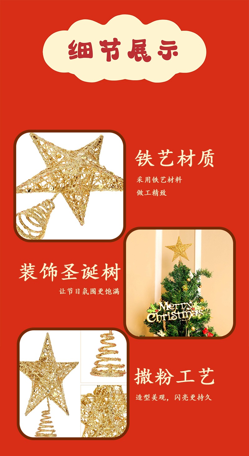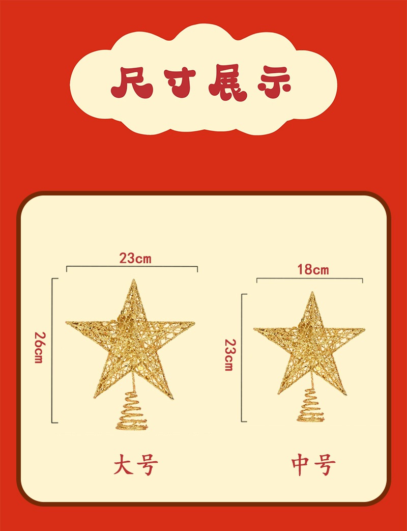 | Especificaciones | Estrella mediana de cinco puntas de hierro forjado 23*18cm,Gran estrella de cinco puntas de hierro forjado 26*23cm,Pequeña estrella de techo de árbol tridimensional roja de 15cm,Pequeña estrella de techo de árbol tridimensional dorada de 15cm,Pequeña estrella de techo de árbol tridimensional plateado de 15cm,Gran estrella de techo de árbol tridimensional rojo de 20cm,Gran estrella de techo de árbol tridimensional dorado de 20cm,Gran estrella de techo de árbol tridimensional plateado de 20cm,Estrella de techo de árbol plano dorado de 18cm,Estrella de techo de árbol plano plateado de 18cm |