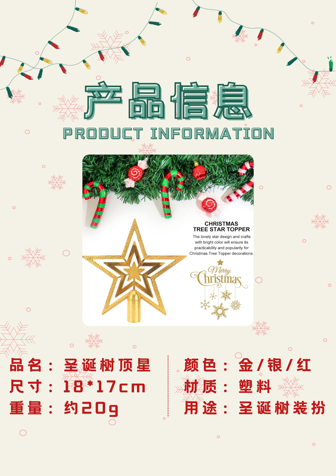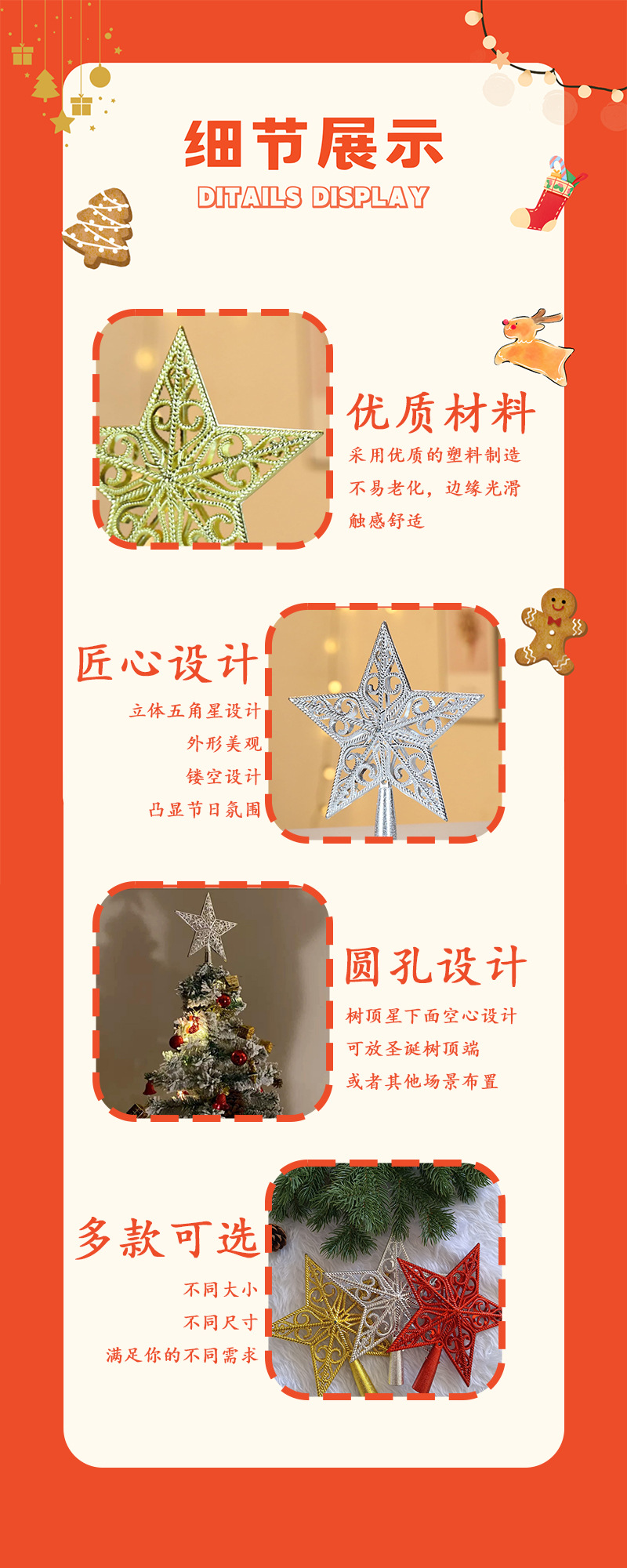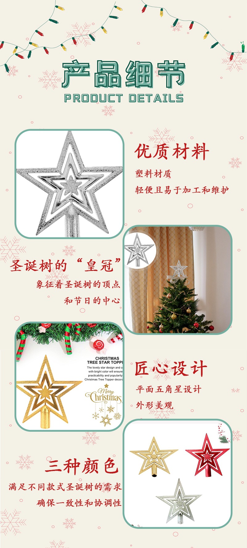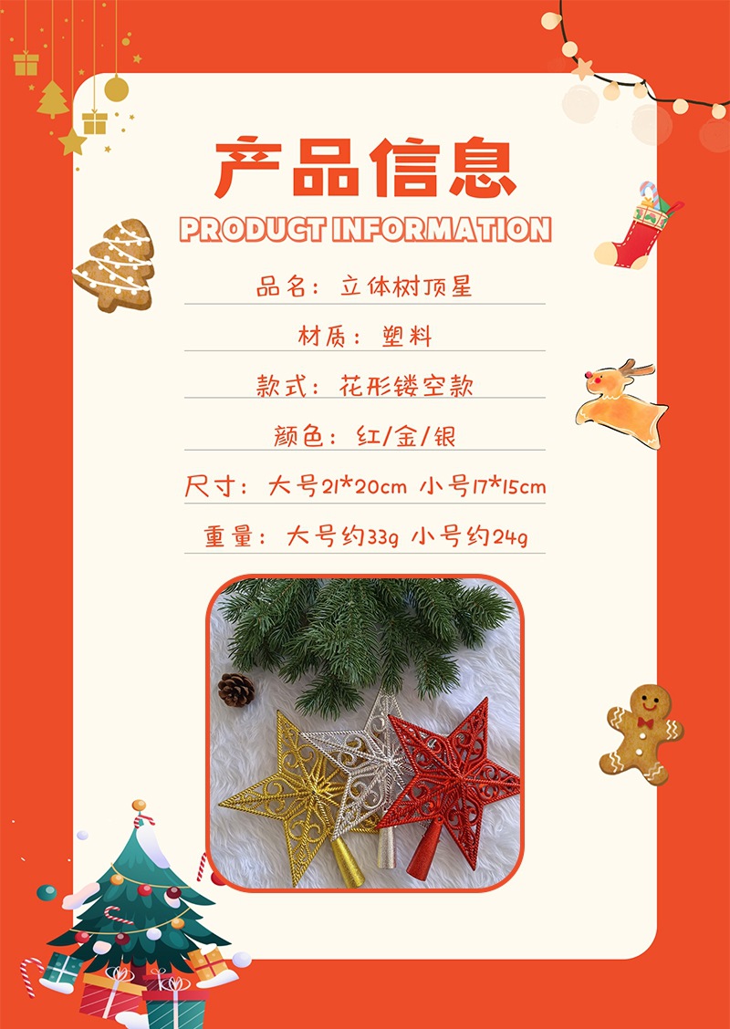 | Especificaciones | Estrella mediana de cinco puntas de hierro forjado 23*18cm,Gran estrella de cinco puntas de hierro forjado 26*23cm,Pequeña estrella de techo de árbol tridimensional roja de 15cm,Pequeña estrella de techo de árbol tridimensional dorada de 15cm,Pequeña estrella de techo de árbol tridimensional plateado de 15cm,Gran estrella de techo de árbol tridimensional rojo de 20cm,Gran estrella de techo de árbol tridimensional dorado de 20cm,Gran estrella de techo de árbol tridimensional plateado de 20cm,Estrella de techo de árbol plano dorado de 18cm,Estrella de techo de árbol plano plateado de 18cm |