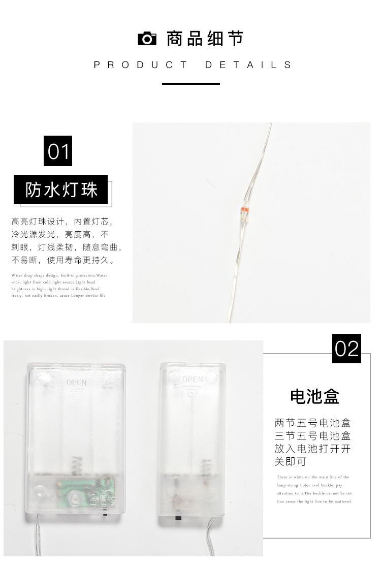 | Potencia | 2 baterías - luz normal - 1m 10 lámparas, 2 baterías - luz normal - 2m 20 lámparas, 2 baterías - luz normal - 3m 30 lámparas, 3 baterías - luz normal -3 baterías - luz normal + con flash - 4m 40 lámparas, 3 baterías - luz normal + con flash - 5m 50 lámparas, 3 baterías - luz normal + con flash - 10m 100 lámparas, 2m 20 lámparas - 3 baterías - 8 funciones caja de baterías impermeables + control remoto, 3m 30 lámparas - - 3 baterías - 8 funciones caja de baterías impermeables + control remoto, 4m 40 lámparas - - 3 baterías - 8 funciones caja de baterías impermeables + control remoto, 5m 50 lámparas - - 3 baterías - - 8 funciones caja de baterías impermeables + control remoto, 10m 100 lámparas - - 3 baterías - - 8 funciones caja de baterías impermeables + control remoto, 20m 200 lámparas - - 3 baterías - - 8 funciones caja de baterías impermeables + control remoto, 30m 300 lámparas - - 3 baterías - - 8 funciones caja de baterías impermeables + control remoto |