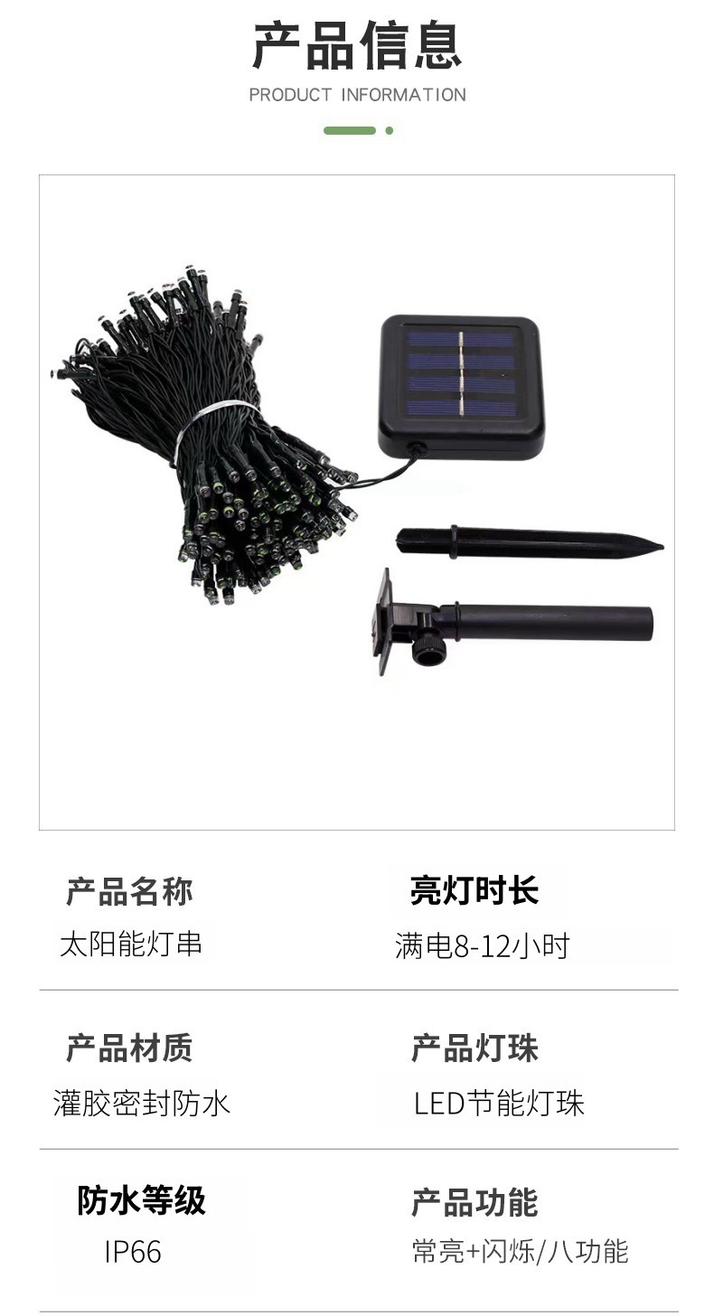| Potencia | 5 metros 20 lámparas [tablero pequeño 600mah], 6,5 metros 30 lámparas [tablero pequeño 600mah], 7 metros 50 lámparas [tablero pequeño 600mah], 12 metros 100 lámparas [tablero pequeño 600mah], 22 metros 200 lámparas [tablero pequeño 600mah], 22 metros 200 lámparas [tablero medio 800mah], 32 metros 300 lámparas [tablero medio 800mah], 12 metros 100 lámparas [tablero grande 1200mah], 22 metros 180 lámparas [tablero grande 1200mah], 22 metros 200 lámparas [tablero grande 1200mah], 32 metros 200 lámparas [tablero grande 1200mah], 32 metros 240 lámparas [tablero grande 1200mah], 52 metros 320 lámparas [tablero grande 1200mah]lámparas [tablero grande 1200mah], 52 metros 400 lámparas [tablero grande 1200mah], 52 metros 500 lámparas [tablero grande 1200mah], 100 metros 600 lámparas [tablero grande 1200mah], 100 metros 800 lámparas [tablero grande 1200mah], 102 metros 800 lámparas [tablero grande 1200mah], 102 metros 1000 lámparas [tablero grande 1200mah], 24v paneles solares [tablero grande 3600mah] |