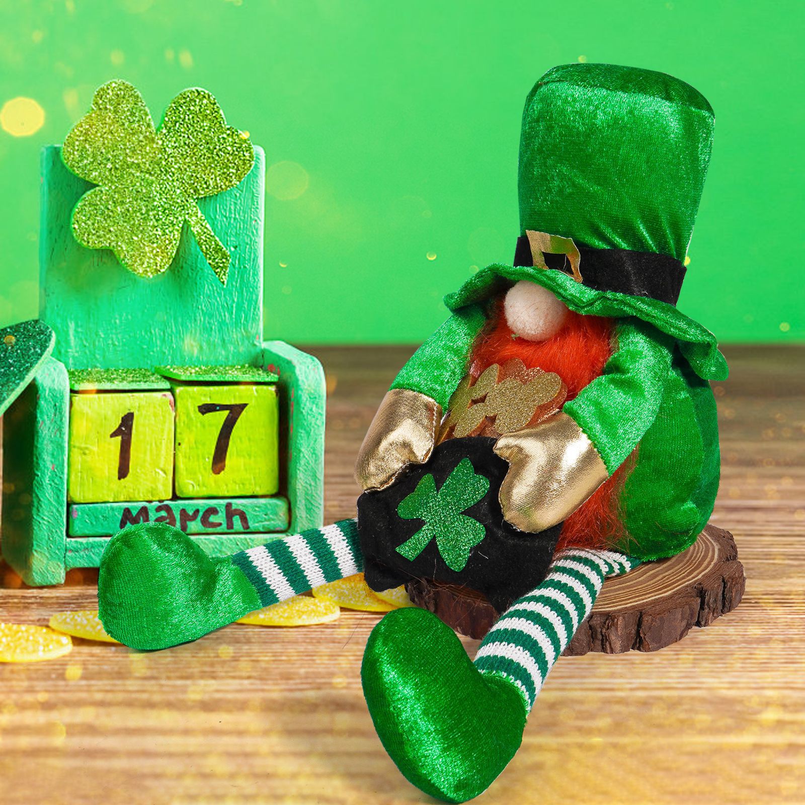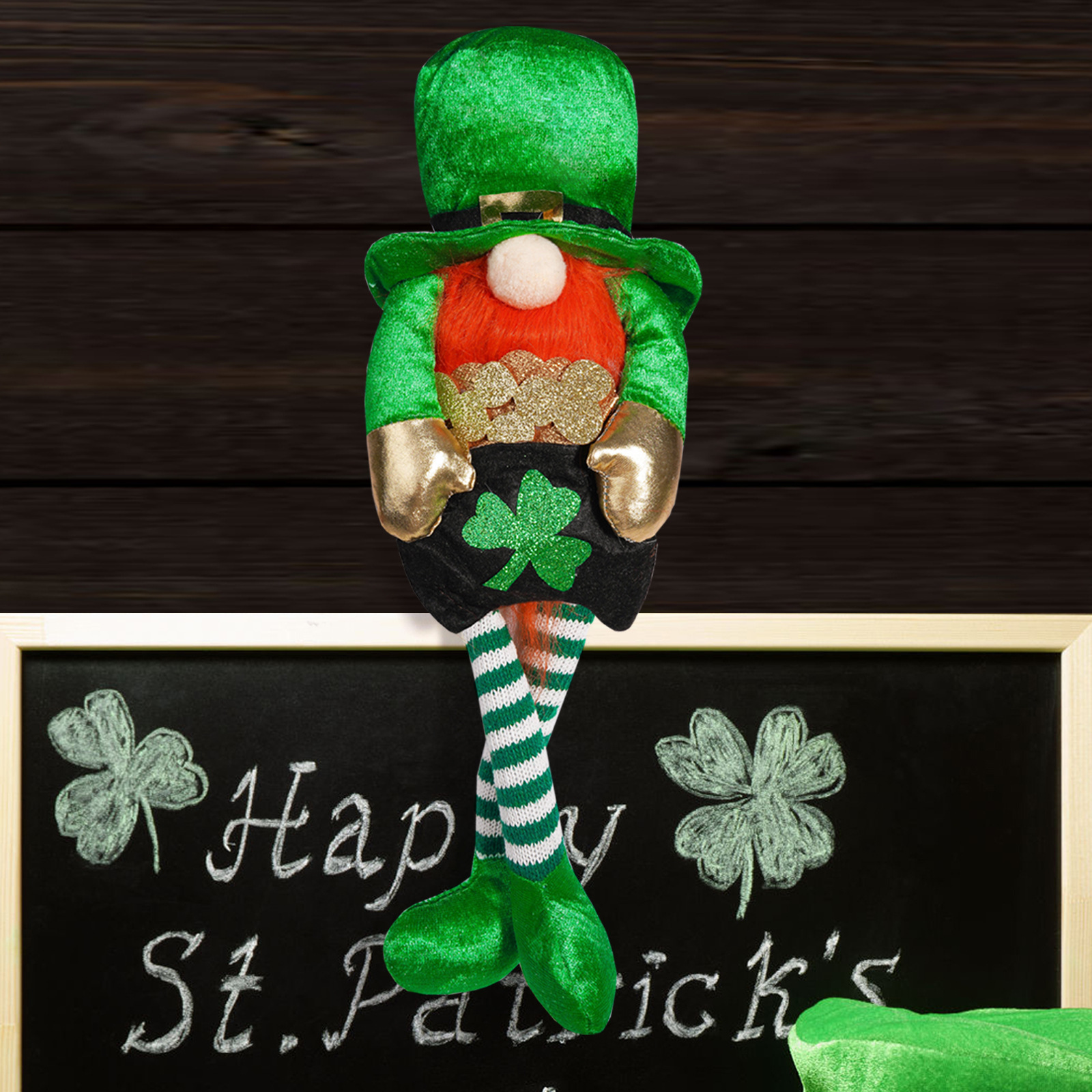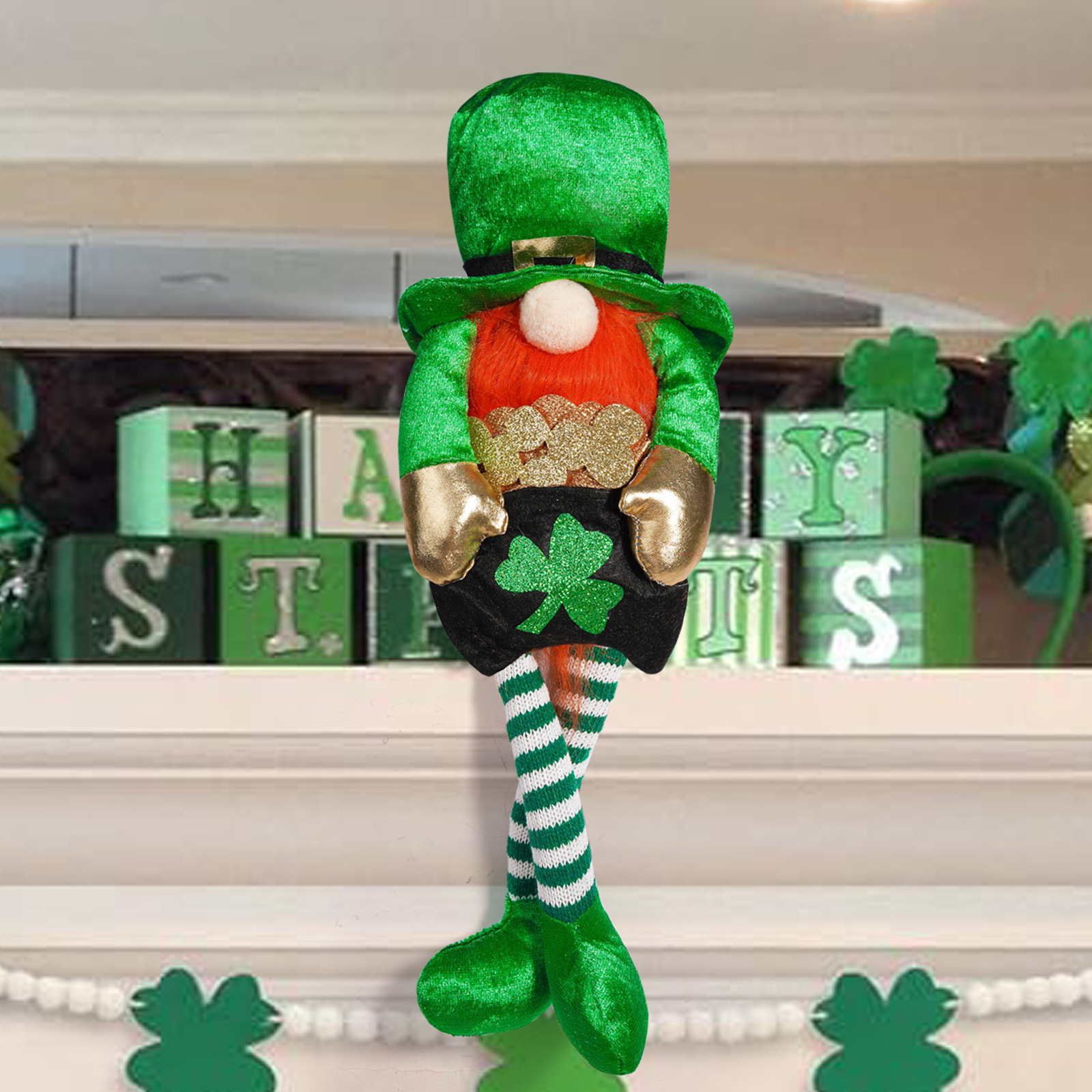 Transfronterizo irlandés Día de Patricio decoración muñeca de piernas largas verde arco iris enano hoja verde decoración Rudolph