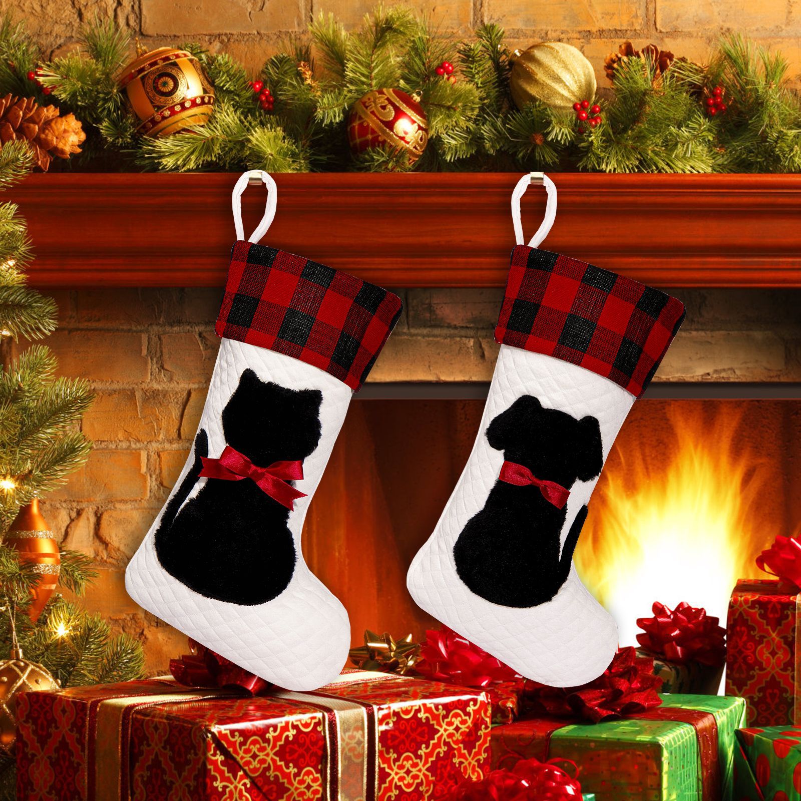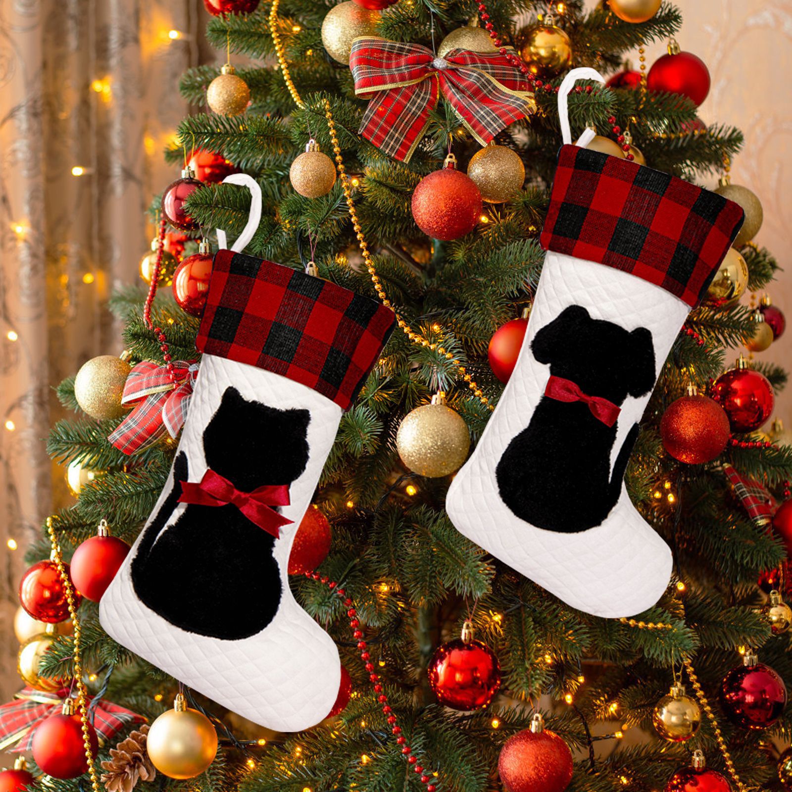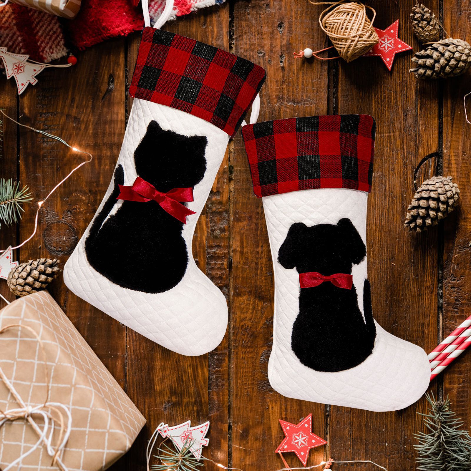 Mascotas transfronterizas calcetines de Navidad rojo y negro cuadrado perro gato bolsas de regalos de Navidad colgantes de árbol de Navidad atmósfera de vacaciones bolsas de regalos