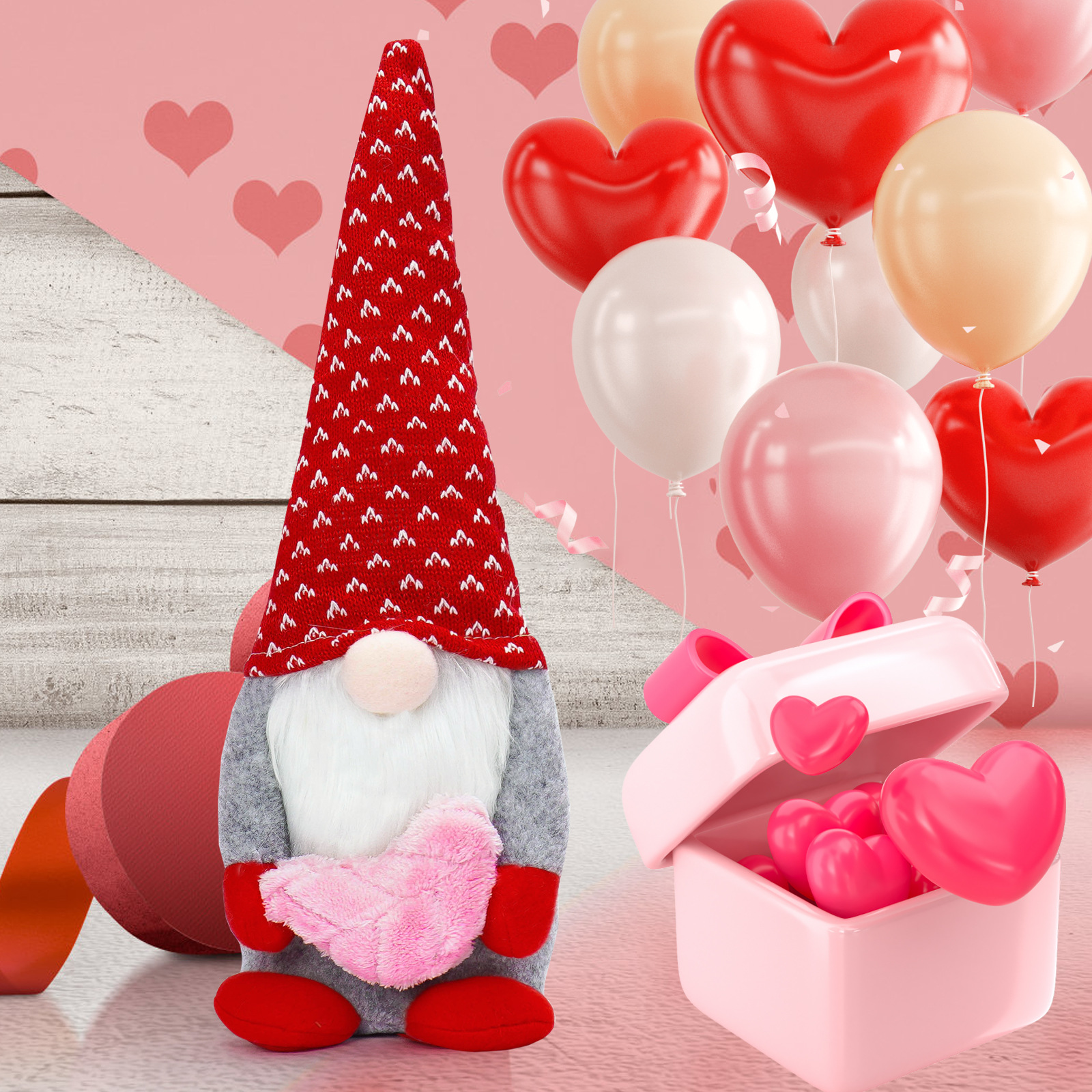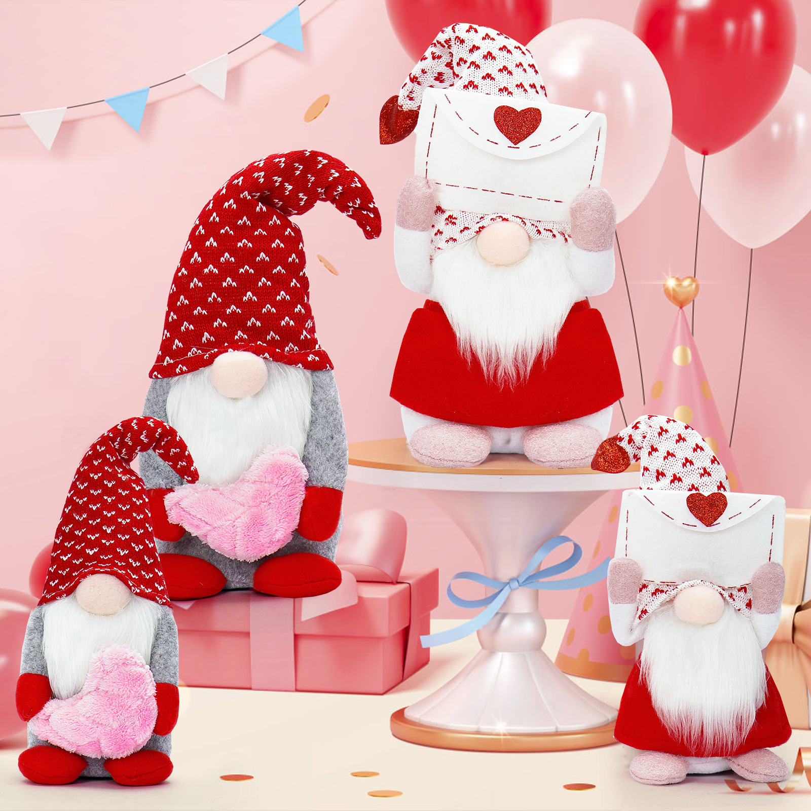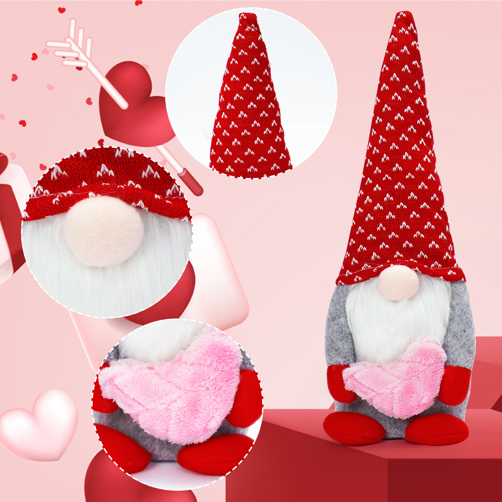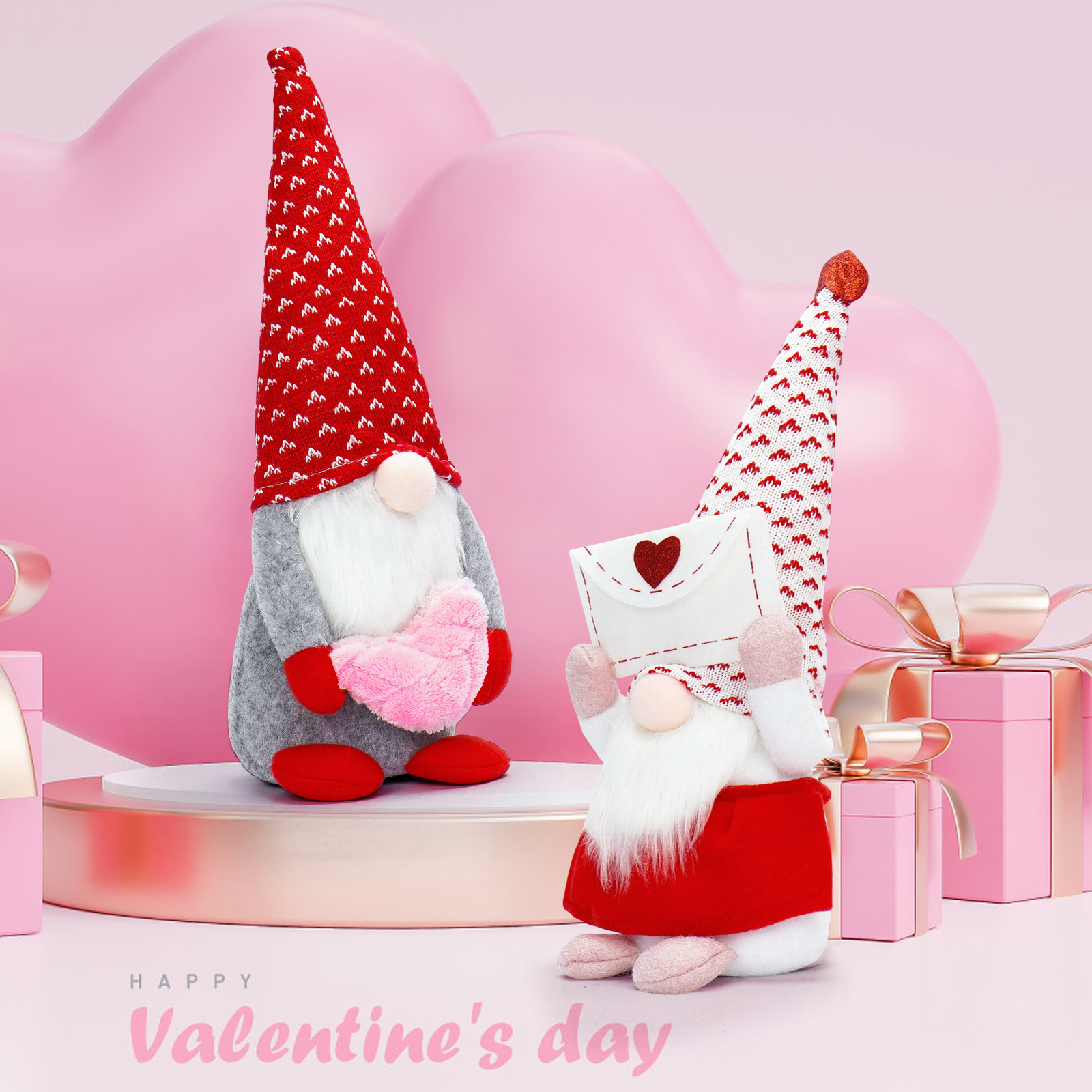Nuevo Día de San Valentín sin rostro muñeca sobre encantador enano ventana apoyos adornos