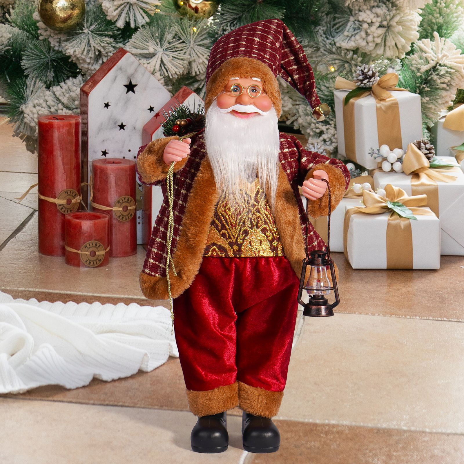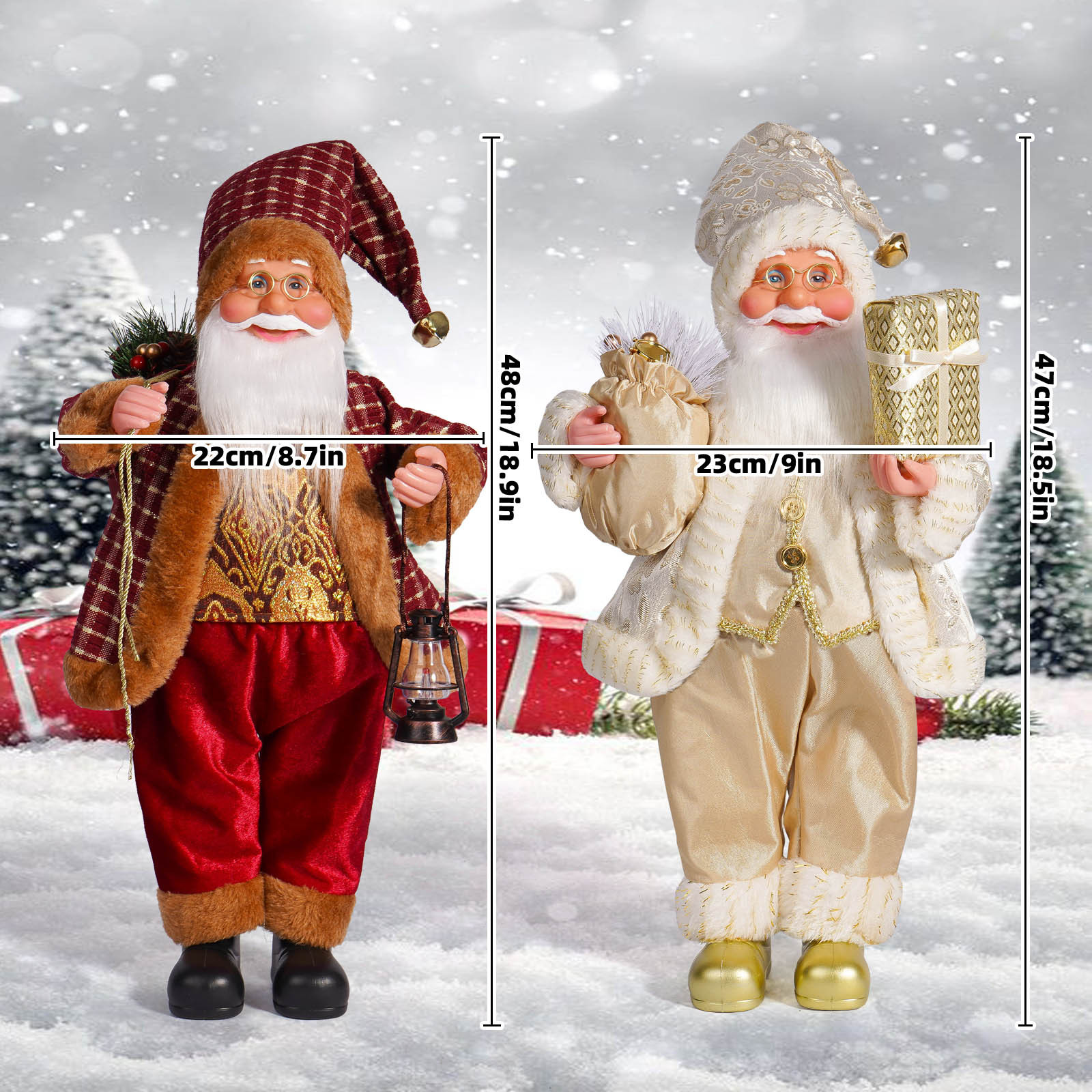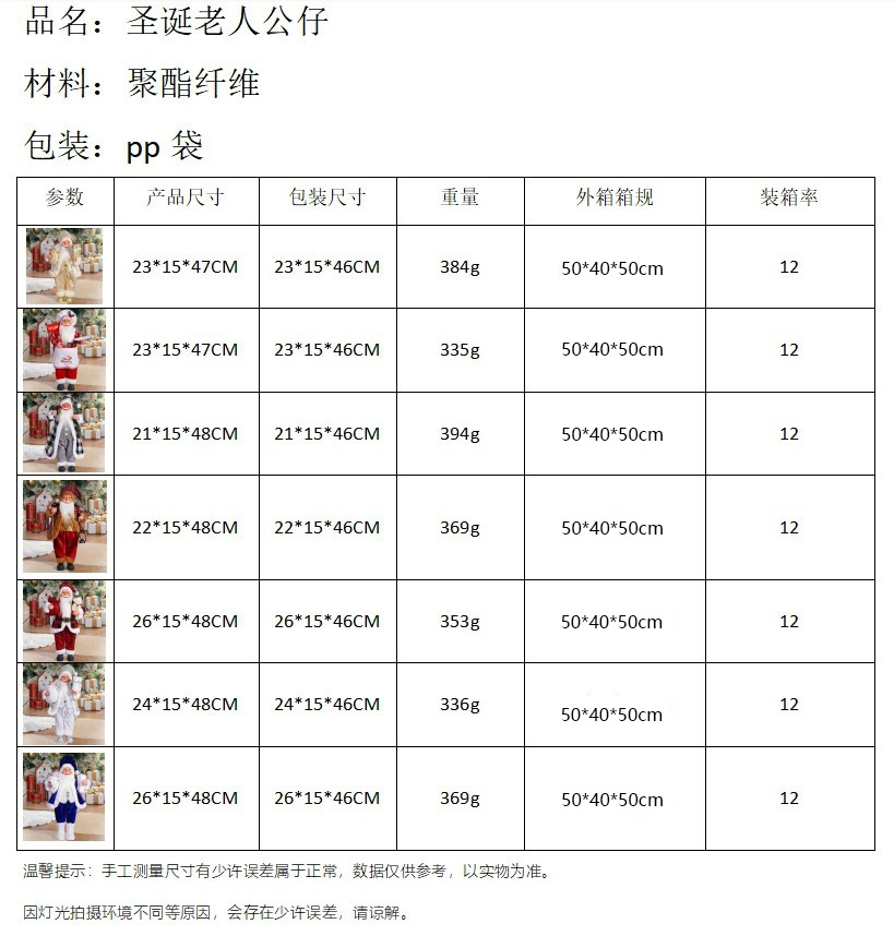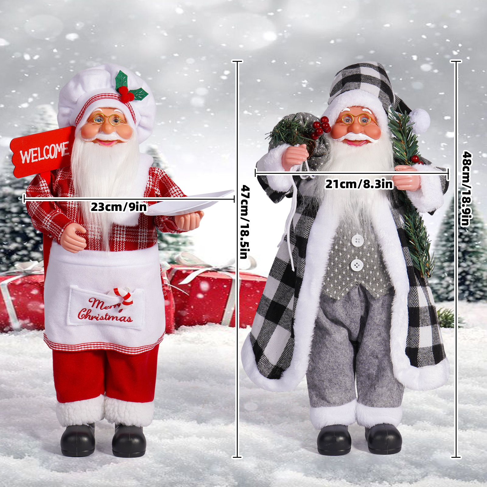 | Color | Papá Noel dorado, Papá Noel chef, Papá Noel a cuadros en blanco y negro, Papá Noel a cuadros en vino, Papá Noel a cuadros en rojo y negro, Papá Noel blanco, Papá Noel azul |