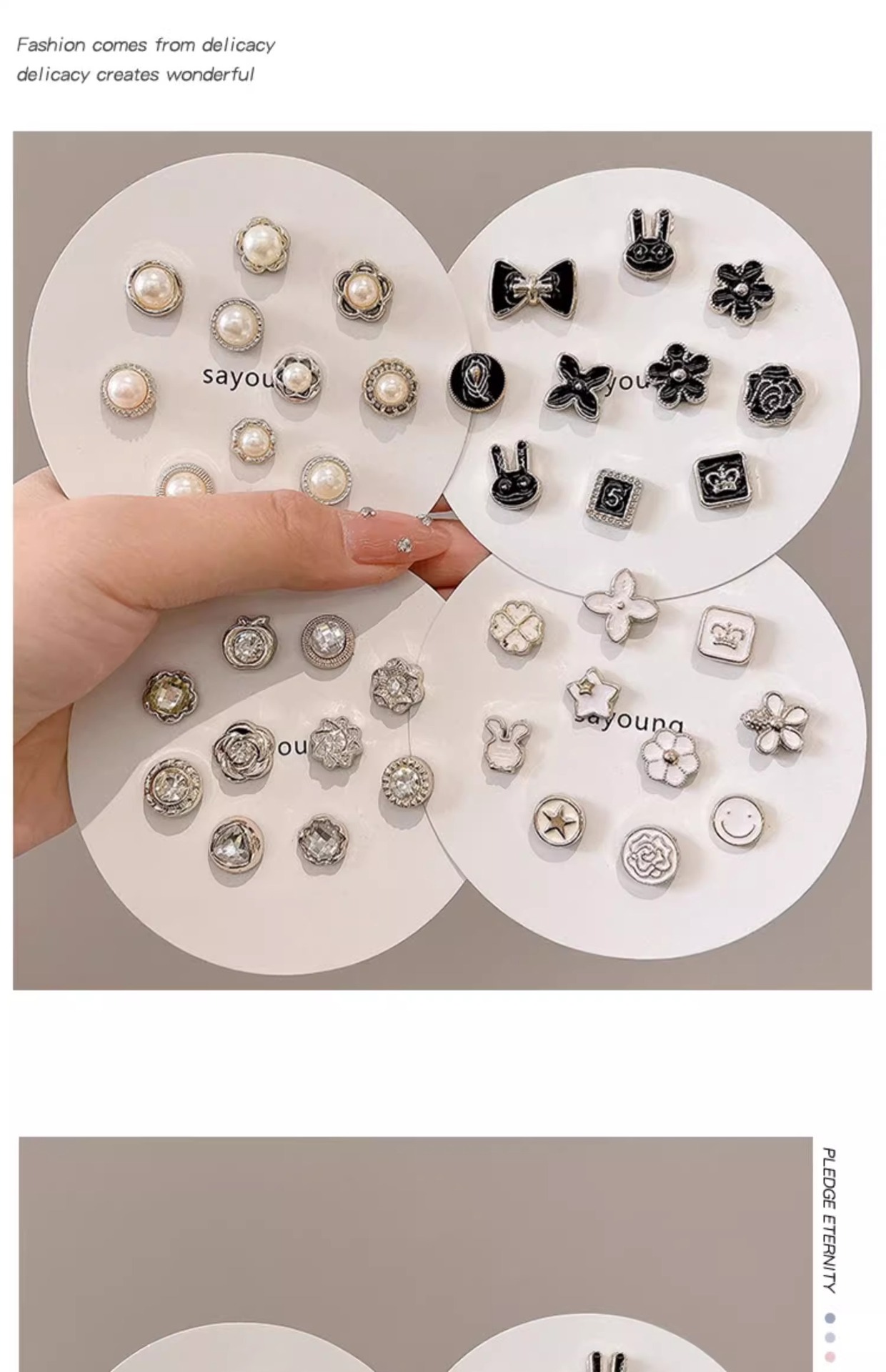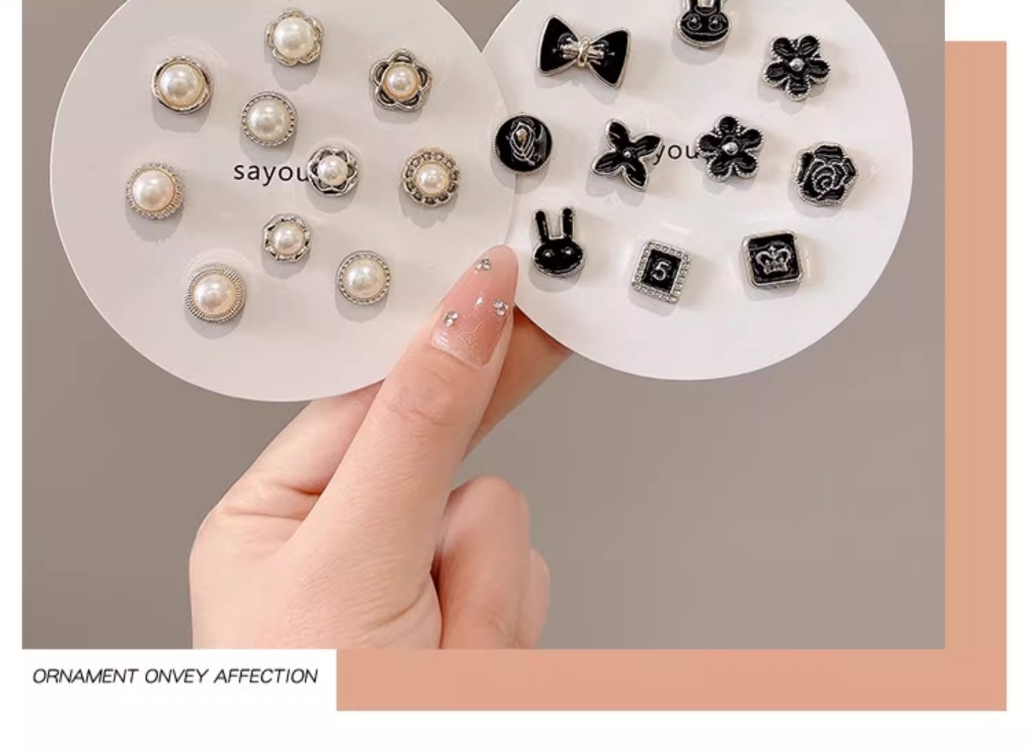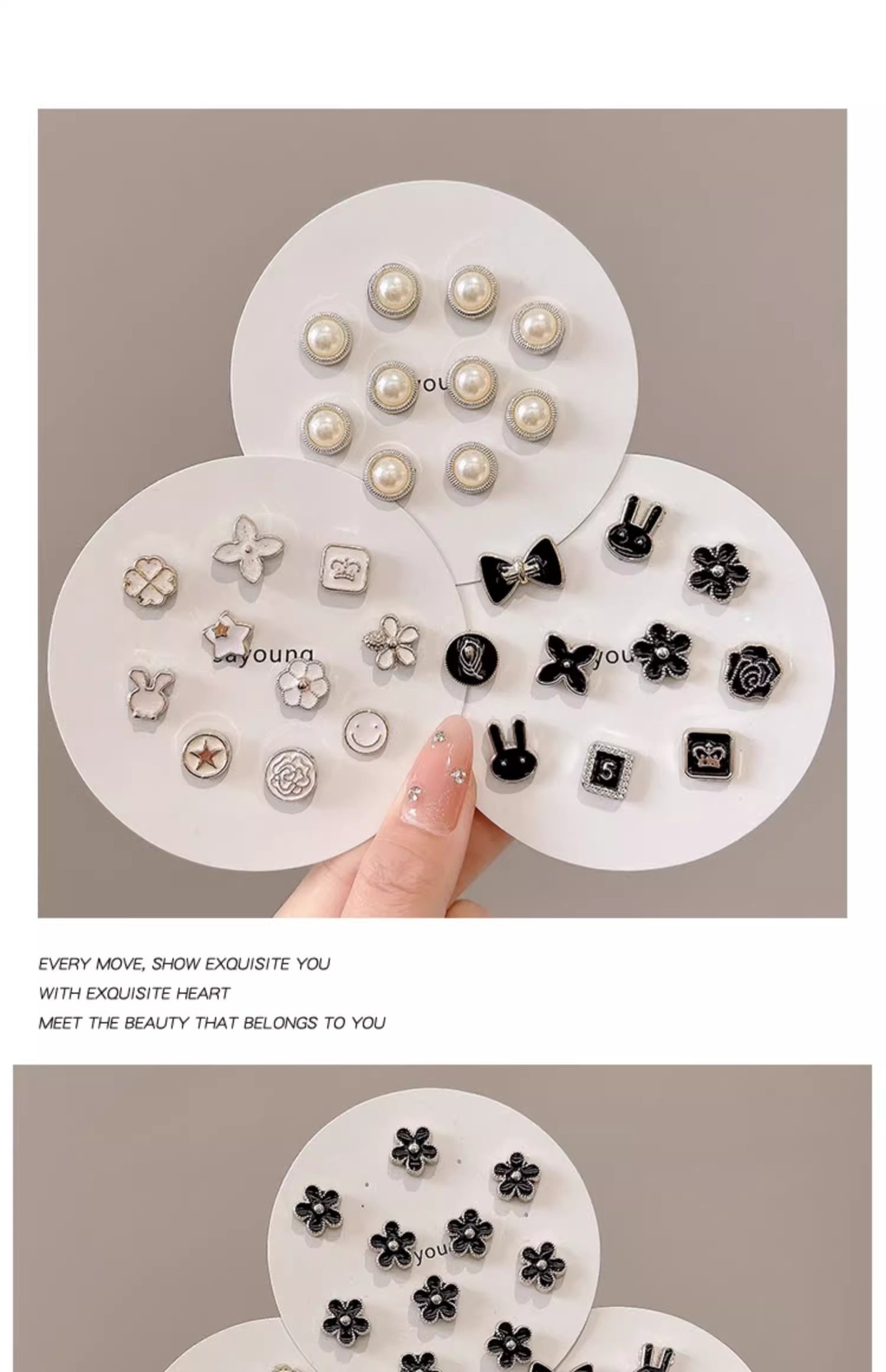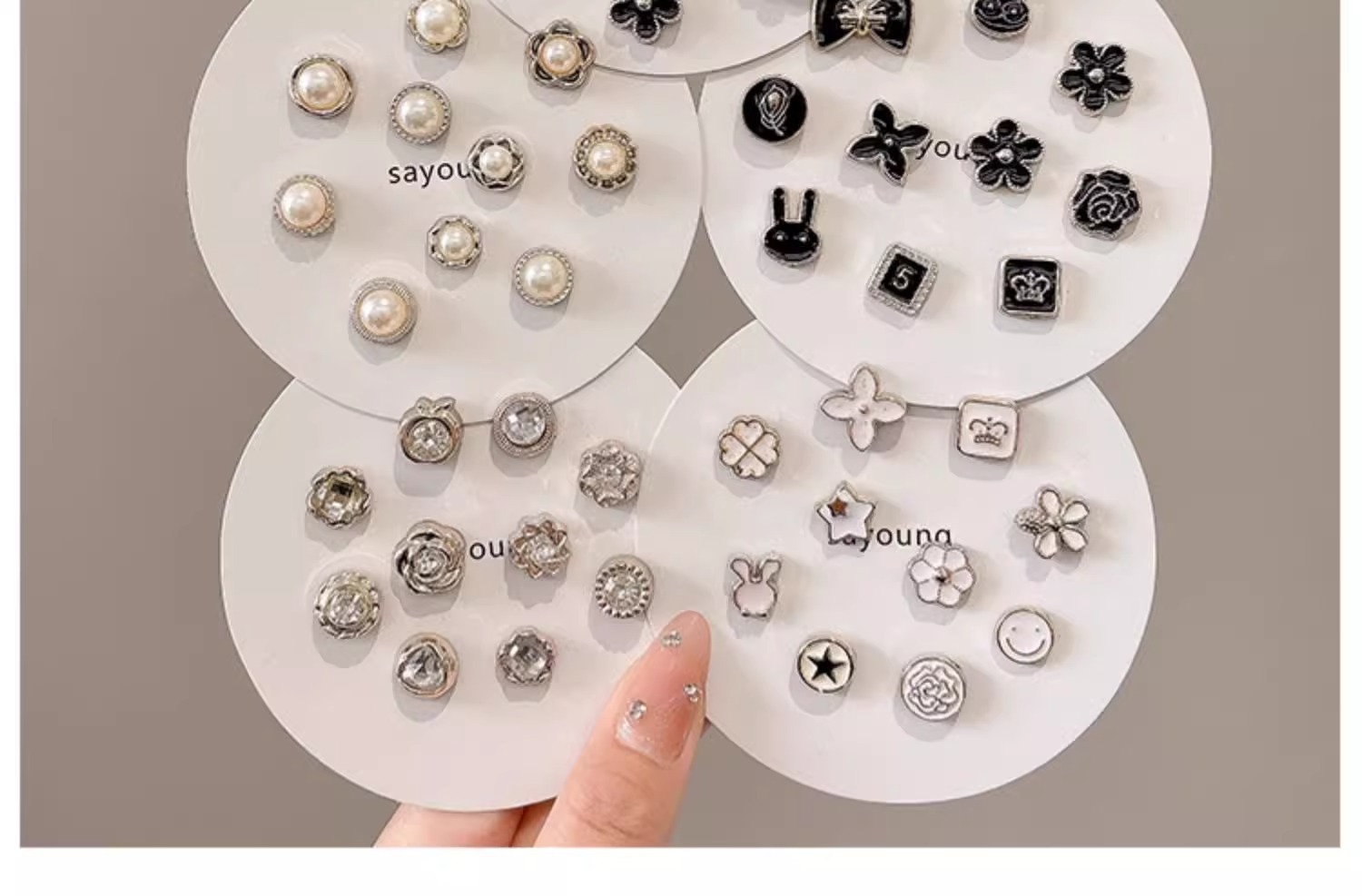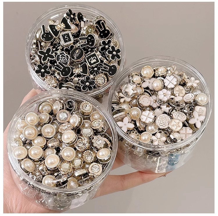 | Colores | 10 flores de cinco pétalos.,10 flores de perlas.,10 piezas de perlas mixtas.,10 caras sonrientes de estrellas.,10 piezas de mezcla blanca.,10 piezas mezcladas con diamantes de imitación.,10 piezas de mezcla negra.,Conejo negro 10 piezas.,10 piezas de perlas.,20 piezas de valor blanco.,10 piezas a prueba de perforación.,10 piezas de diamantes de imitación. |