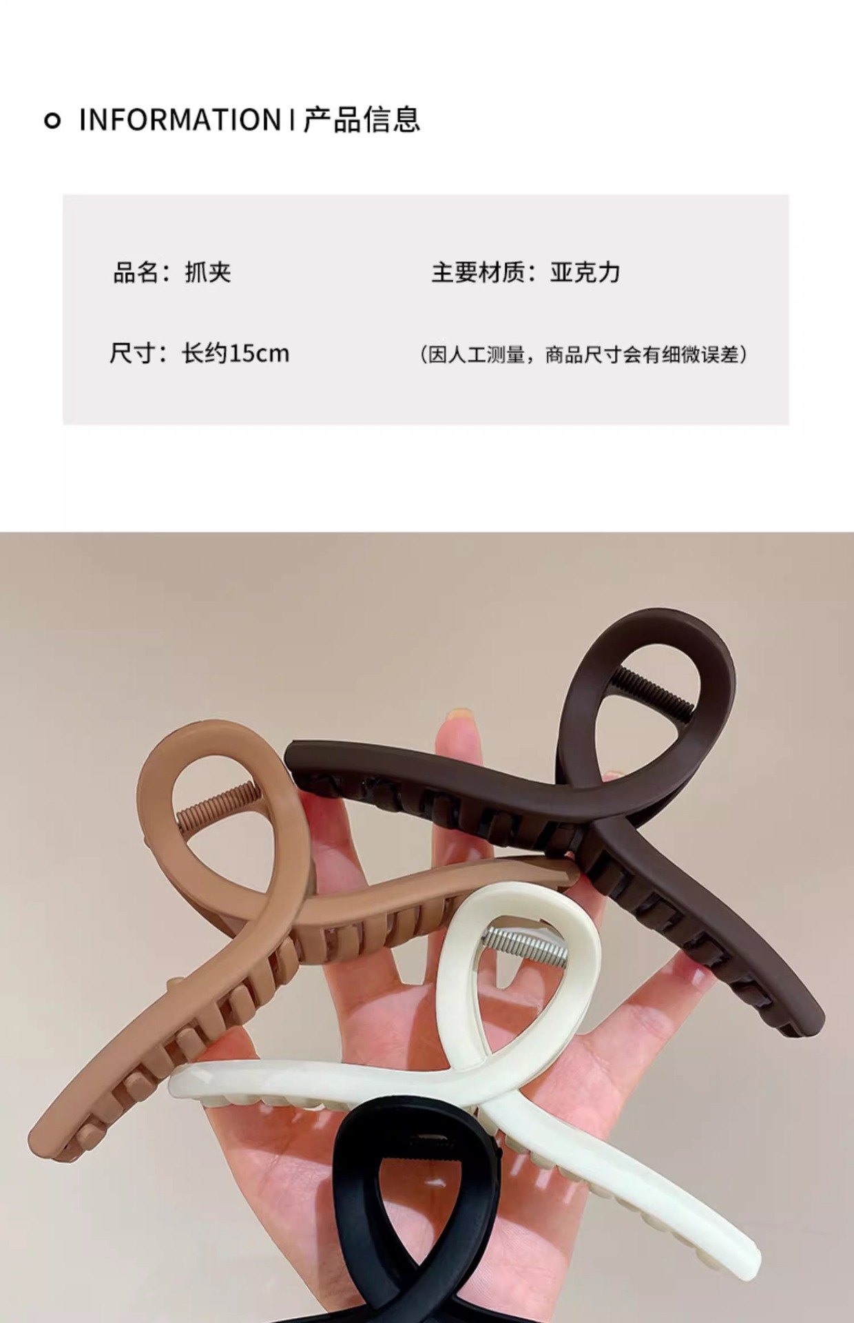 | Color | 1 # negro y palabra 15CM., 2 # blanco y clip 15CM., 3 # brown oscuro y clip 15CM., 4# marrón claro y clip 15CM., 1 # negro esmerilado min 15cm., 2 # cuadrado negro esmerizado 15cm., 3# amor negro esmerilado 15cm., 4# perlas esmerizadas 15cm., 5 # doble amor 15 cm., 6 # perlas pequeñas 15cm., 7 # clip de perla brillante 15Cm., 8 # Amber Brilliant Face Pearl Clip 15cM, Negro y otra palabra 13CM., Curry Cross 13 cm., Blanco cruzado 13CM., Caqui cruzado 13CM., 1 # gris claro 15cm., 2 # arroz blanco 15 cm., 3# marrón 15cm., 4 # Verde 15cm. |