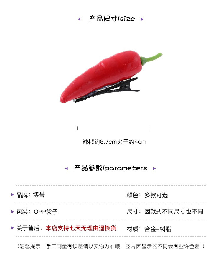 Simulación chile clip de cabello extraña comida frita clip de cabello lateral clip de frisa adornamiento de cabello creativo extraño tocado de hechizo