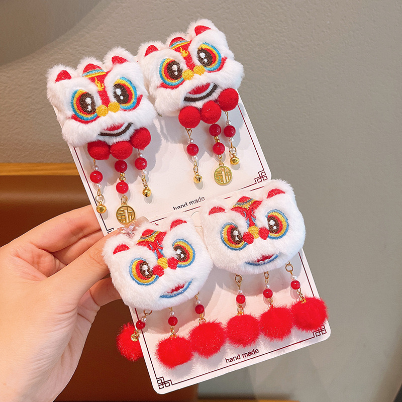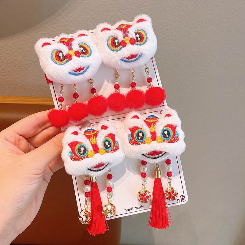 2025 Año Nuevo de peluche despierta león clips de Año Nuevo niñas clips de cabello bebé estilo chino Hanfu clips de cabello adornamiento