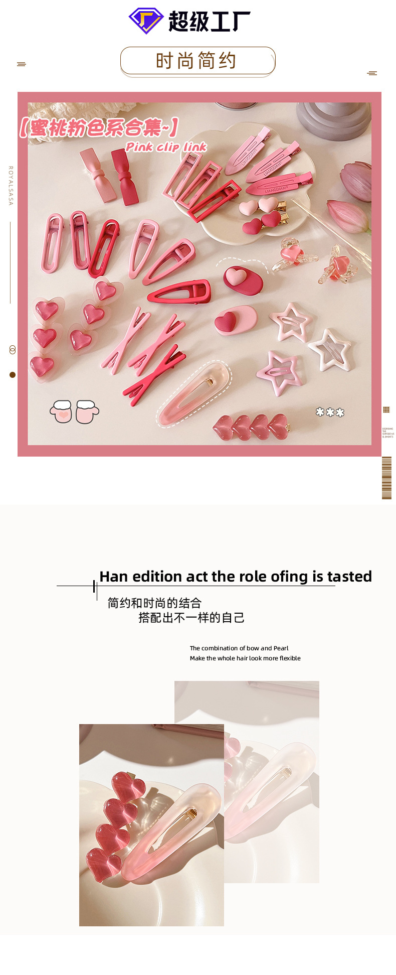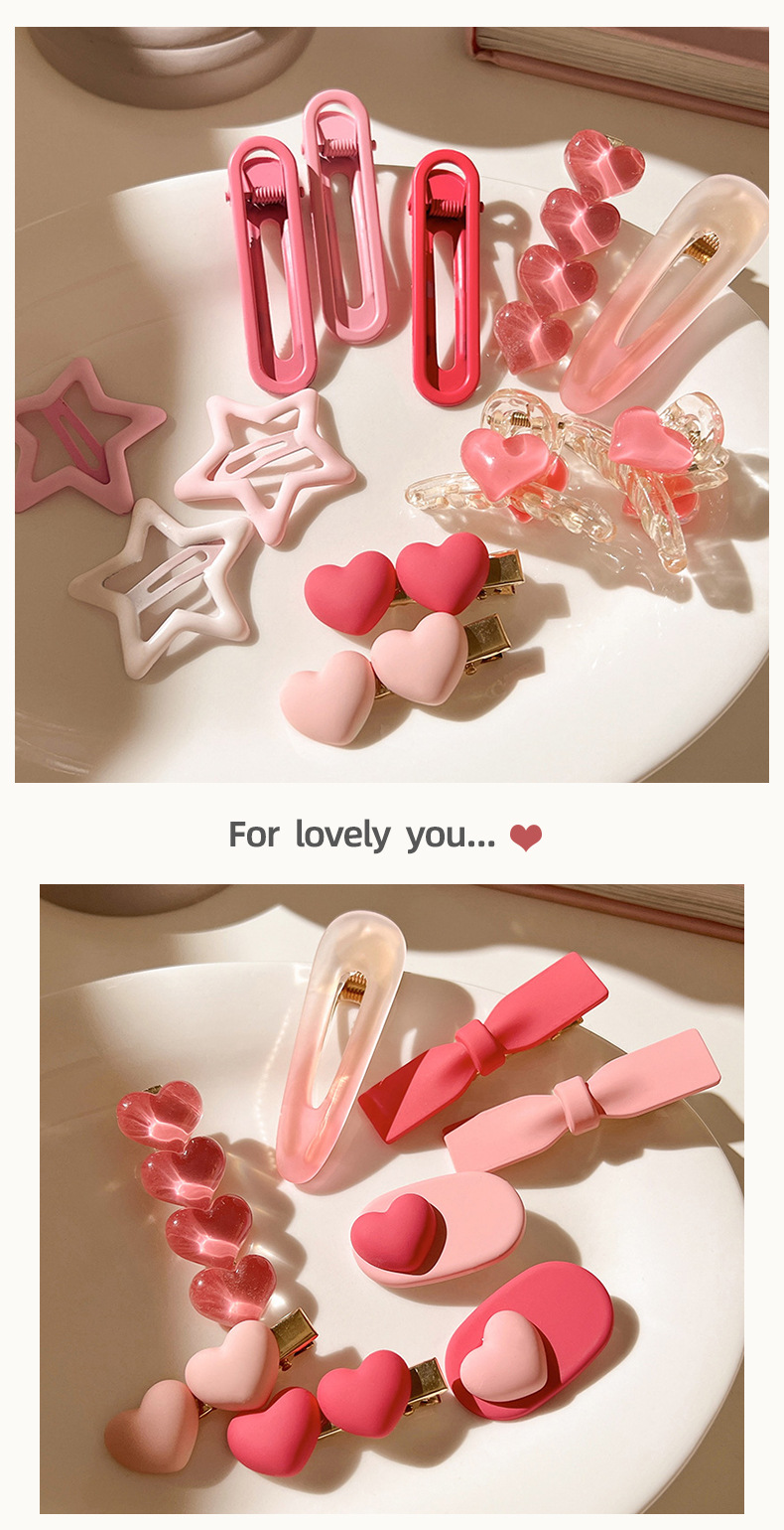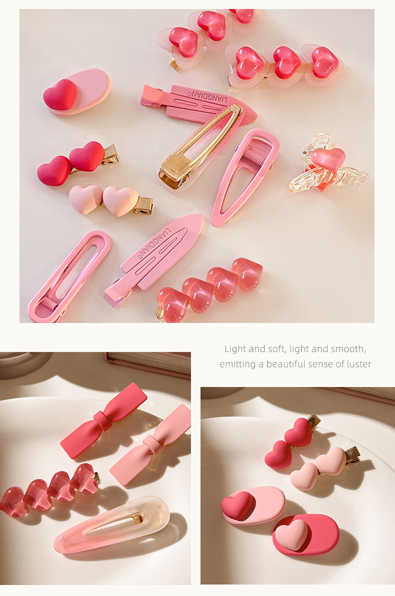 | Colores | 7 # Horquilla de tres piezas con degradado rosa,1 # clip rosa,2 # clip de palabra rosa roja,3 # Estilo de amor rojo rosa,4 # Estilo de amor rosa,7 # Dos corazones de amor,21 # clip de agarre de fondant arcoíris,22 # Amor transparente colorido,13 # clip de flequillo rosa de tres piezas,2 # Amor rosa,1 # conjunto de dos piezas de melocotón,6 # Serie rosa-tres piezas,1 # estambre blanco,2 # estambre rosa claro,3 # estambre rosa,4 # Rosa,5 # blanco,6 # Rosa claro,1 # blanco lechoso 2 piezas,2 # rosa 2 piezas,3 # rosa roja 2 piezas |