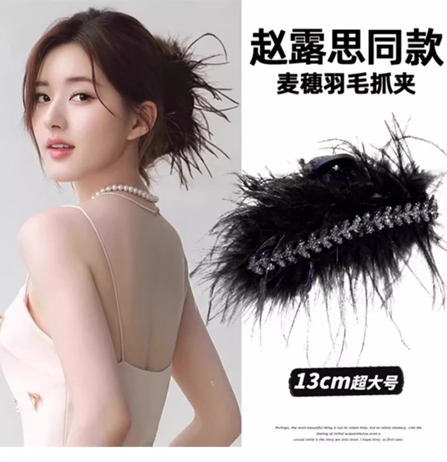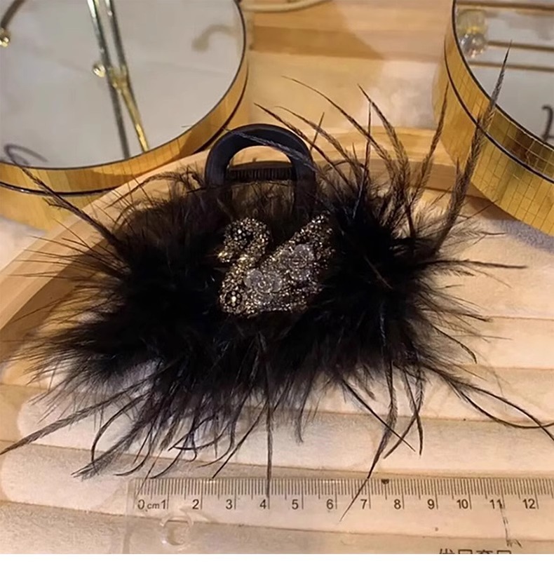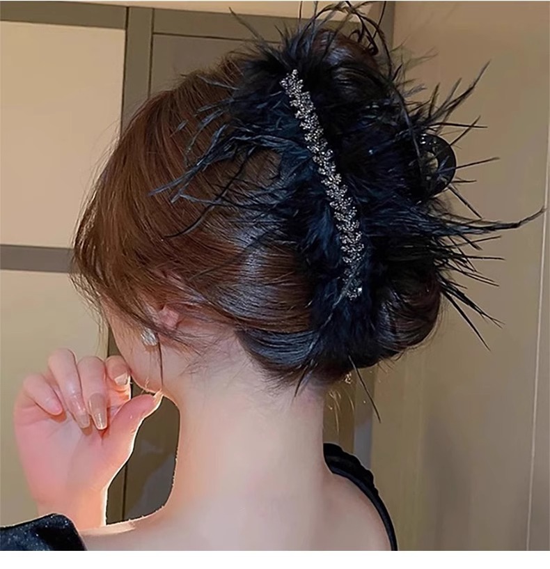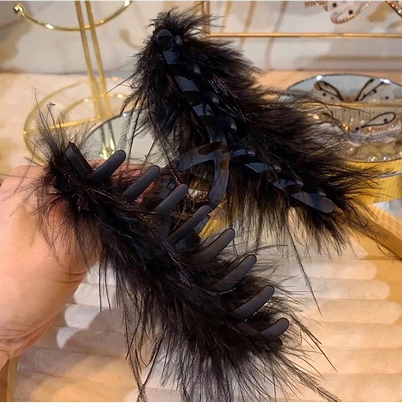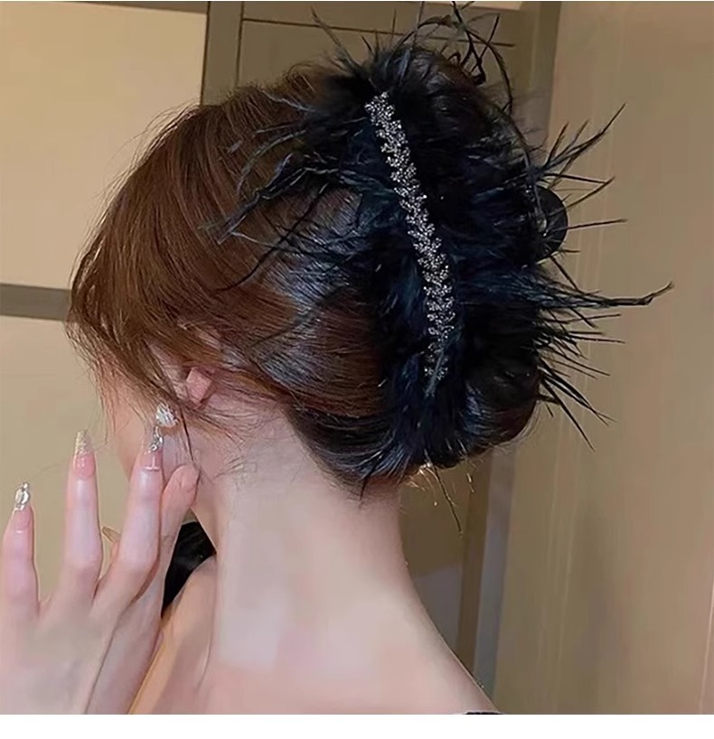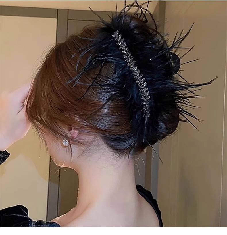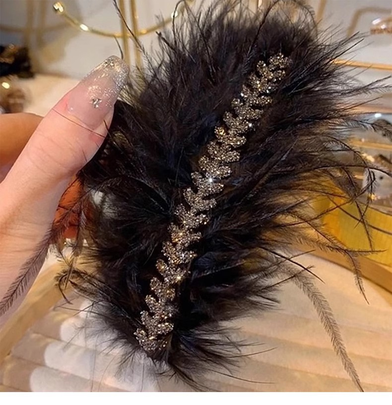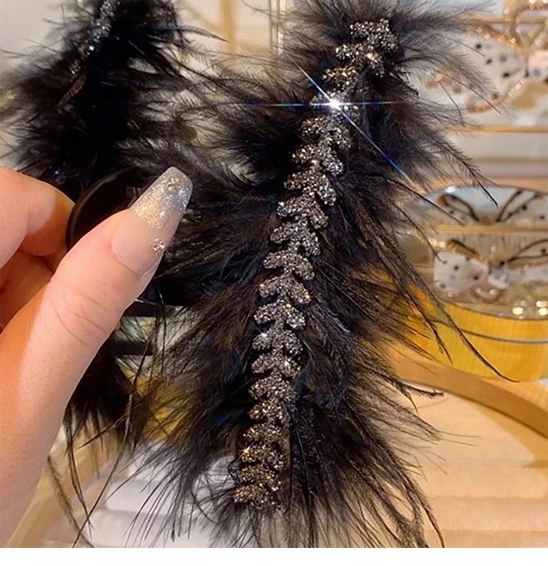 Horquilla de plumas de plumas de pollo de gran tamaño para mujer, clip de agarre de plumas, clip de tiburón de pelo, tocado negro, nuevo estilo 2025