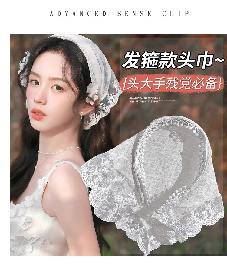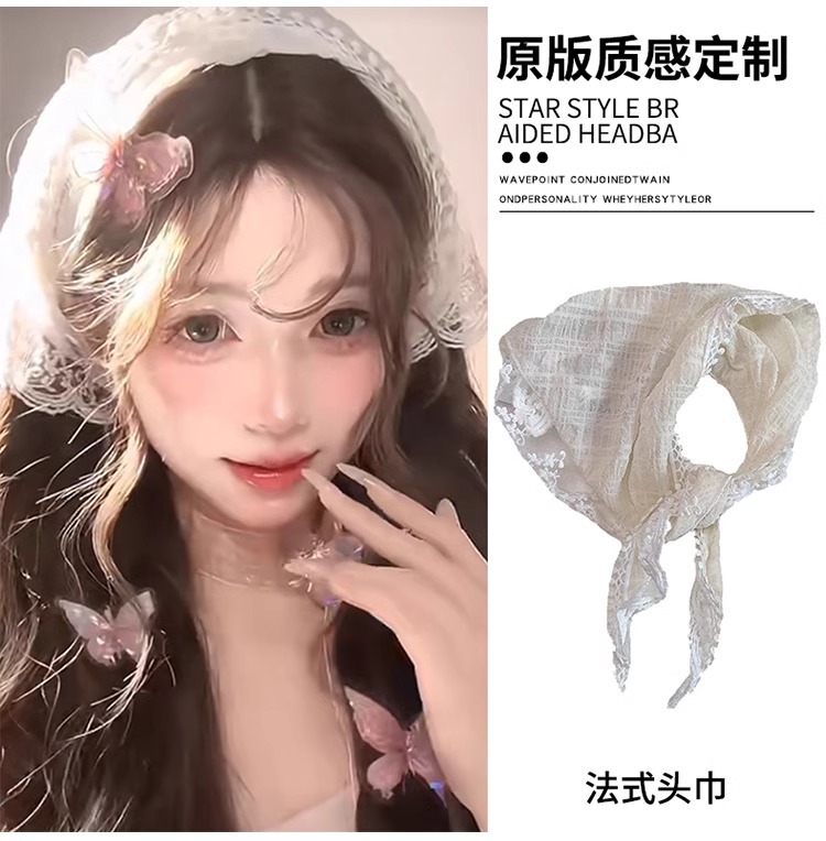 Diadema de encaje blanco Diadema de una pieza de pañuelo triangular francés femenino estilo pastoral playa accesorios para el cabello de alta gama verano
