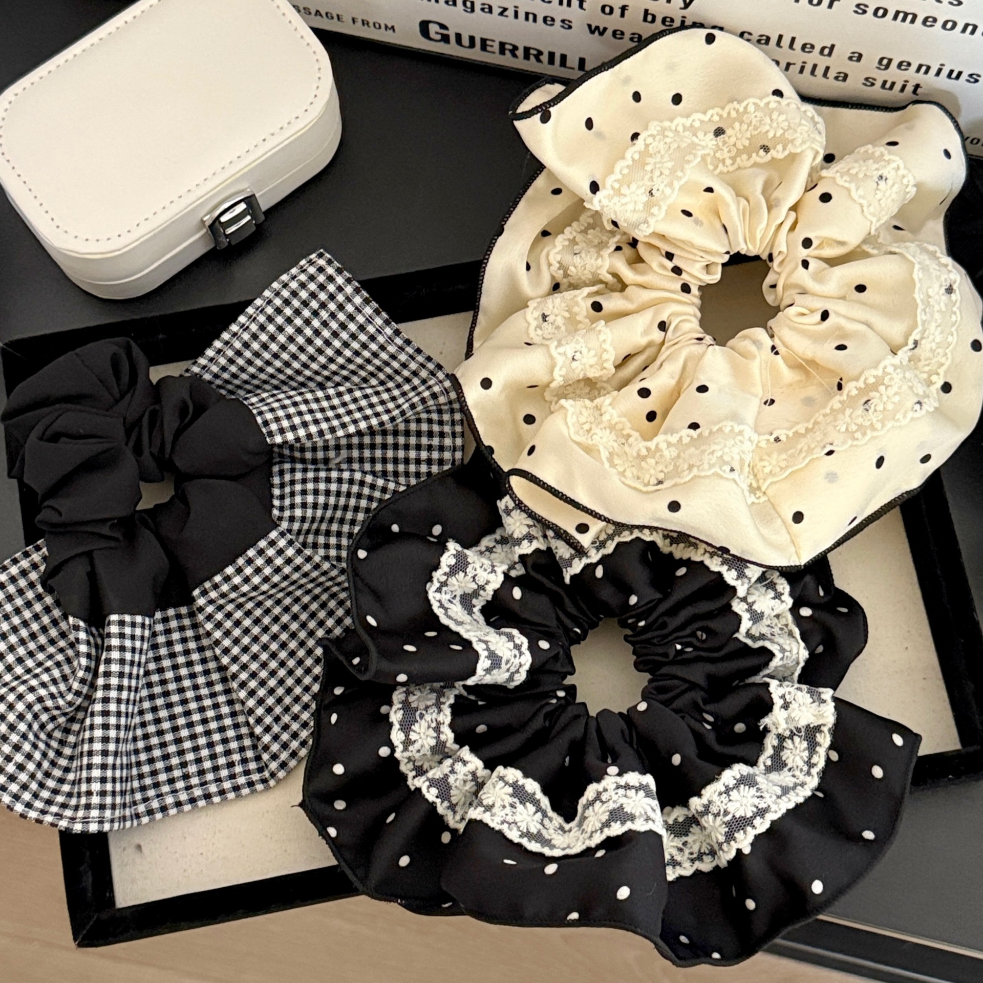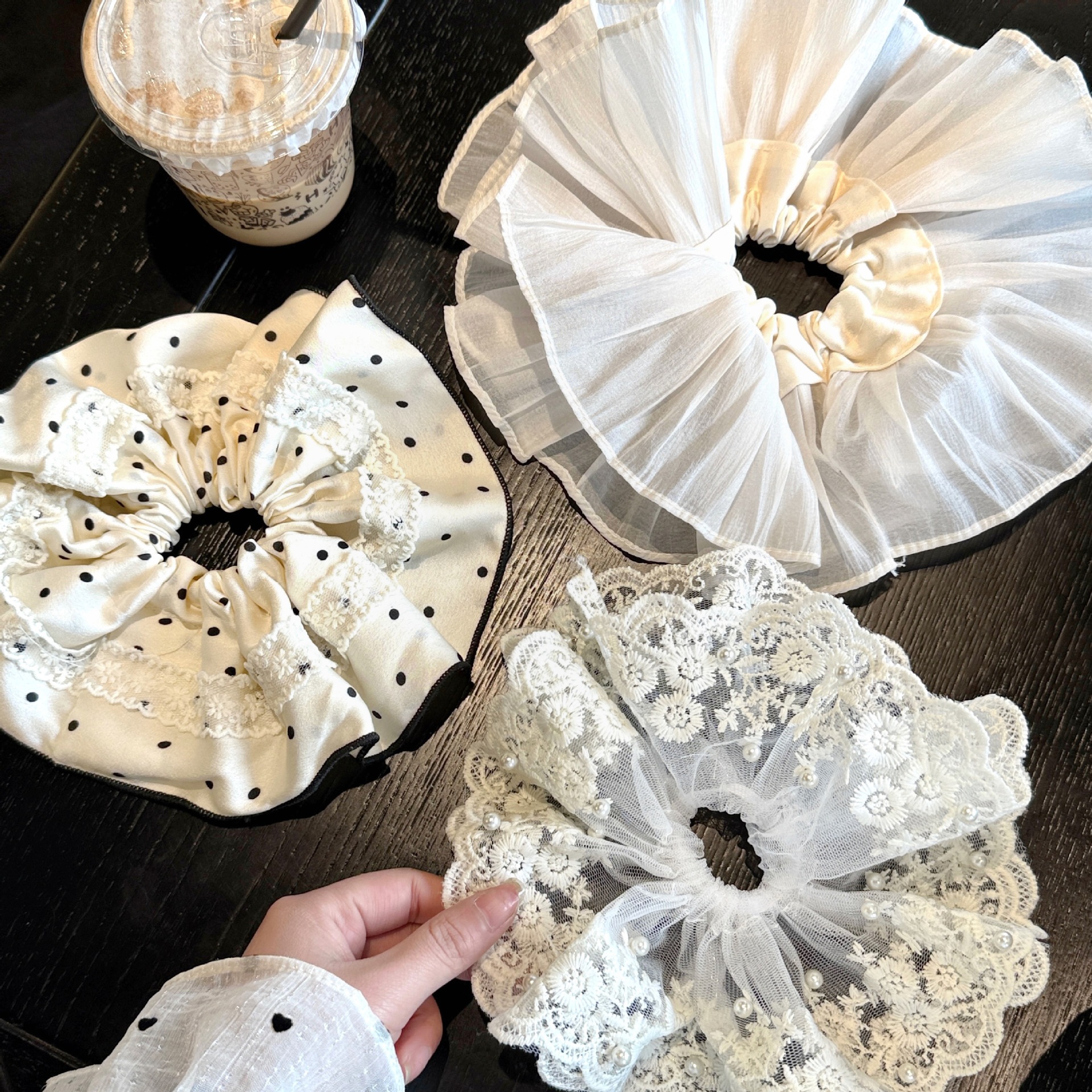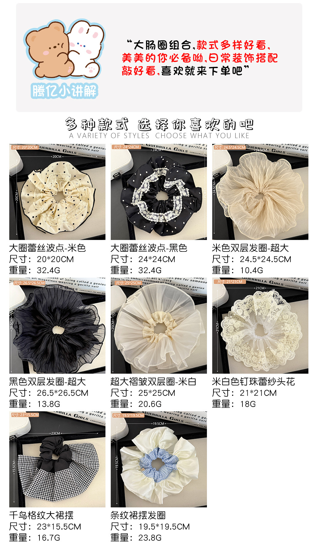 | Color | 2# gran anillo de encaje punto de onda - negro, 5# super doble anillo plegado - blanco arroz, 4# bordado púrpura conejo anillo de cabello |