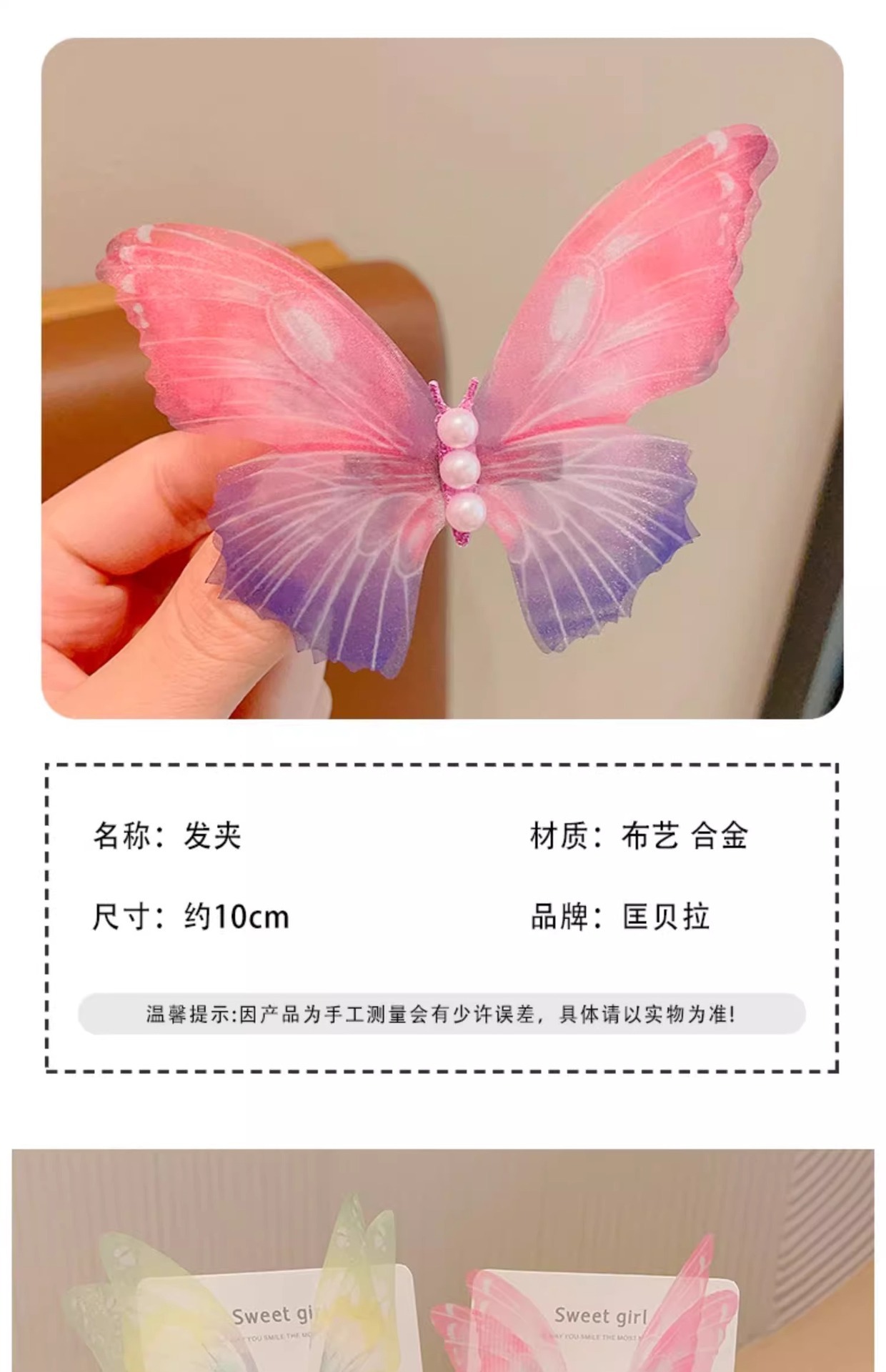 | Color | 2 # rosa pálido, 3 # púrpura rosa, 4 # azul hielo, 5 # rosa degradado, 6 # púrpura brillante, 7 # rosa brillante, 8 # verde claro, 9 # perlas de una sola fila verde, 12 # perlas de una sola fila rosa brillante, 1 # mariposa de rosa un par, 2 # mariposa rosa un par c, 3 # verde claro un par, 4 # mariposa de polvo gris un par, 5 # mariposa de ensueño un par, 6 # mariposa de color cereza un par, 7 # rosa azul degradado mariposa clips de pelo 1 par, 8 # amarillo-púrpura gradiente de mariposa 1 par de brocas, 10 # azul-púrpura gradiente de mariposa 1 par de brocas, 1 # Matcha verde, 2 # púrpura, 3 # rosa, 4 # rosa, 16 # rosa Matcha verde - 2 piezas, 17 # Matcha verde púrpura - 2 piezas, 18 # rosa púrpura - 2 piezas |