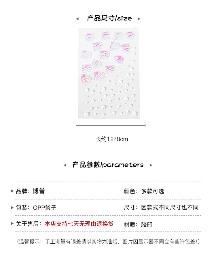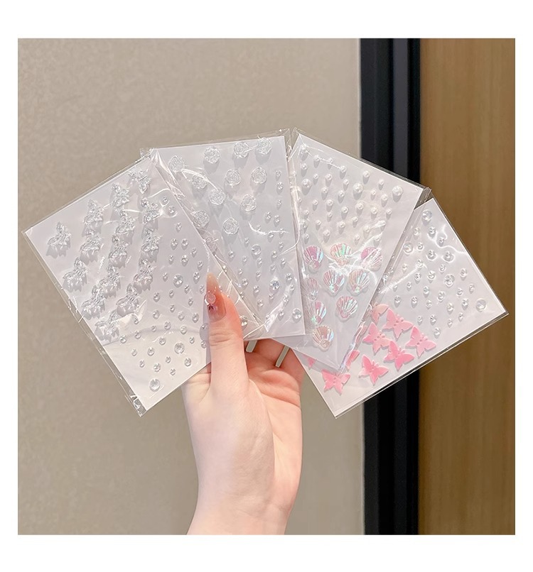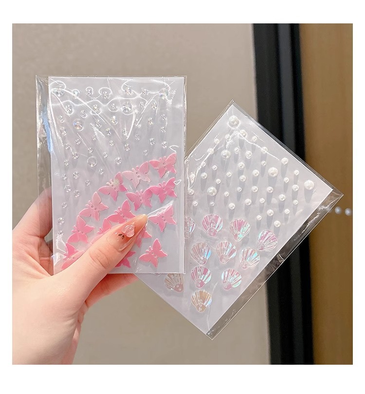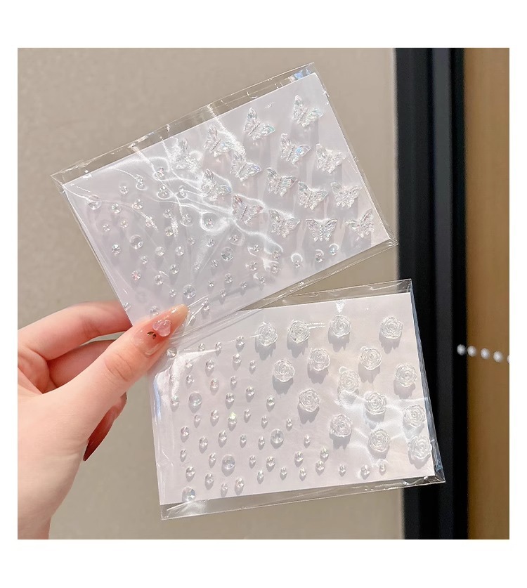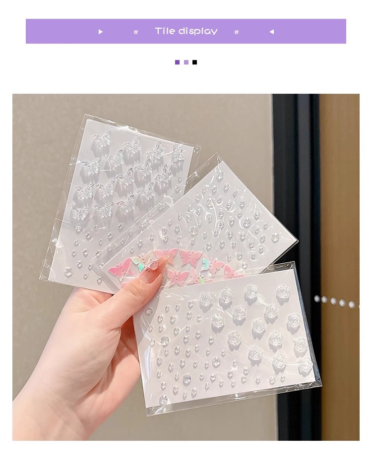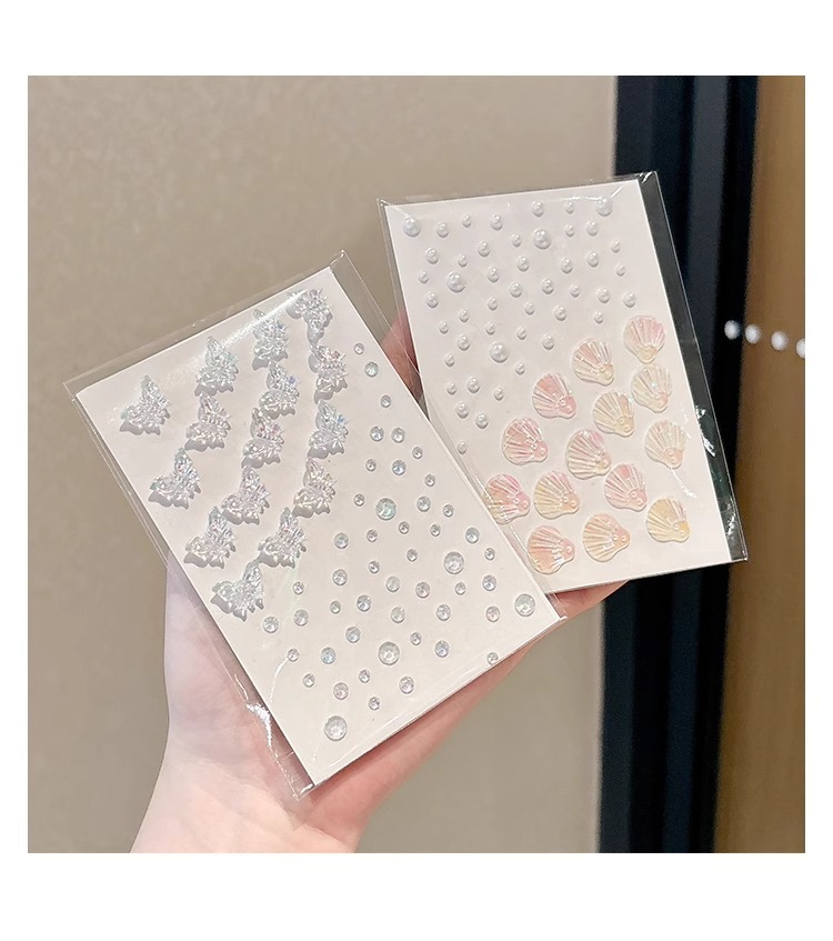 | Color | 4 # rosa de diamante brillante (autoadhesivo), 3 # mariposa de diamante brillante (autoadhesivo), 2 # mariposa de cristal (autoadhesivo), 1 # concha de perla (autoadhesivo) |