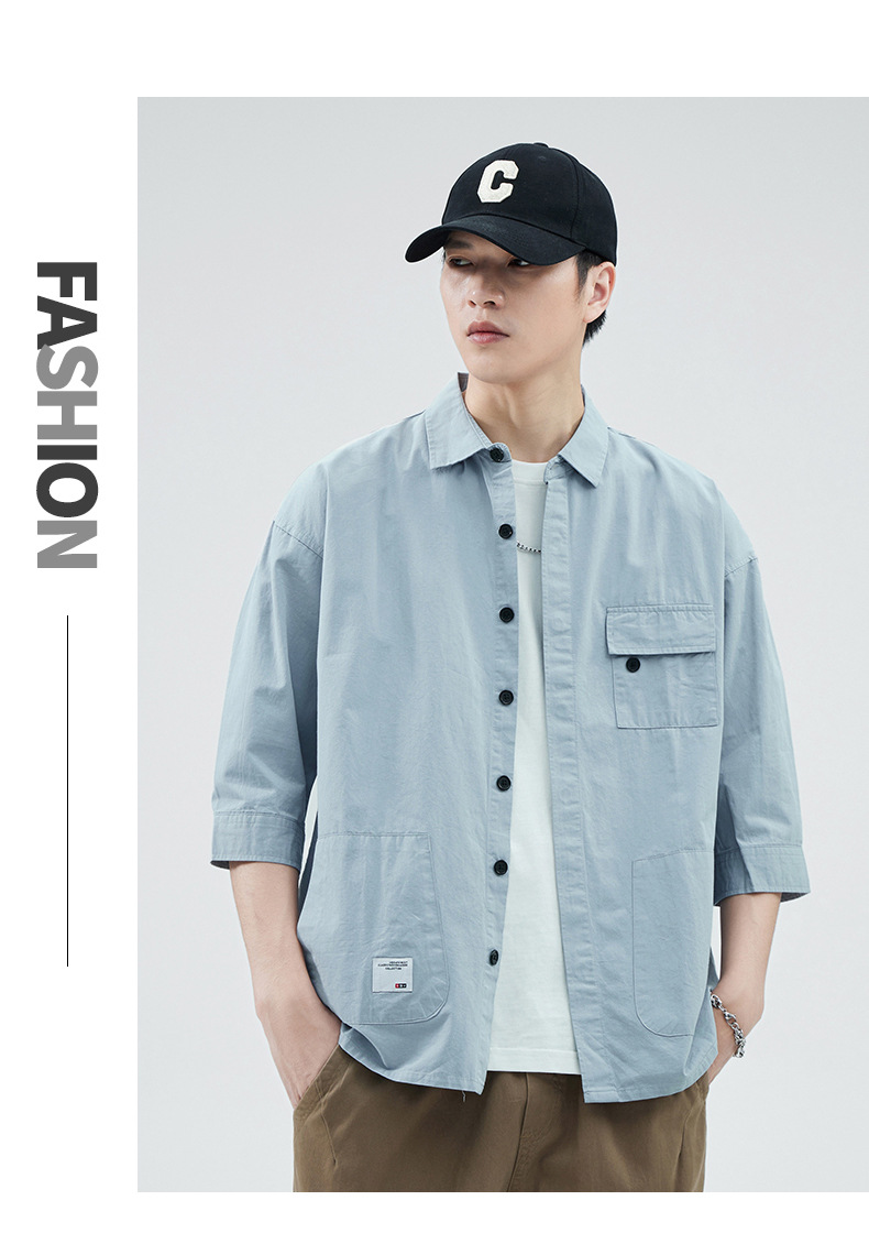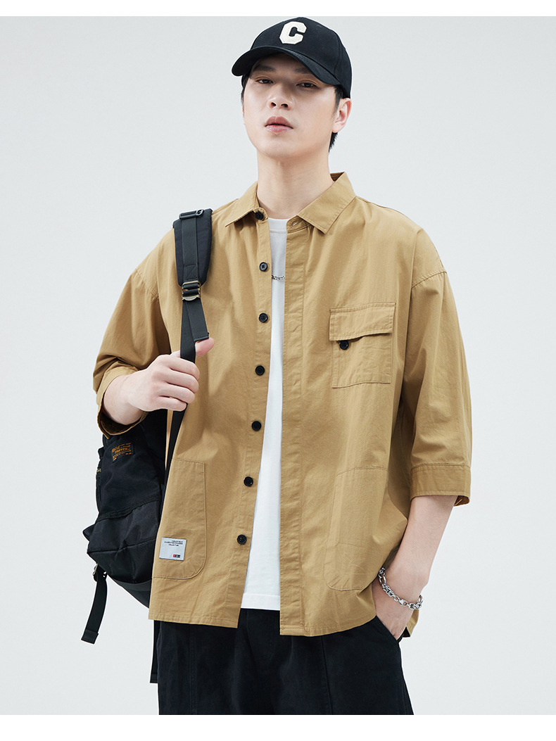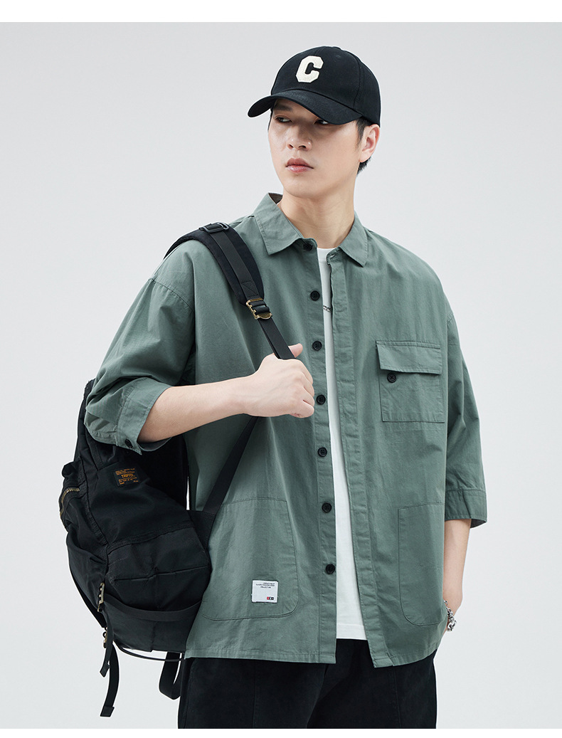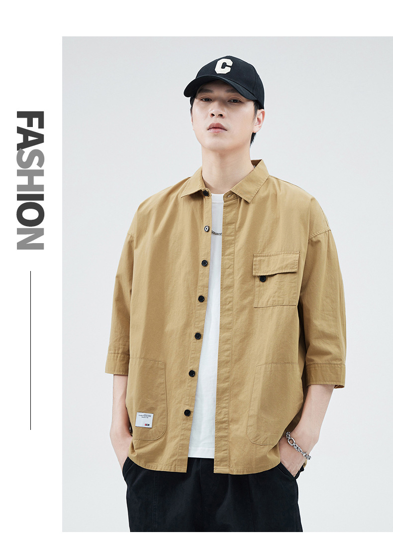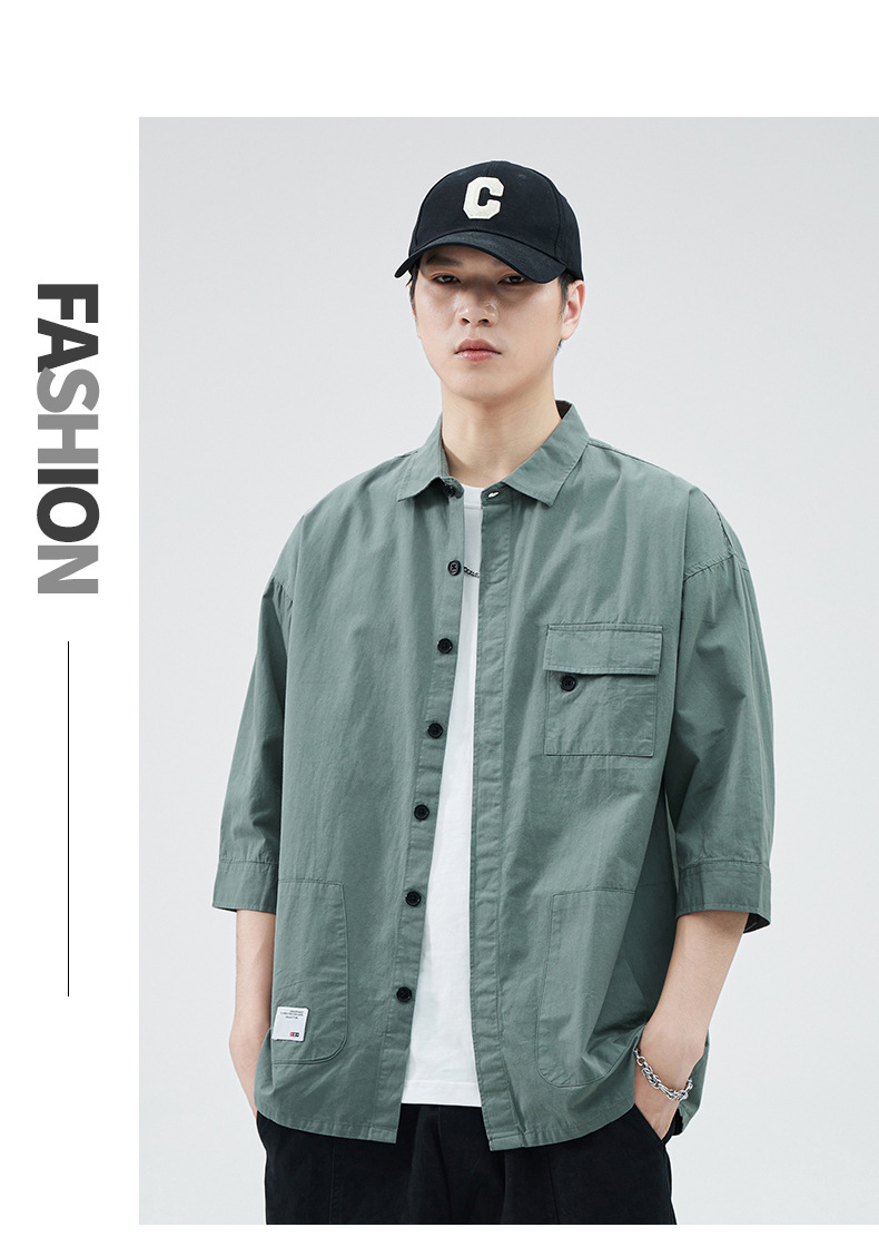 Camisa de trabajo holgada para hombre, primavera y verano, totalmente de algodón, estilo coreano, estilo americano informal, mangas tres cuartos, cuello único, bolsillo, transpirable y que absorbe la humedad.