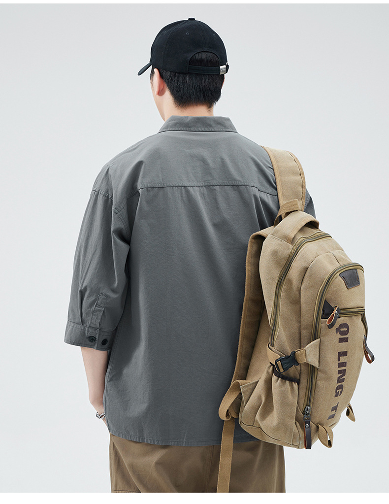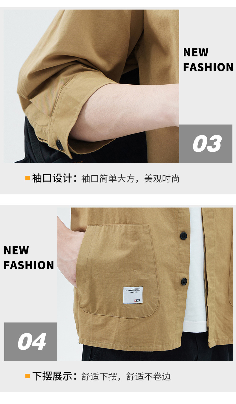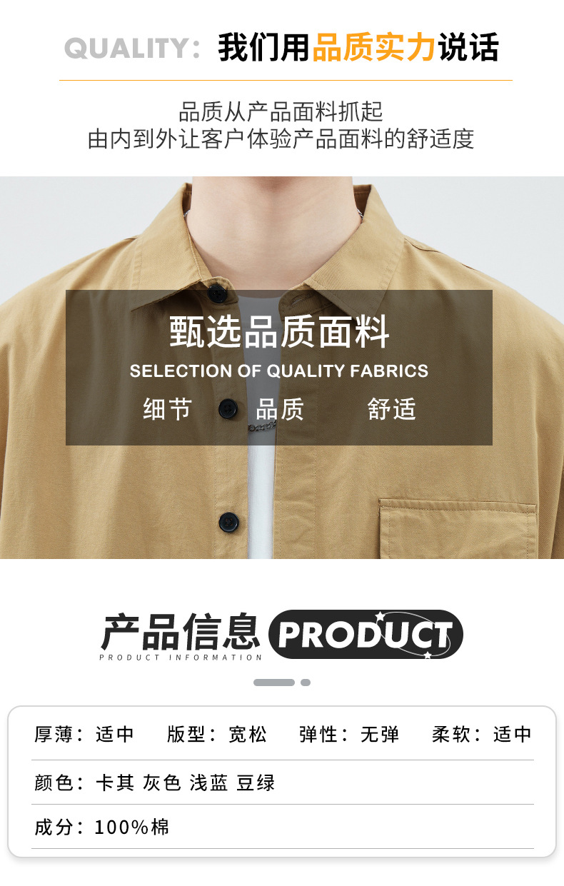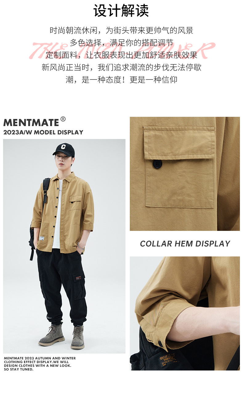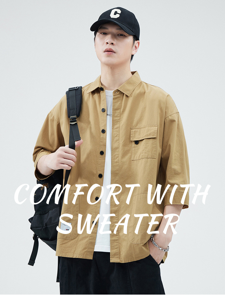 Camisa de trabajo holgada para hombre, primavera y verano, totalmente de algodón, estilo coreano, estilo americano informal, mangas tres cuartos, cuello único, bolsillo, transpirable y que absorbe la humedad.