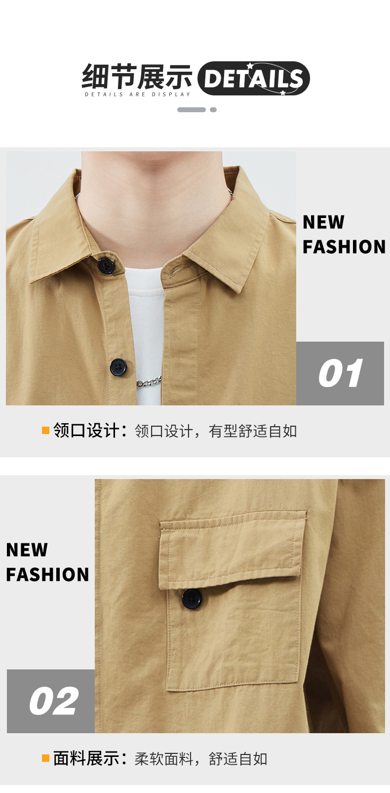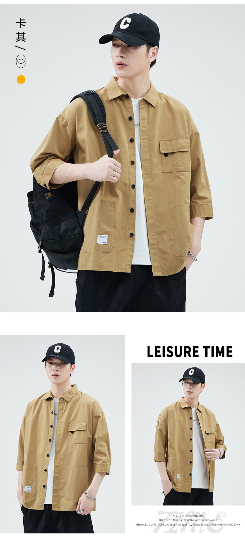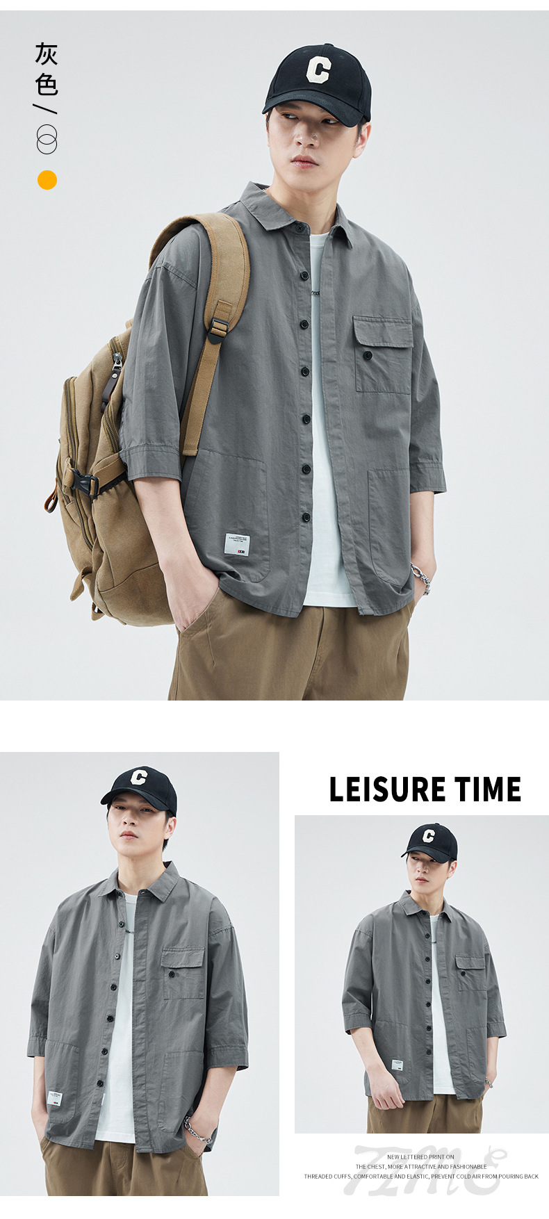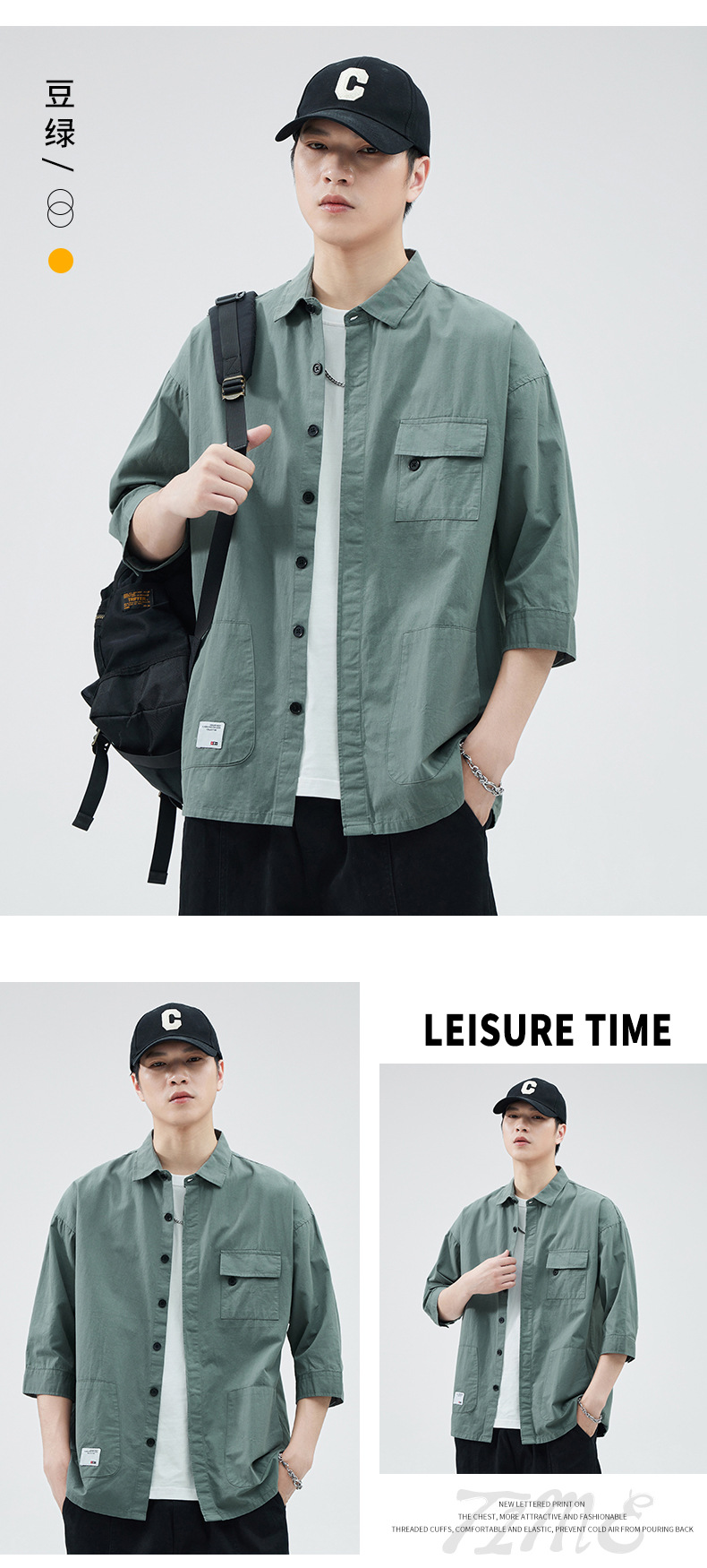 Camisa de trabajo holgada para hombre, primavera y verano, totalmente de algodón, estilo coreano, estilo americano informal, mangas tres cuartos, cuello único, bolsillo, transpirable y que absorbe la humedad.