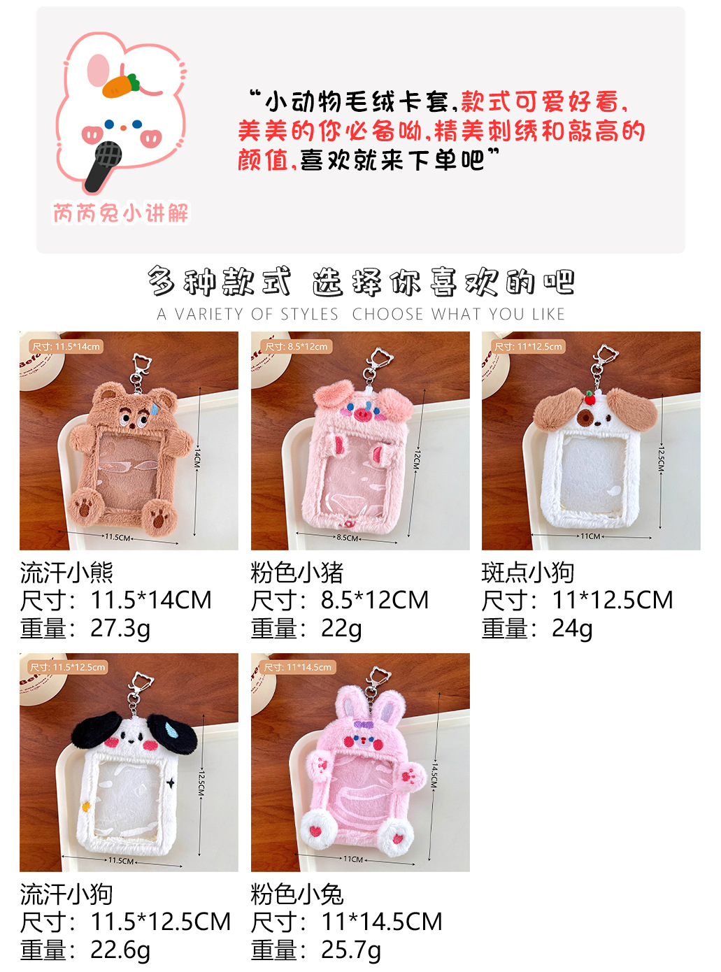 | Colores | 1 # oso sudoroso,2 # Cerdito rosa,4 # Conejito rosa,1 # funda de tarjeta de felpa de melón,2 # Tarjeras de fresa-felpa,4 # Cubierta de tarjetas de felpa de perro blanco |