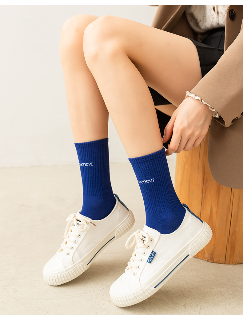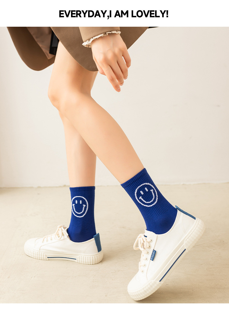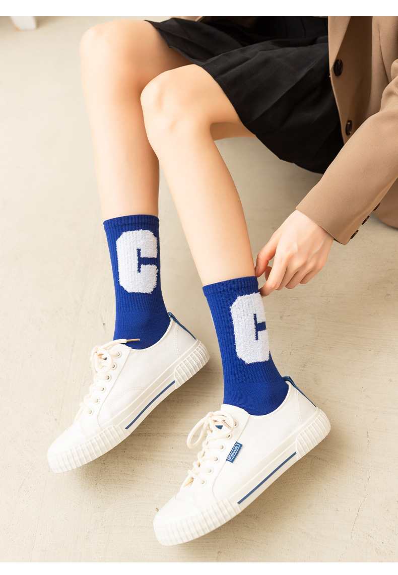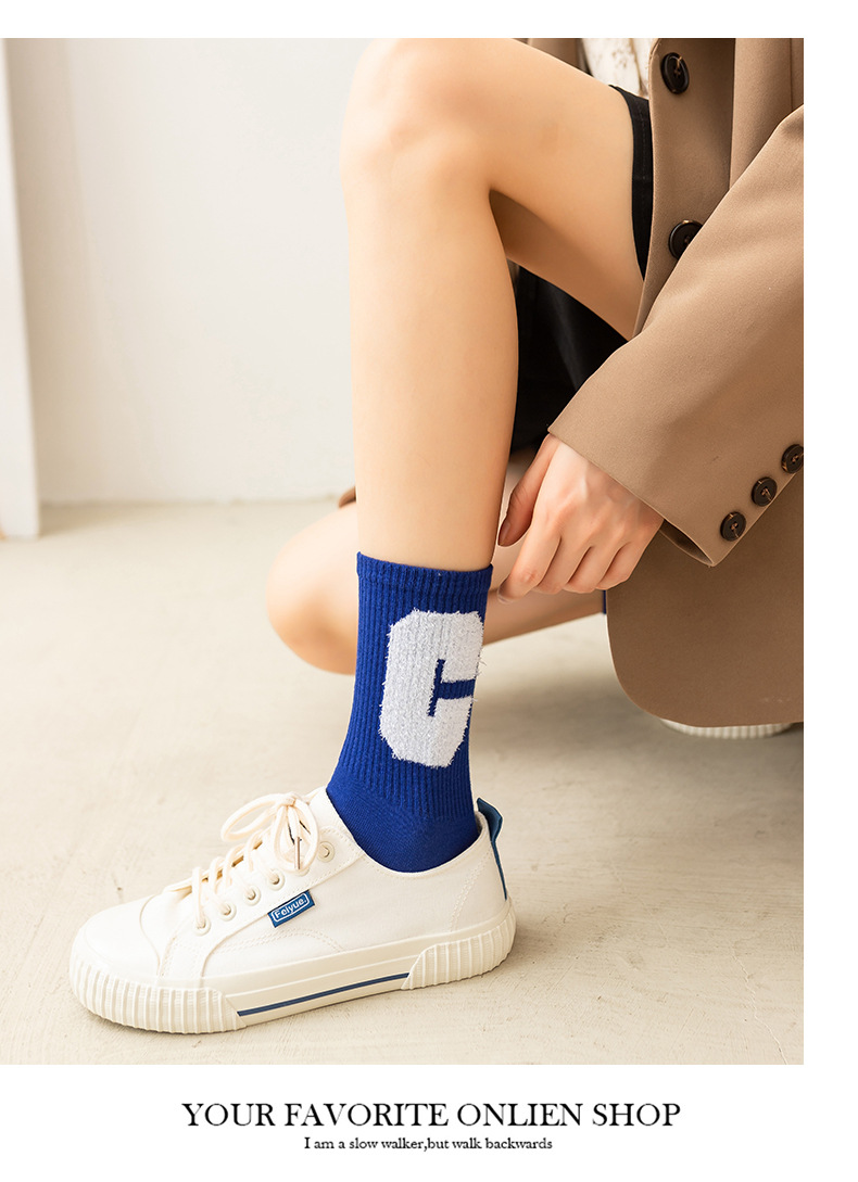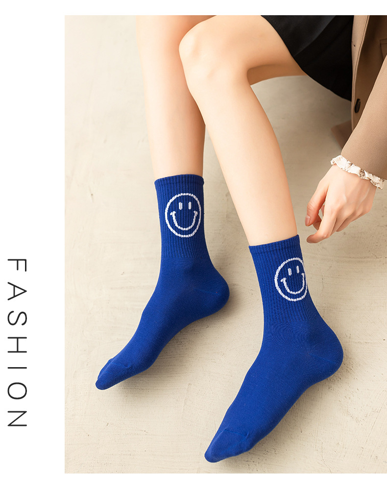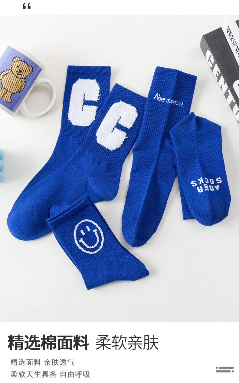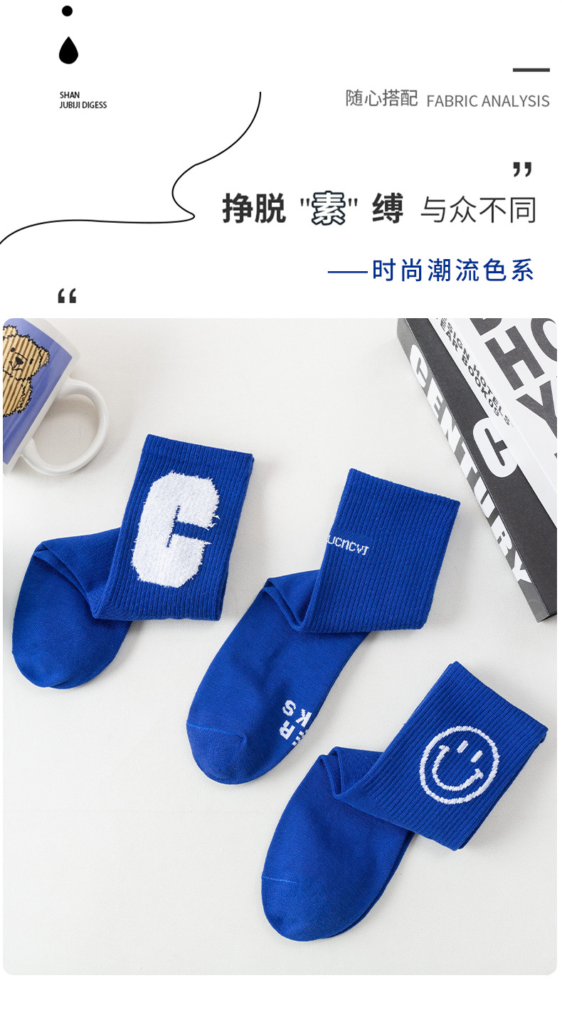 Calcetines de algodón de color puro de otoño e invierno de las mujeres letra grande C estudiante femenino ins moda media pantorrilla Klein azul abajo hilo calcetines de cara sonriente
