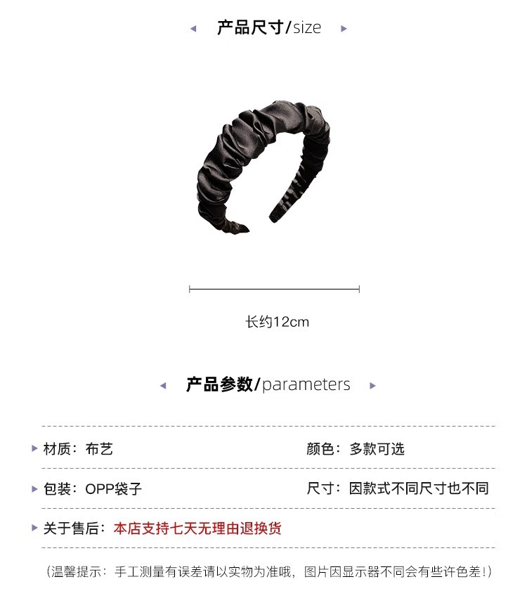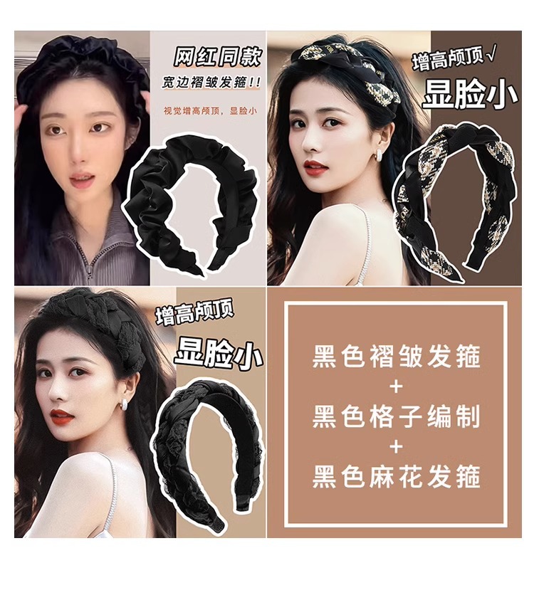 | Colores | 3 # Pliegues negro (medio).,Diadema rosa pastel.,Diadema negra de alta calidad.,Diadema de celosía negra.,Trenza de malla negra negra.,Diadema torcida negra.,Flores de malla negra.,Diadema plisada negra.,Diadema con lazo.,-Marrón amarillento.,Verde pavo real.,Diadema plisada blanca lechosa.,Diadema de pata de gallo.,Diadema de café ligero.,Estilo de diamantes de imitación.,Flores de malla transparente.,Diadema champán.,La misma diadema de Yang Mi.,Yu Shuxin tiene el mismo estilo.,Perla negra.,Estilo perla.,Arroz blanco perlado.,Diadema morada. |