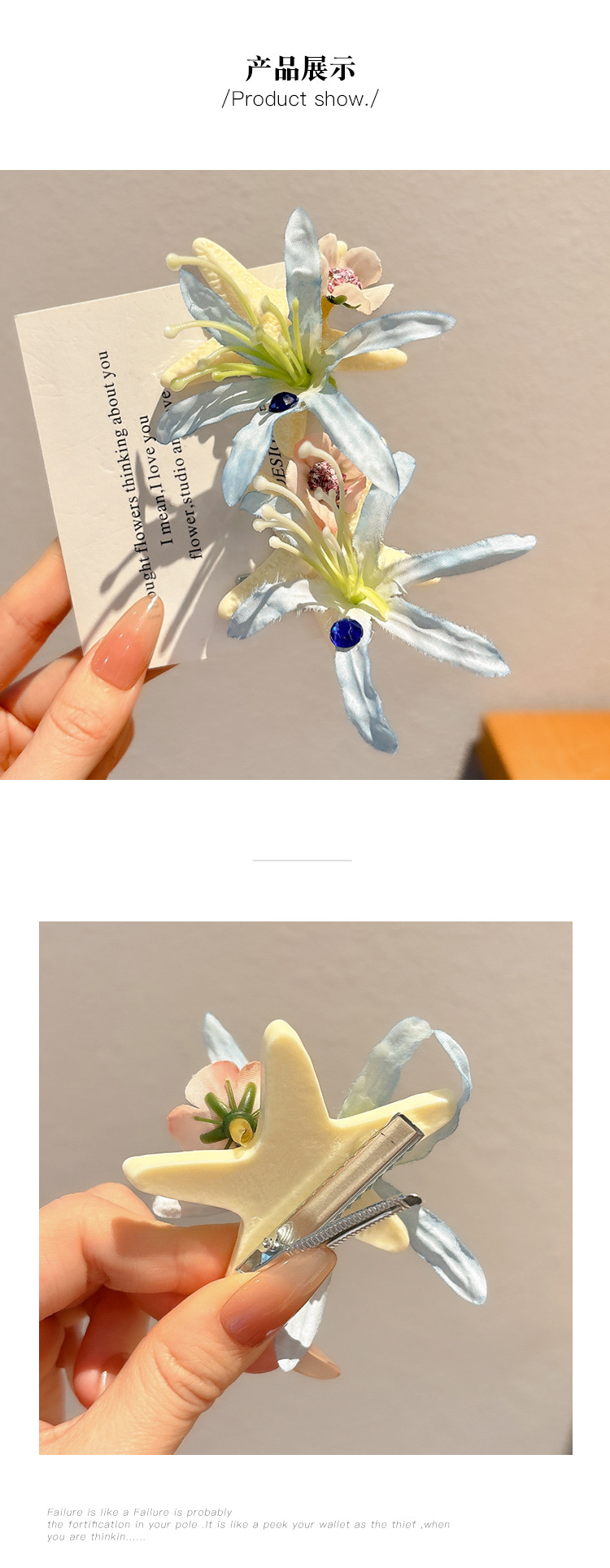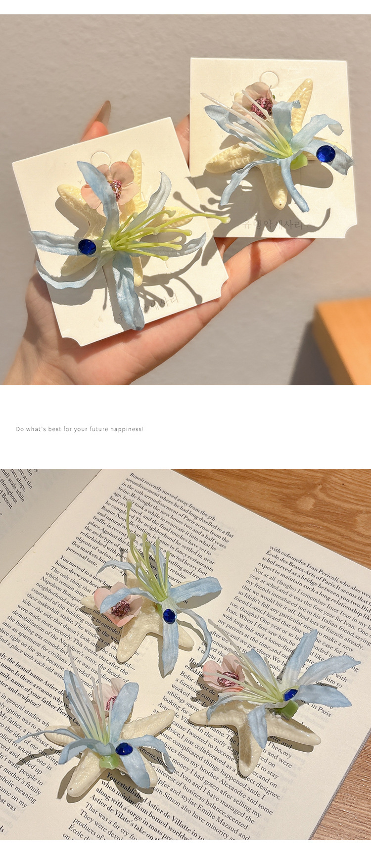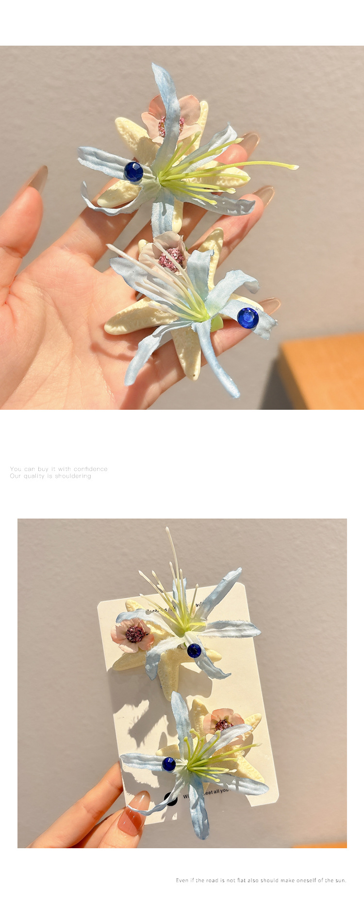 Tela con incrustaciones de diamantes, flor, estrella de mar, horquilla, nuevo estilo de vacaciones junto al mar, clip de pico de pato fresco, clip lateral dulce, accesorios para el cabello
