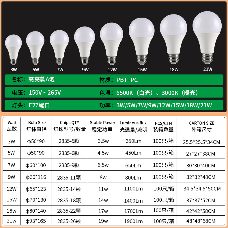 | Poder | Una burbuja-3W [eficiencia energética secundaria],Una burbuja-5W [eficiencia energética secundaria],Una burbuja-7W [eficiencia energética secundaria],Una burbuja-9W [eficiencia energética secundaria],Una burbuja-12W [eficiencia energética secundaria],Una burbuja-15W [eficiencia energética secundaria],Una burbuja-18W [eficiencia energética secundaria],Una burbuja-21W [Eficiencia energética secundaria],Diamante de segunda generación-5W [eficiencia energética secundaria],Diamante 2 generaciones-10W [Eficiencia energética secundaria],Diamante 2 generaciones-15W [Eficiencia energética secundaria],Diamante de segunda generación-20W [eficiencia energética secundaria],Diamante de segunda generación-30W [eficiencia energética secundaria],Diamante 2 generaciones-40W [Eficiencia energética secundaria],Diamante 2 generaciones-50W [Eficiencia energética secundaria],Diamante de segunda generación-60W [eficiencia energética secundaria],Bombilla E27 portalámparas (bolsa independiente) |