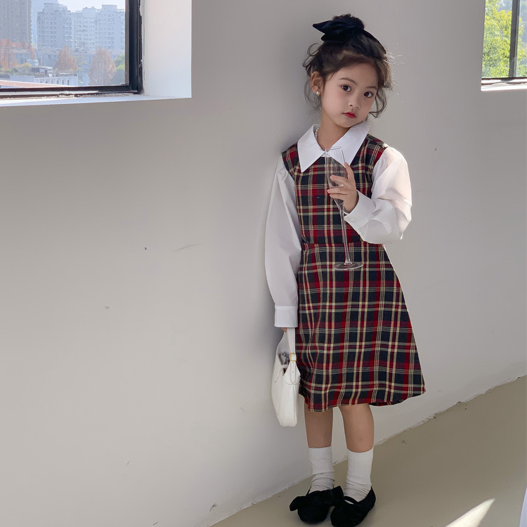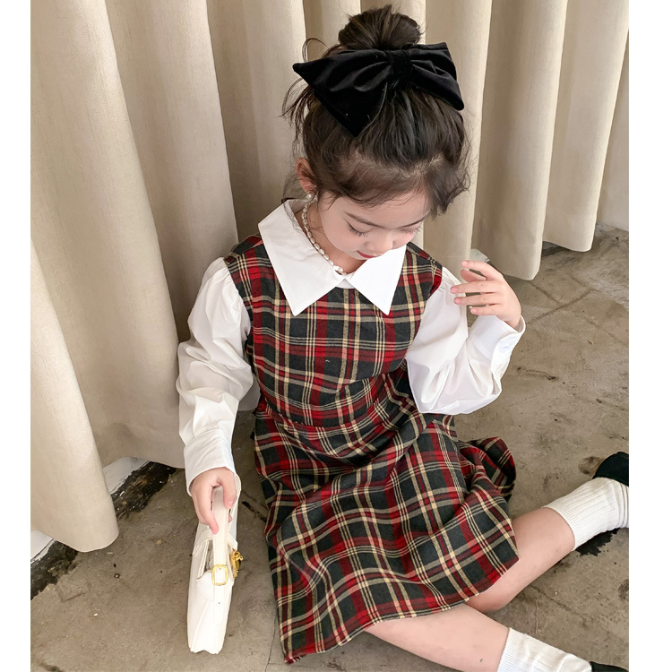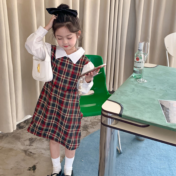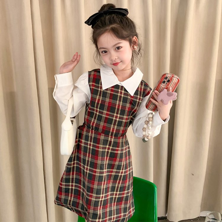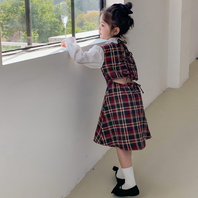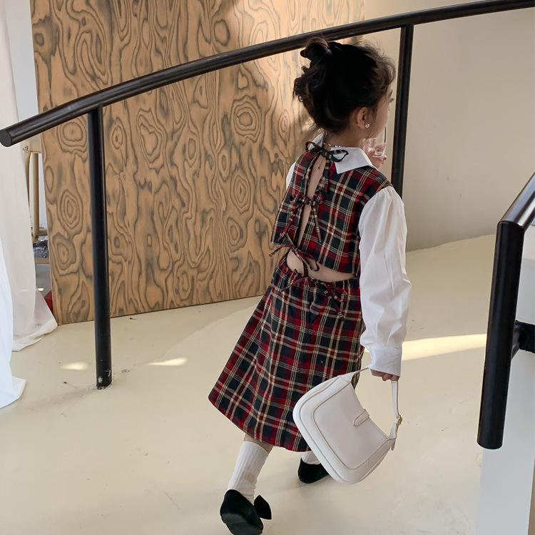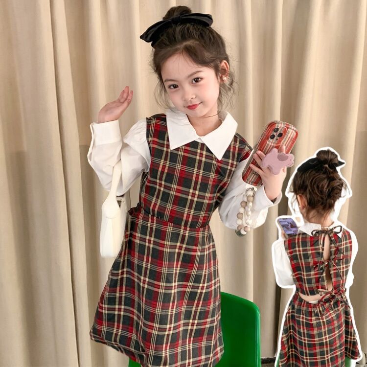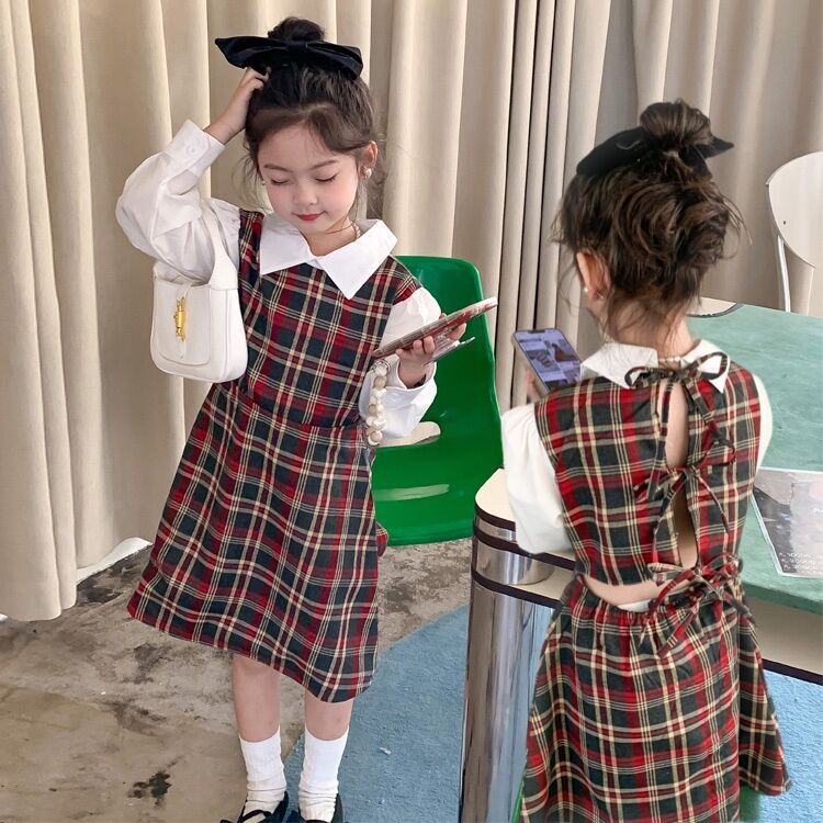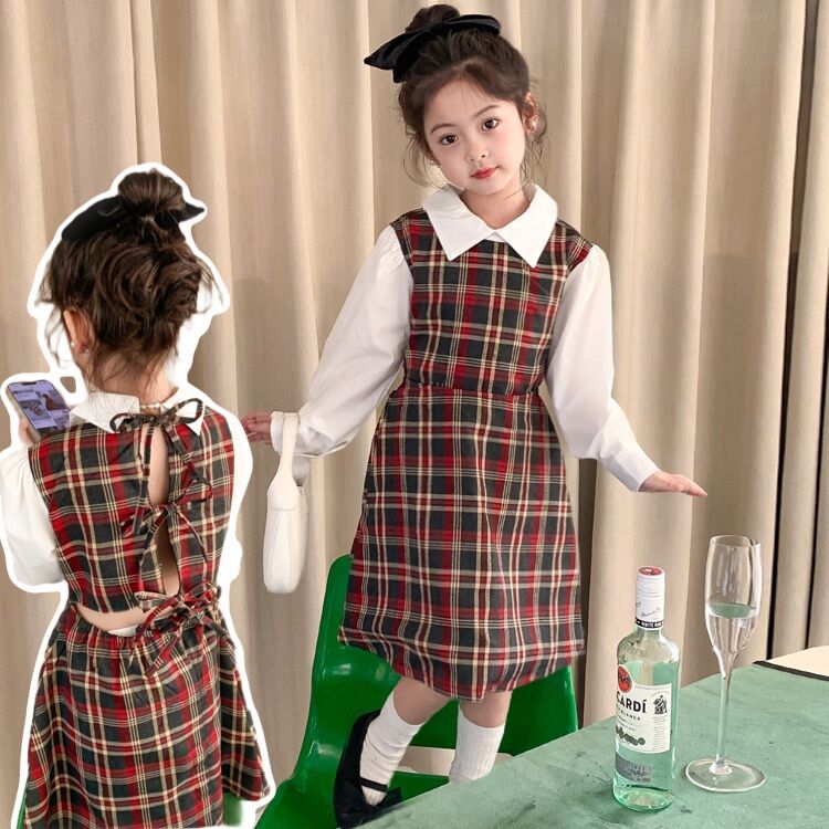 Vestido DE LOS NIÑOS 2024 primavera nuevas niñas vestido de camisa a cuadros sin espalda Medio y grandes niños niñas estilo universitario vestido falda
