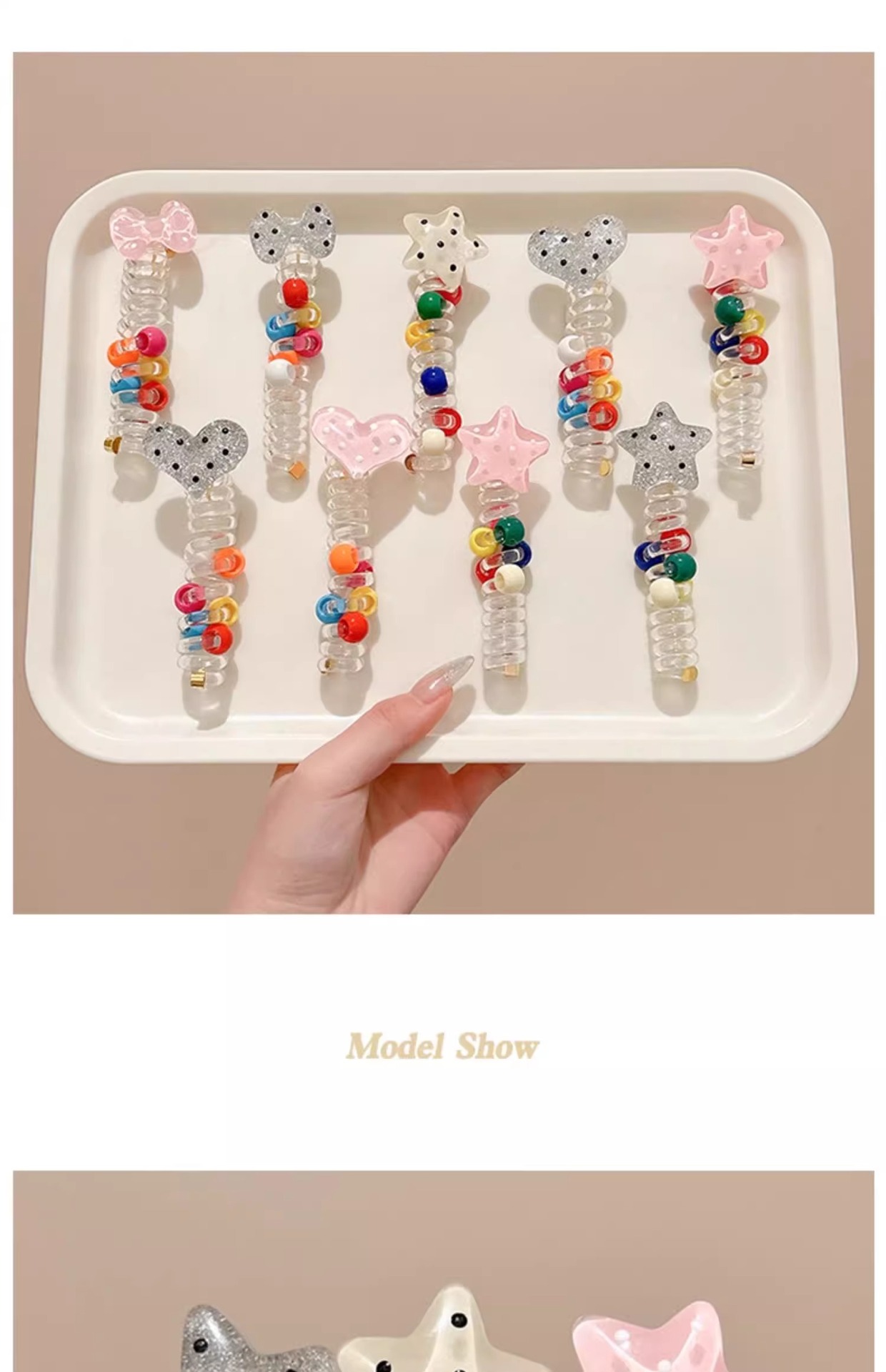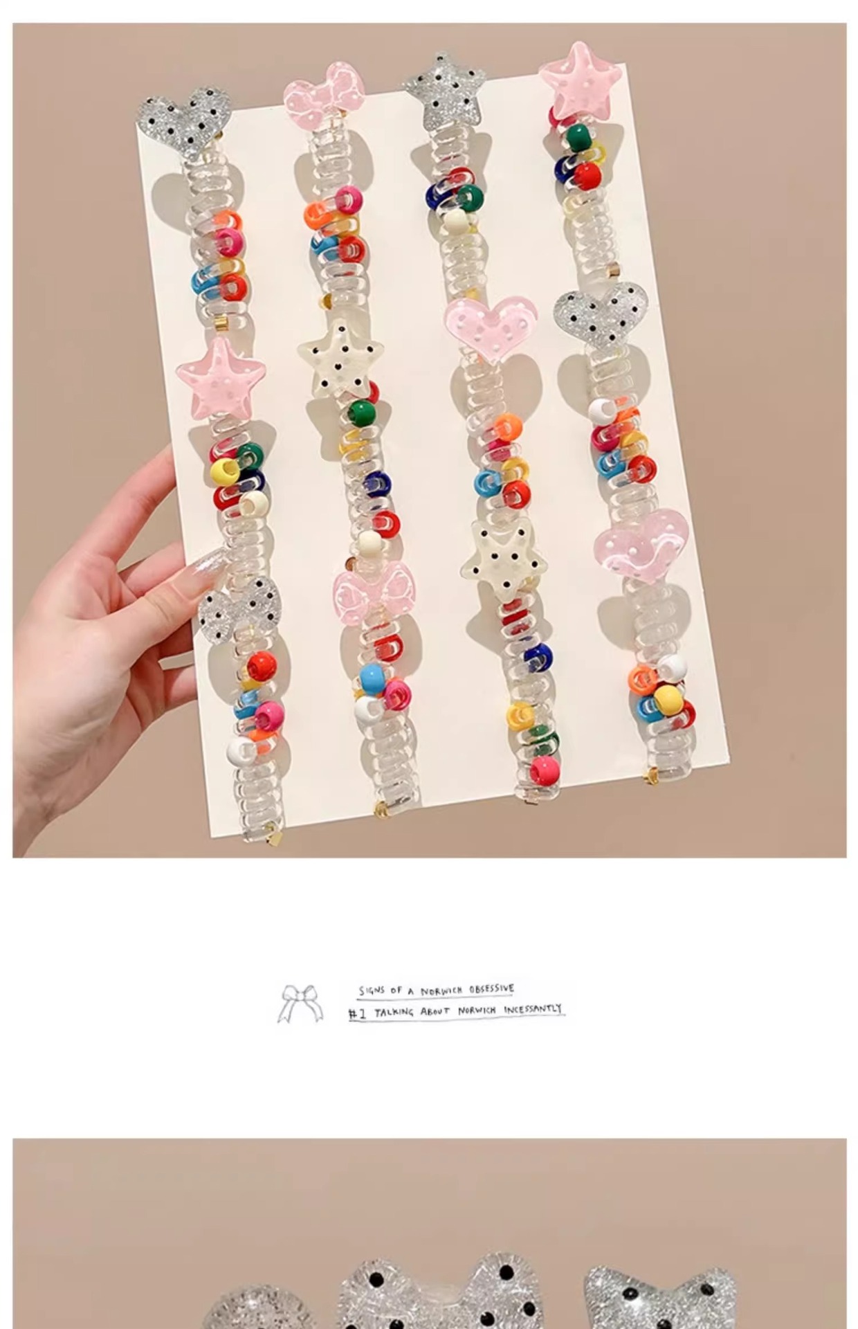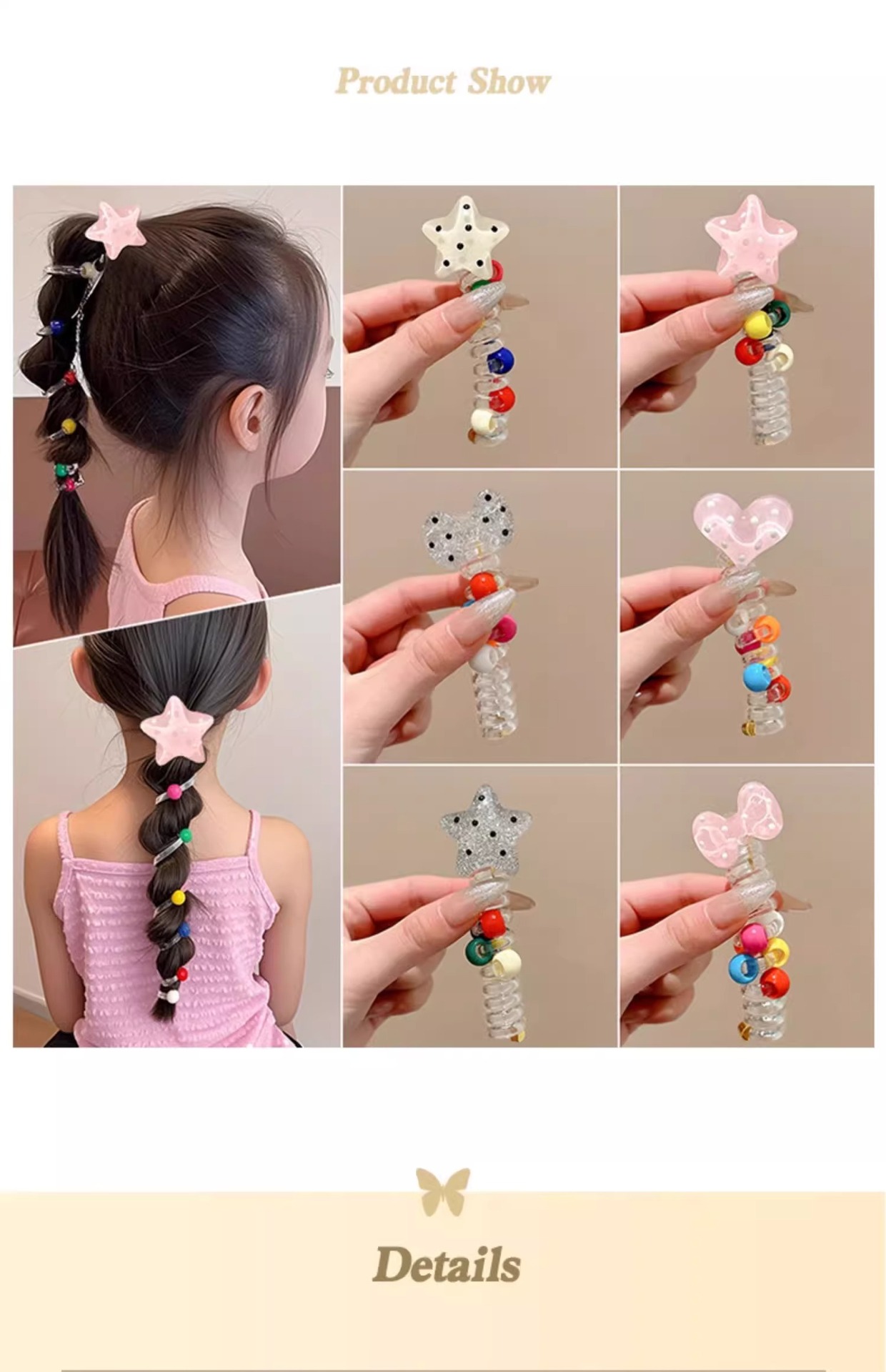 | Color | 3 estrellas beige 1, 7 estrellas rosas claras 1, 8 lazos rosas 1, 12 amores rosas 1, 15 estrellas grises plateadas 1, 18 cuentas blancas tejiendo anillos de pelo |