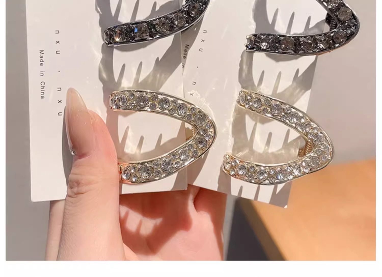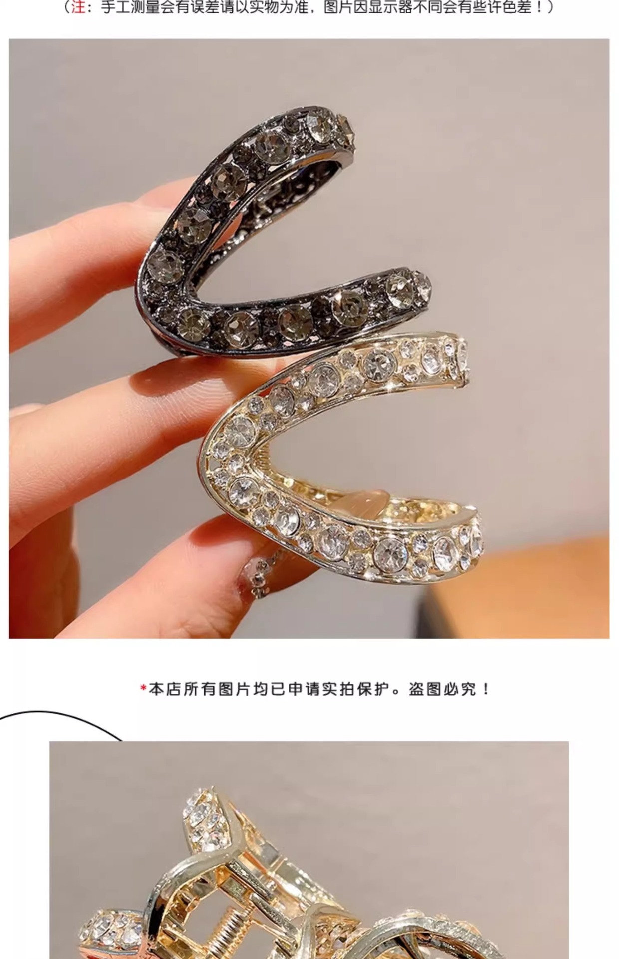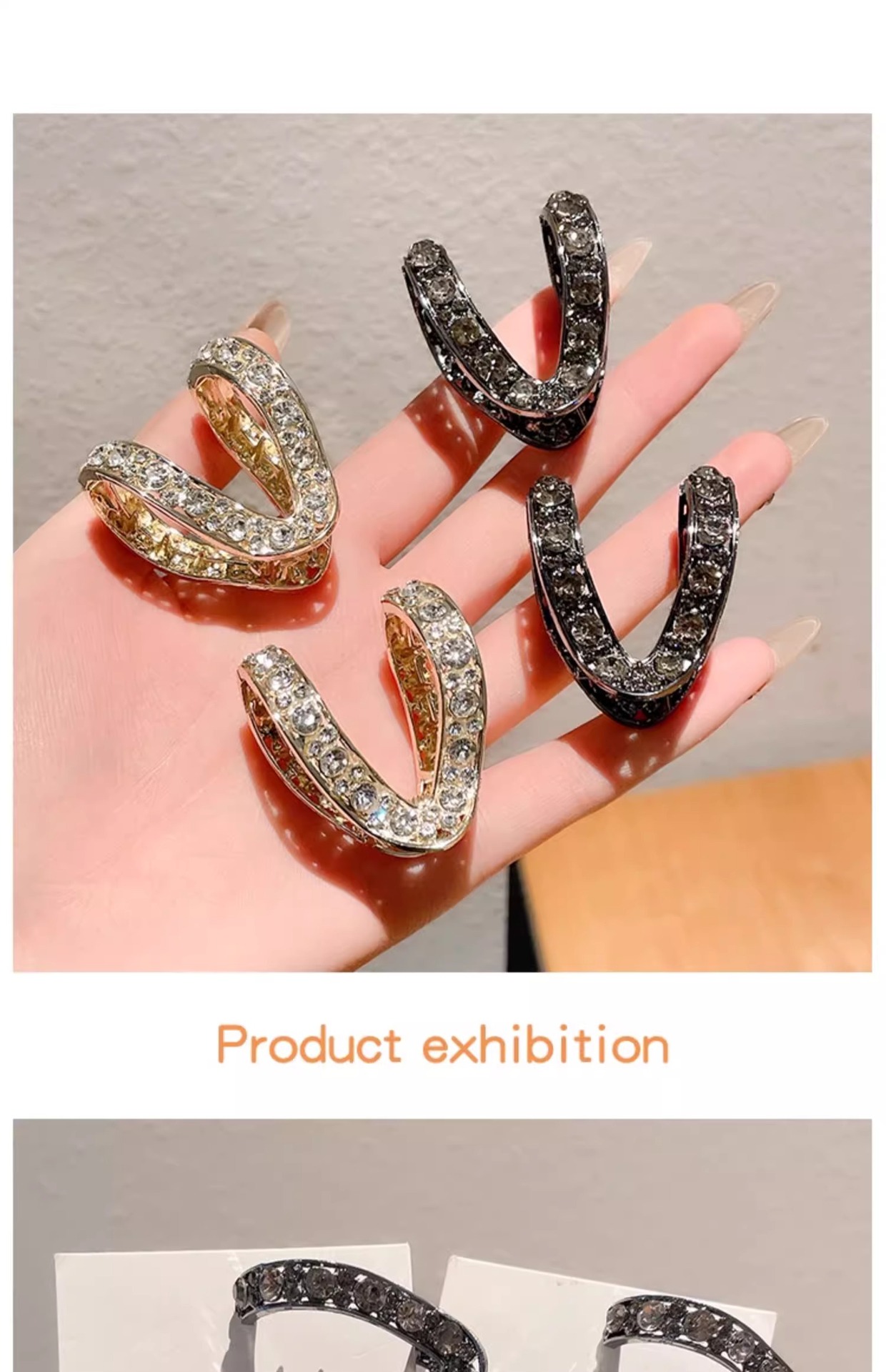 | Color | Tipo V negro de pistola - aproximadamente 4,5 cm, V dorada - unos 4,5 cm, Picante y asfixiante Negro - unos 5,5 cm, Dorado tierno - unos 5,5 cm, Diamante de agua plateado - aproximadamente 5c, Diamante de champán - unos 5 cm. |