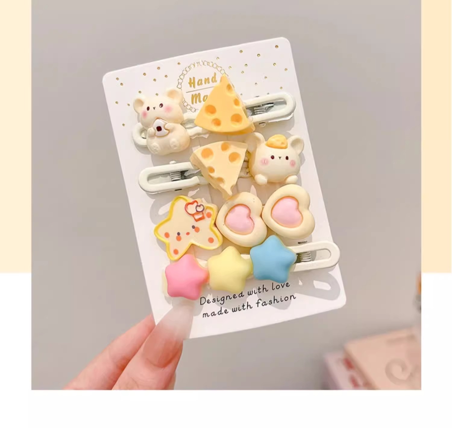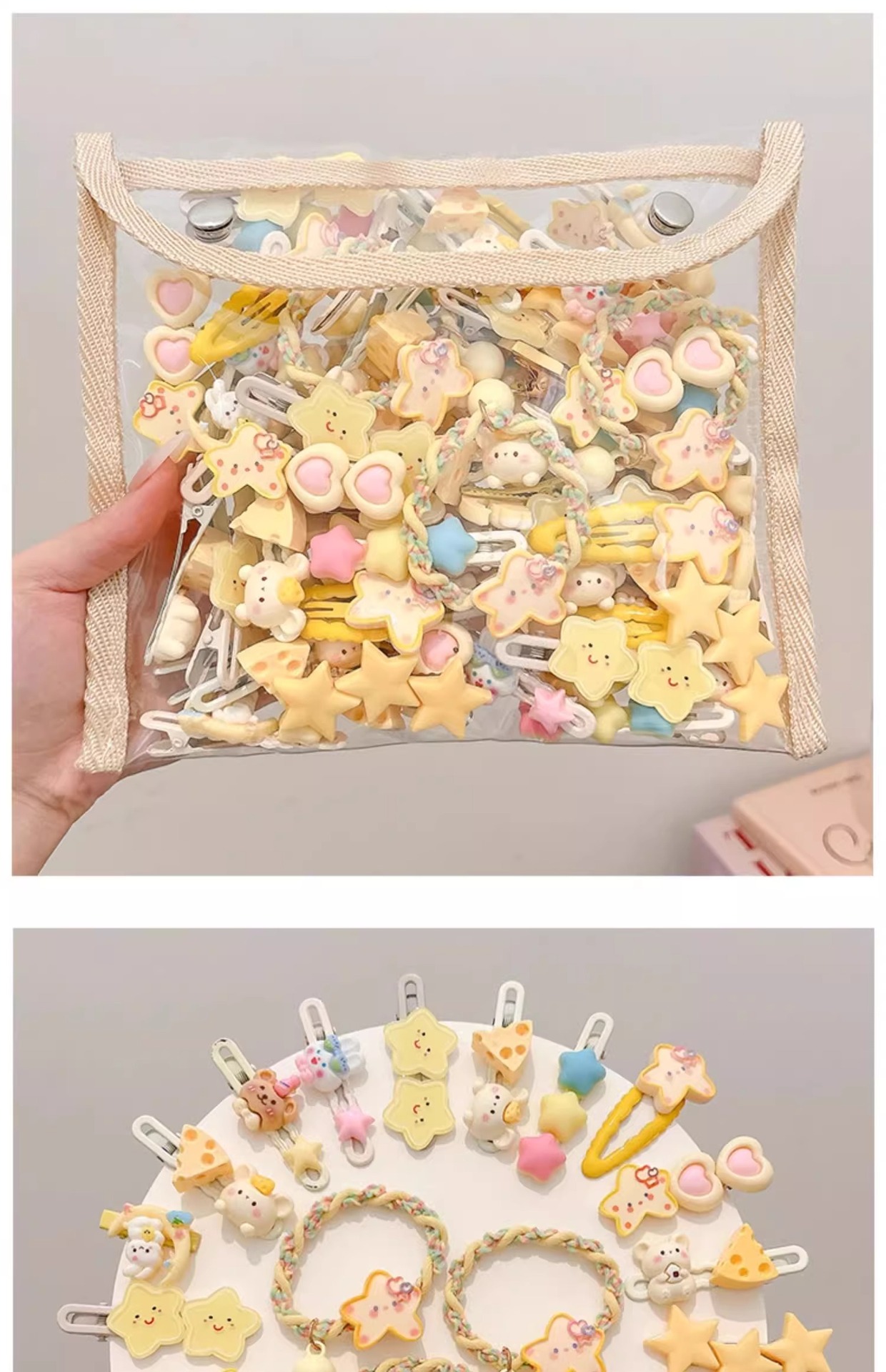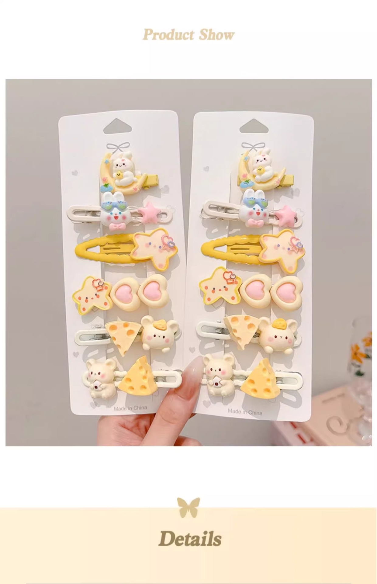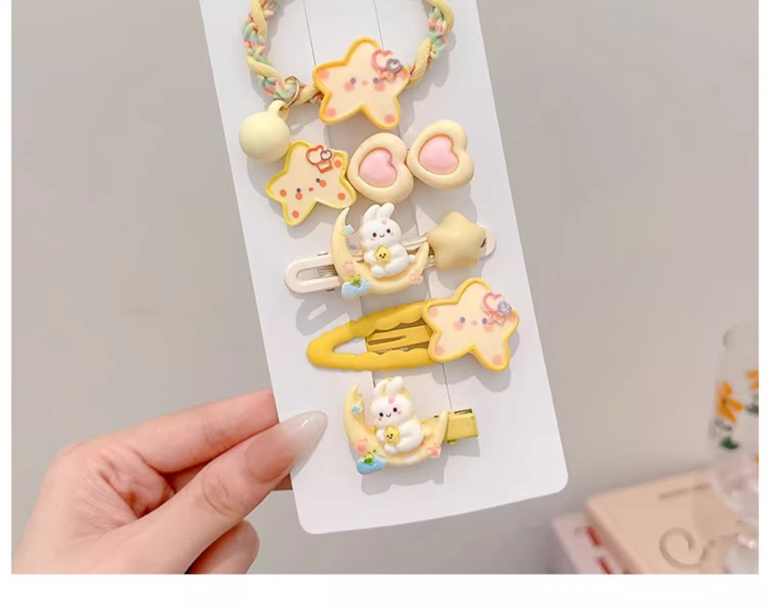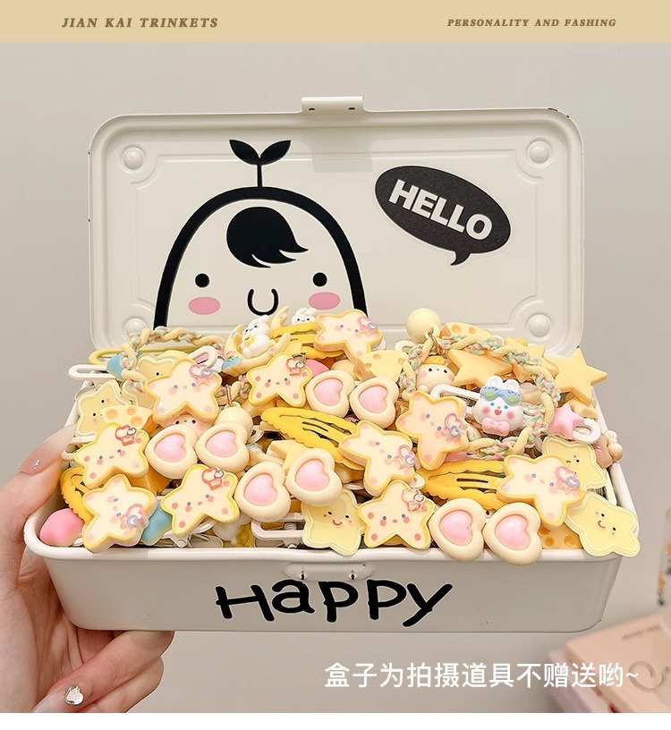| Color | 23 # Boca de la luna, 22 # estrella de pentacos 2 piezas., 21 # conejos 2 piezas., 20 # elíptico amarillo 3 piezas. 19 # anillo de pelo 4 piezas., 18 # ratón de queso. 17 # crema tricolor pentagrama, #16 Hat Bear, 15 # Clip de estrellas bb., 14 # ratón de arroz, 13 # Moon Rabbit Hairpin. 8 # Star Hairpin, Un par de clips # 6bb. 5 # Star Hair Ring, 2 # anillo de pelo 2 piezas. |