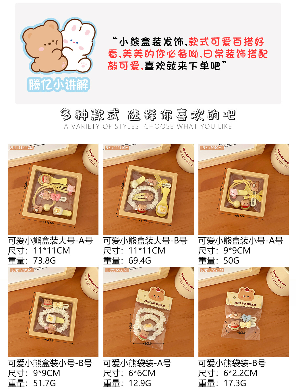 | Color | 4 # adorable oso pequeño en caja - tamaño B, 1 # adorable conejo conjunto de accesorios para el cabello - bolsa, 2 # adorable conejo conjunto de accesorios para el cabello - caja pequeña [Tamaño A], 3 # adorable conejo conjunto de accesorios para el cabello - caja pequeña [Tamaño B], 4 # adorable conejo conjunto de accesorios para el cabello - caja grande [Tamaño A], 5 # adorable conejo conjunto de accesorios para el cabello - caja grande [Tamaño B] |