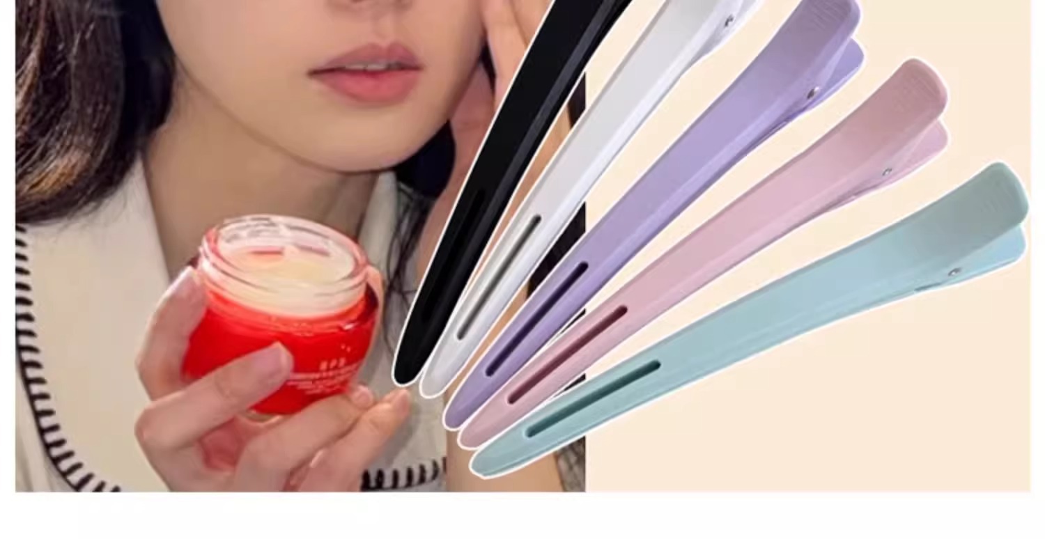 Clip de cabello sin marca especial para lavar la cara y maquillaje con clip de boca de pato posicionado en la parte lateral de la frente frente