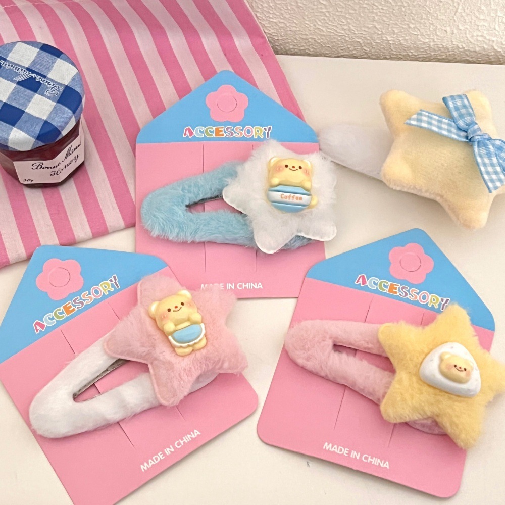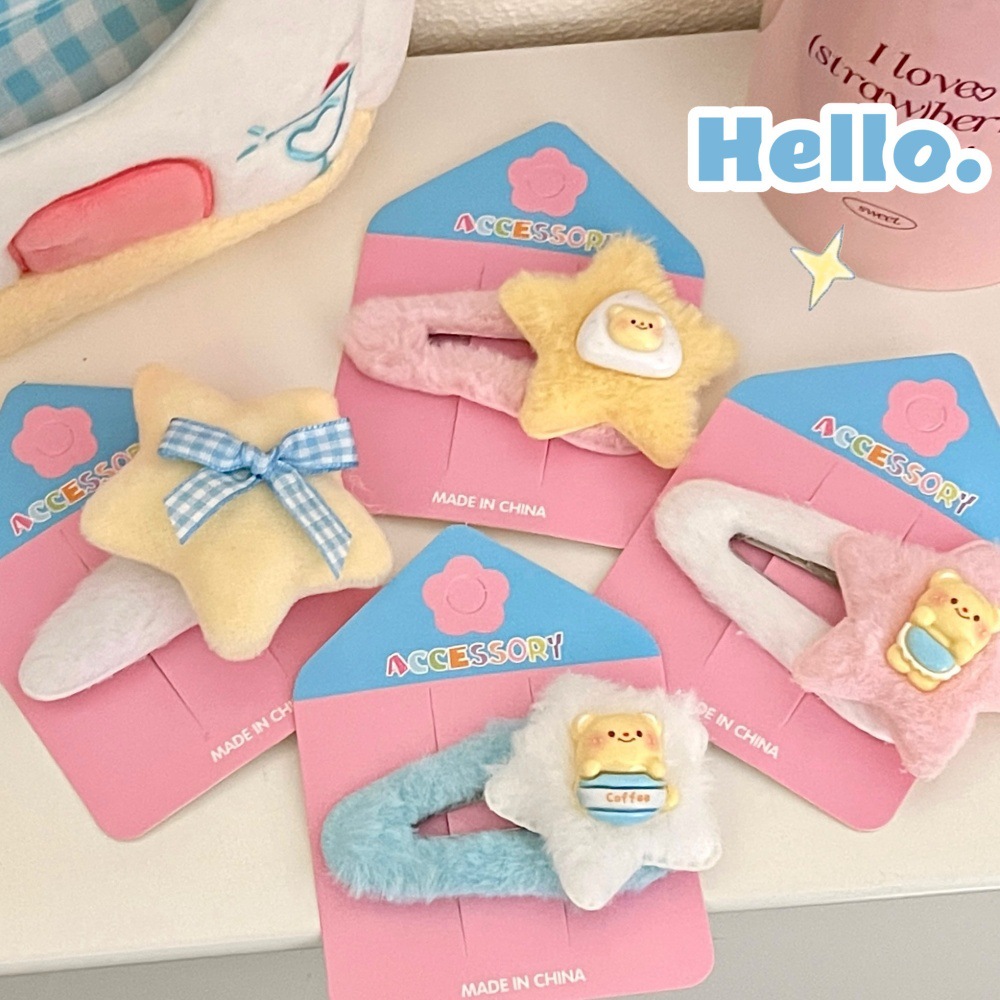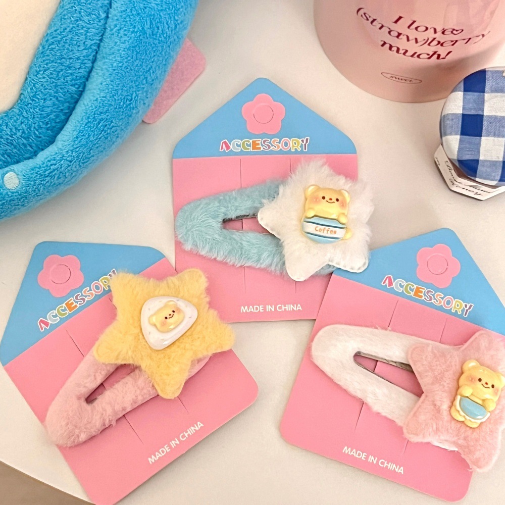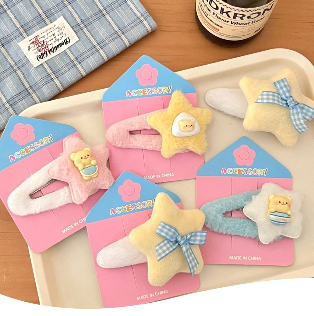 Primavera y verano lindas estrellas de peluche BB clips para niños dibujos animados joyeros para el cabello de la niña corazón de dopamina doble frangeo clip para el cabello roto