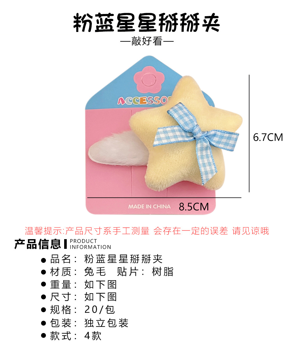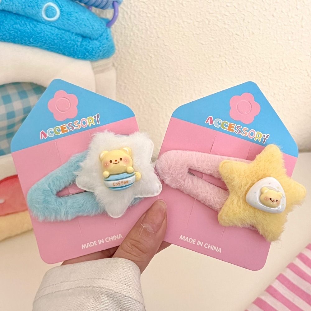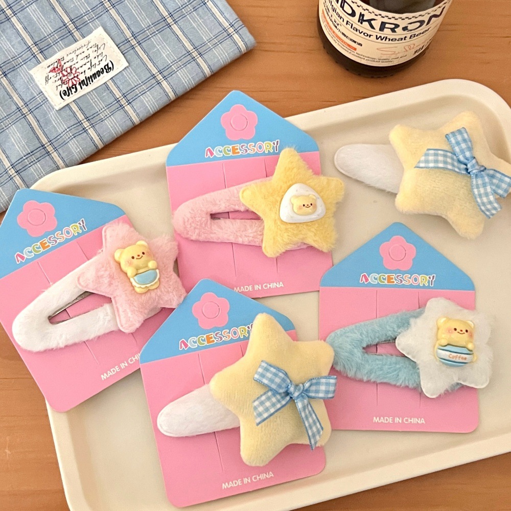 Primavera y verano lindas estrellas de peluche BB clips para niños dibujos animados joyeros para el cabello de la niña corazón de dopamina doble frangeo clip para el cabello roto