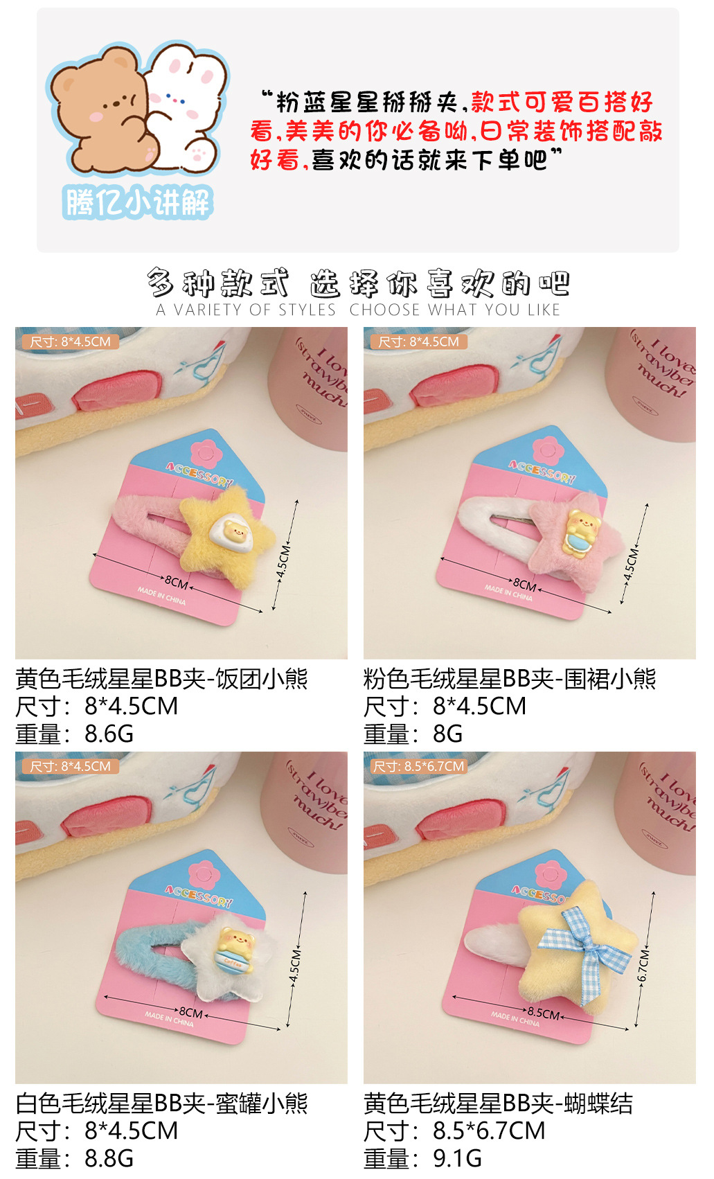 | Color | 1 clip bb de estrella de terciopelo amarillo - oso de bola de arroz, 3 clip bb de estrella de terciopelo blanco - oso de miel, 1 clip de estrella de terciopelo rosa - lazo, 2 clip de estrella de terciopelo amarillo - lazo, 3 clip de estrella de terciopelo blanco - lazo, 4 clip de estrella de terciopelo amarillo - lazo pequeño, 5 clip de estrella de terciopelo blanco y lindo - pequeño lazo, 7 clip de amor de terciopelo rosa - gran lazo |