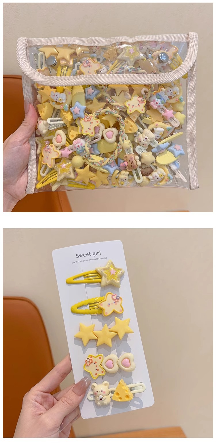 | Color | 16 piezas de perlas colgantes de estrella de cinco puntas - 2 piezas, 15 piezas cortas de conejo de la Luna - 2 piezas, 14 piezas de conejo de la Luna - 2 piezas, 13 piezas de conejo de gafas - 2 piezas, 12 piezas de amor de la estrella - 2 piezas, 11 piezas de azul estrella - 2 piezas, 10 piezas de clip de onda de estrella de cinco puntas - 2 piezas, 9 piezas de clip de pico de pato de doble corazón de melocotón - 2 piezas, 8 piezas de clip de pelo de tres estrellas - 2 piezas, 7 piezas de rata de queso - 2 piezas, 6 piezas de sombrero de oso 2 piezas, 5 ¿ dos horquillas de estrellas - 2 piezas, 4 ¿ estrellas amarillas - 2 piezas, 3 ¿ estrellas amarillas de cinco puntas - 2 piezas, 2 ¿ estrellas amarillas dobles - 2 piezas, 1 ¿ rata de bola de arroz - 2 piezas |