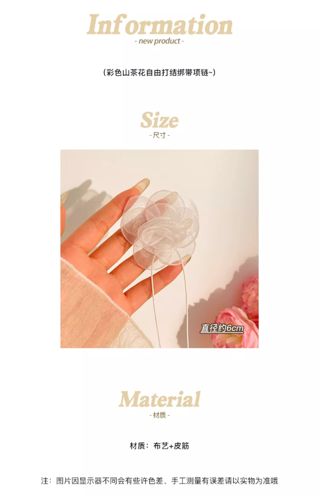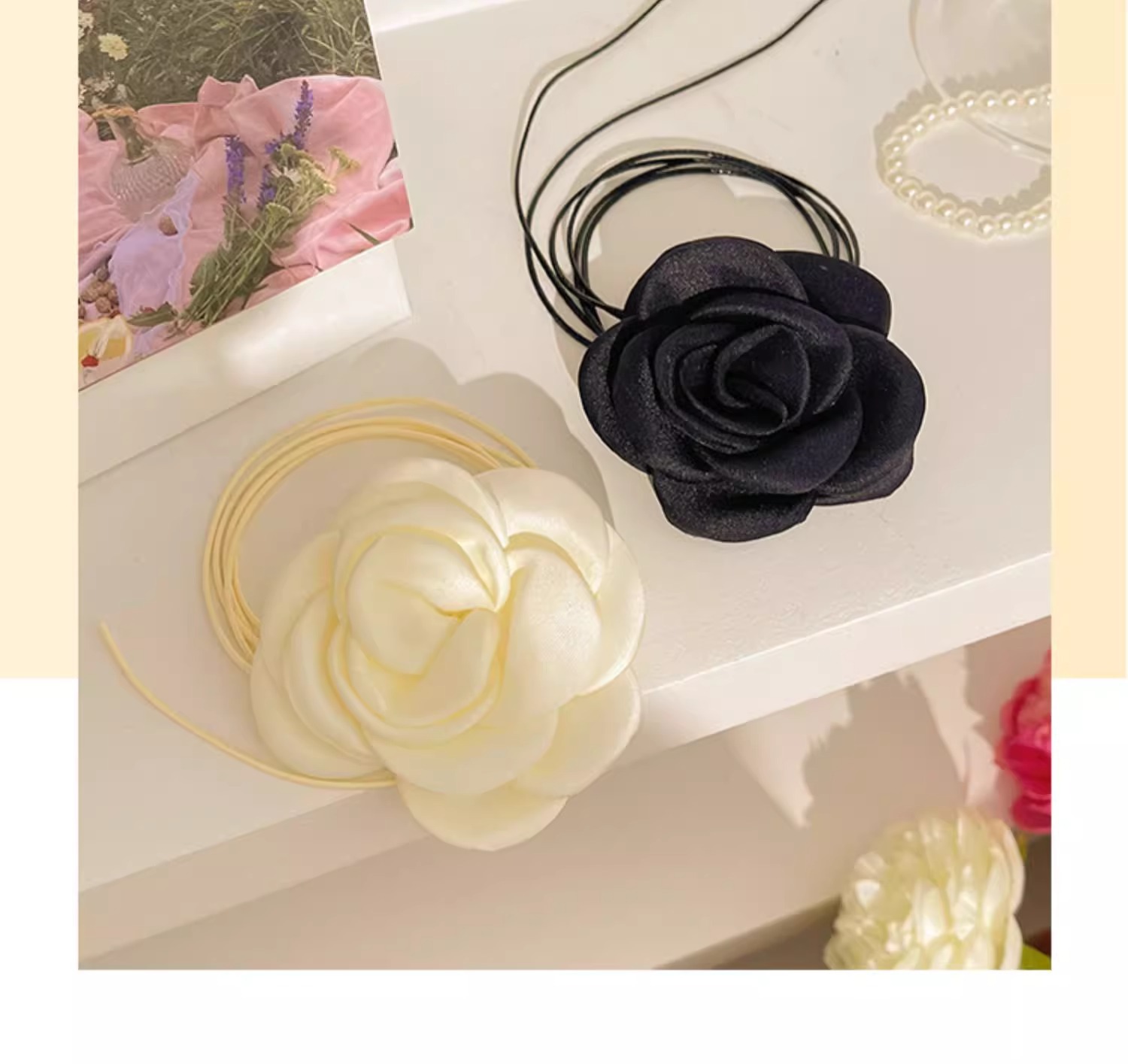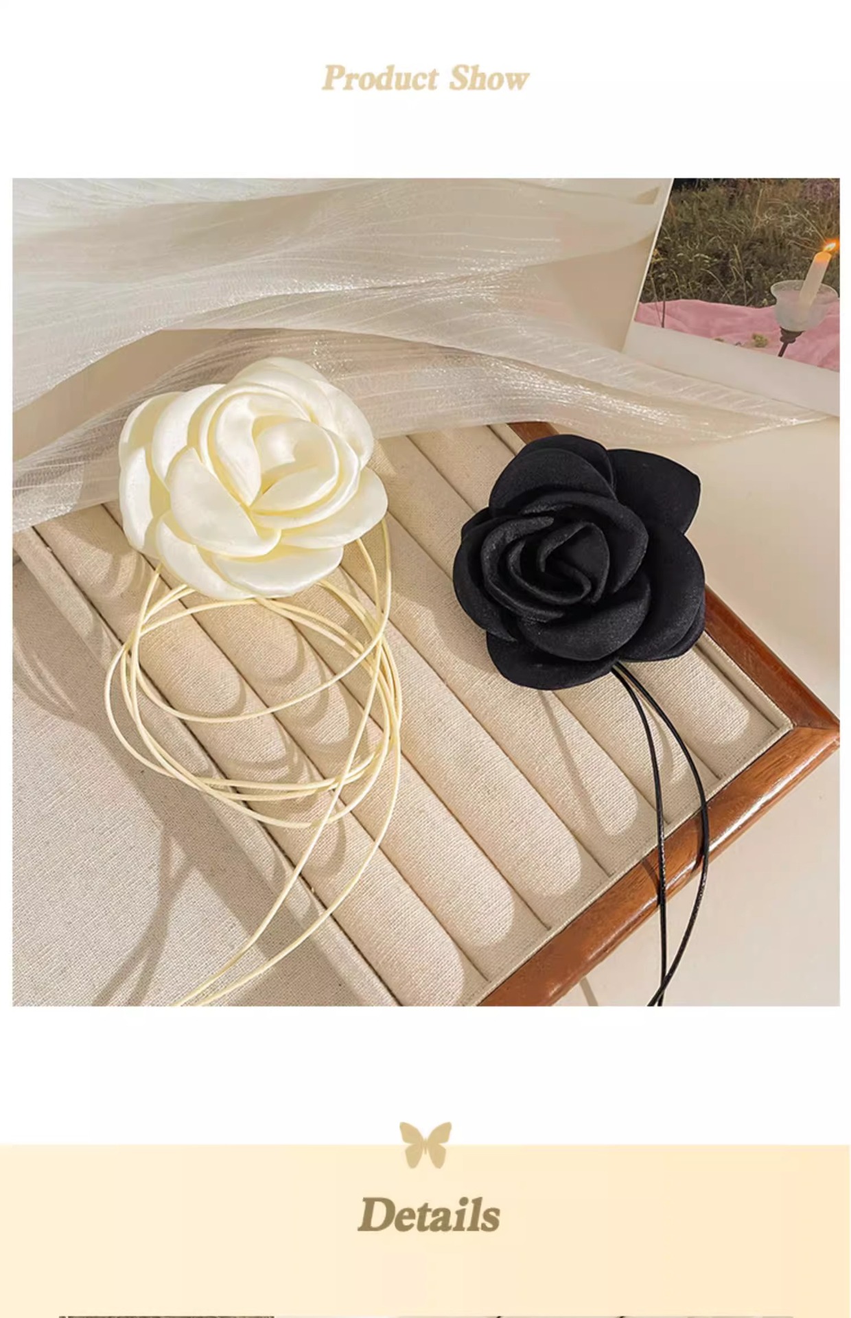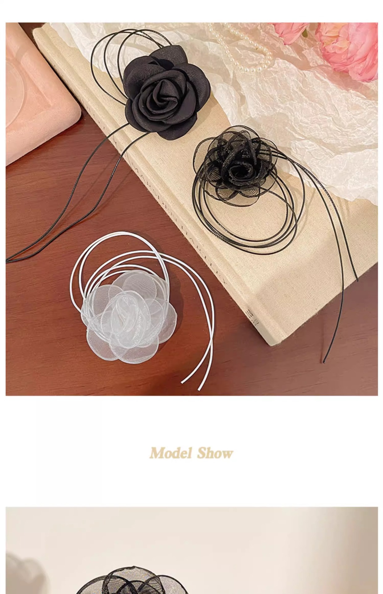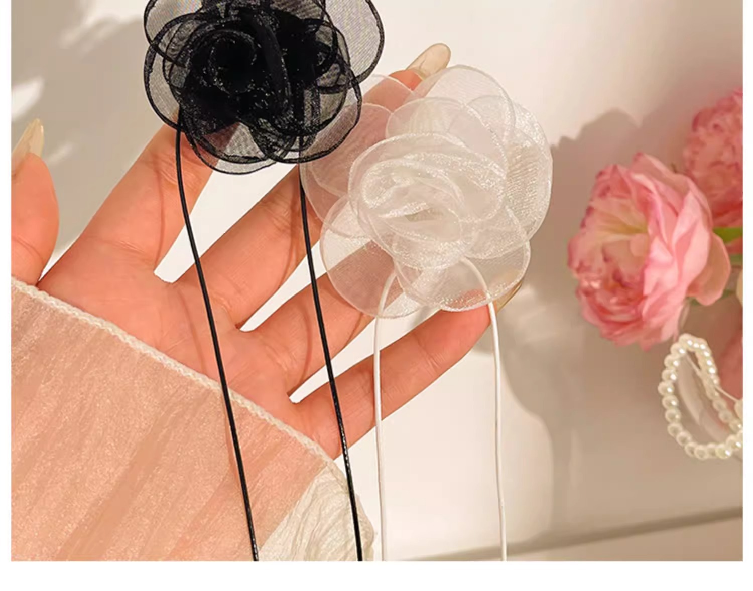 | Color | 1 flor de tela negra. , 2 flores de malla negra. , 3 flores de tela blanca de arroz. , 4 flores de malla blanca. |